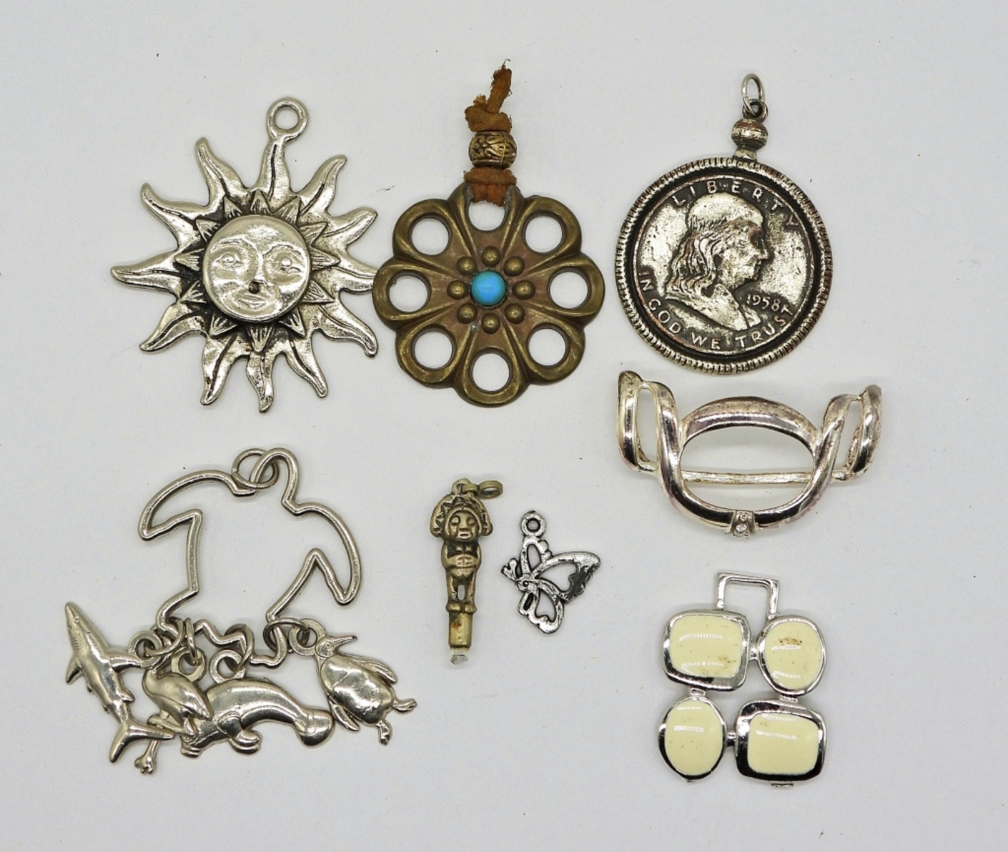 Eight Silver Tone Pendants, Various Sizes and Styles.