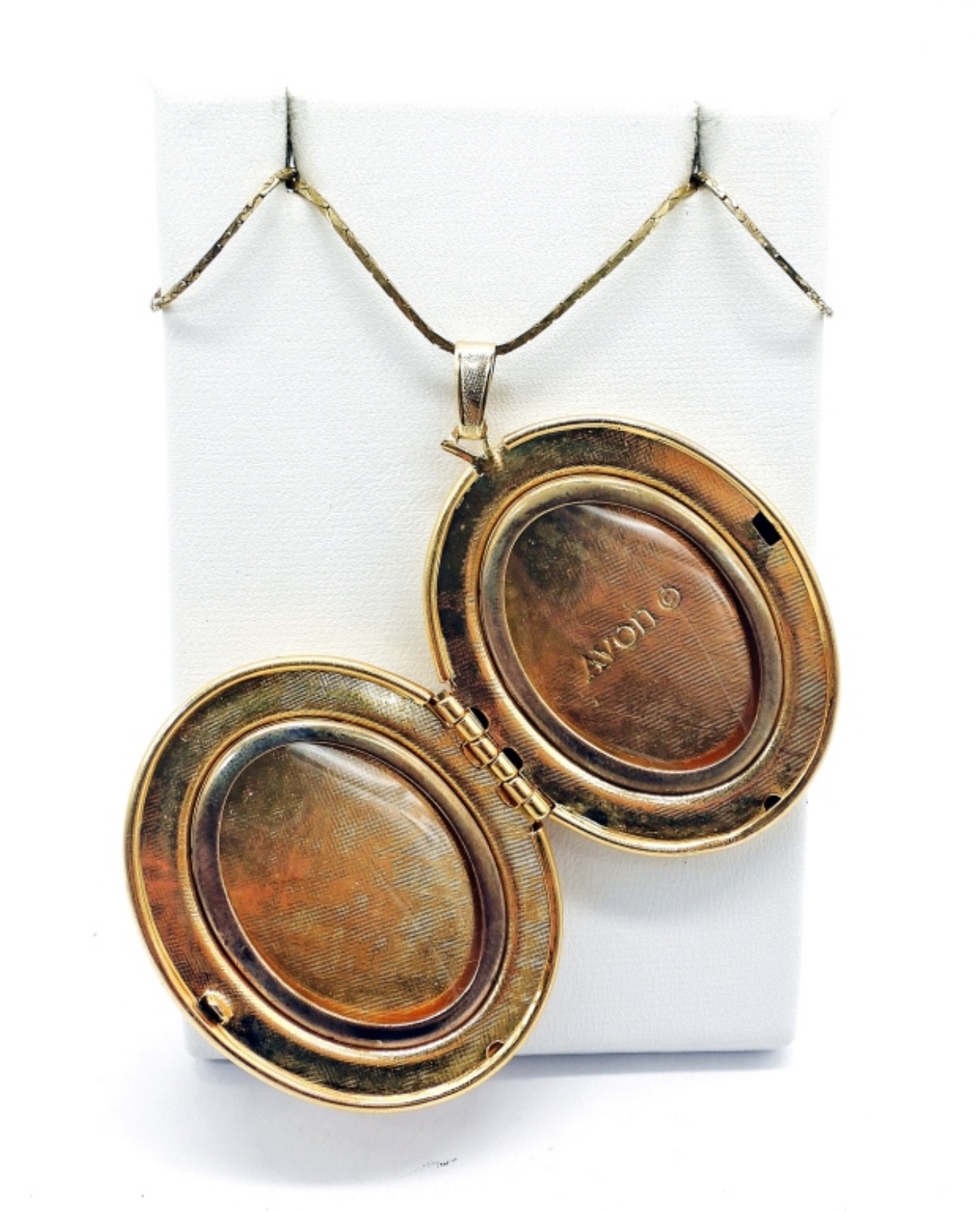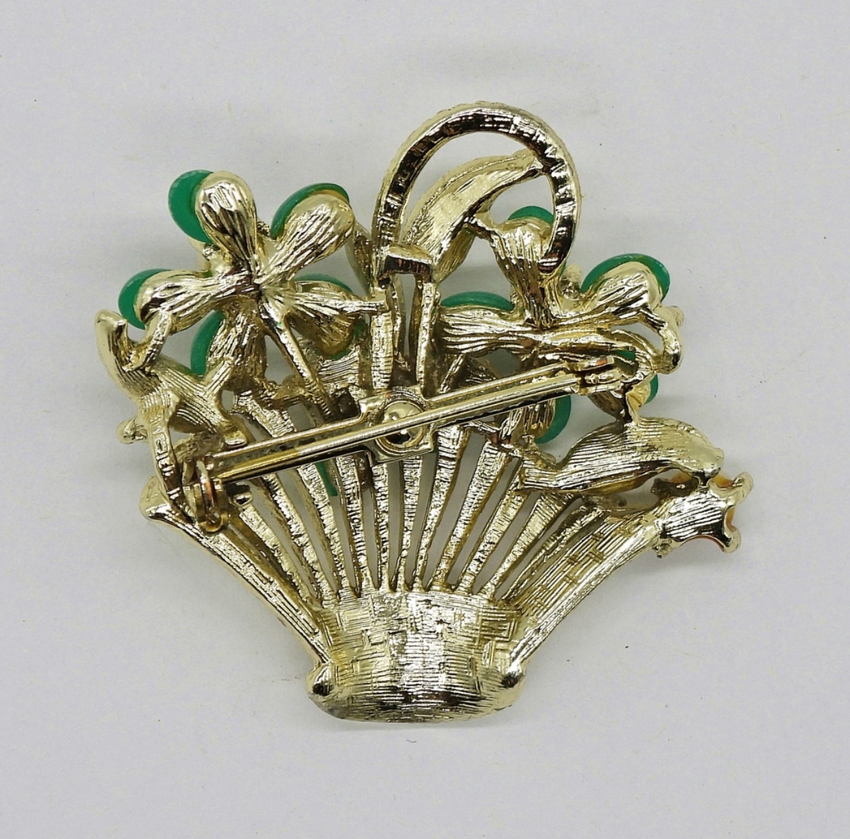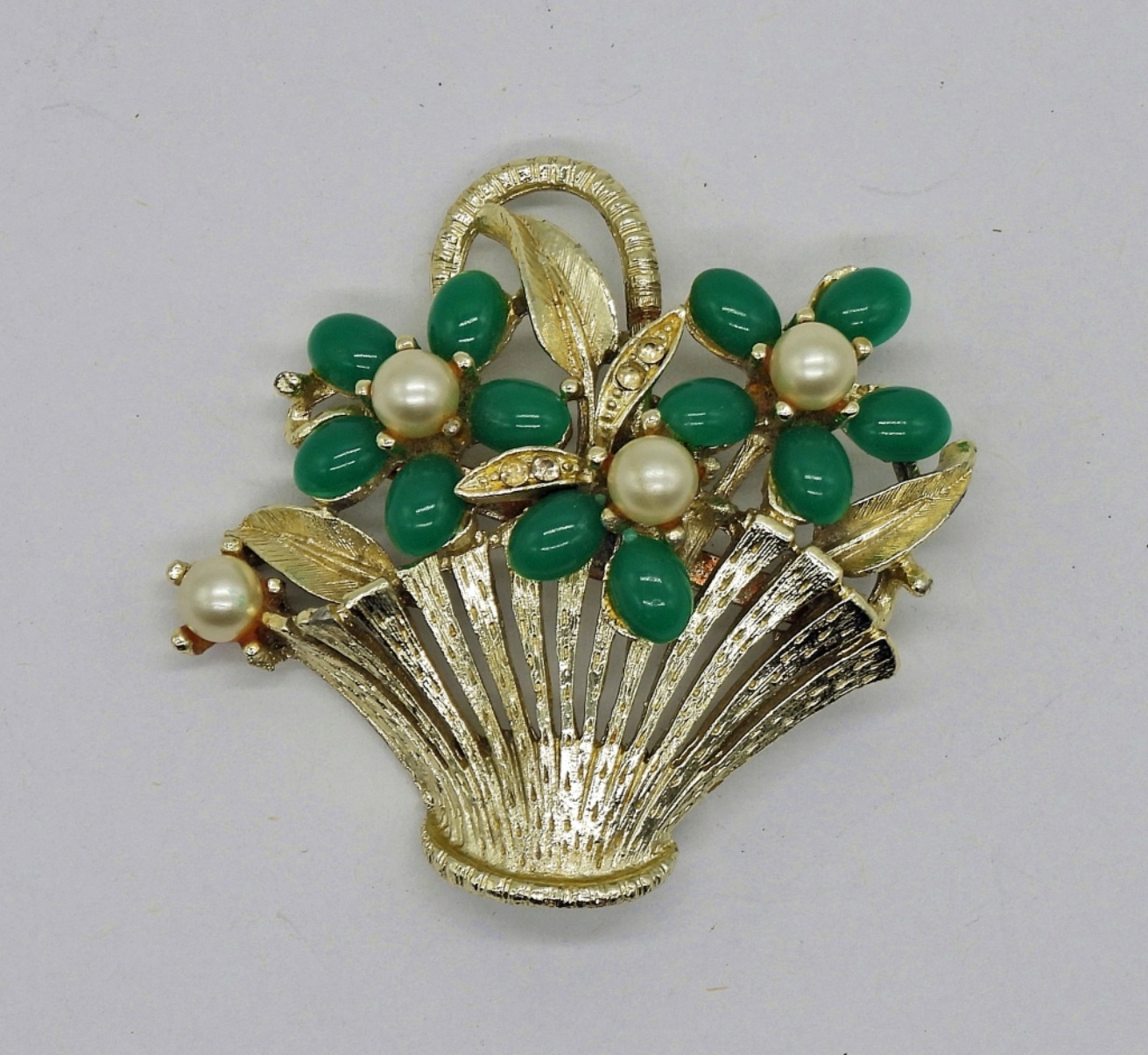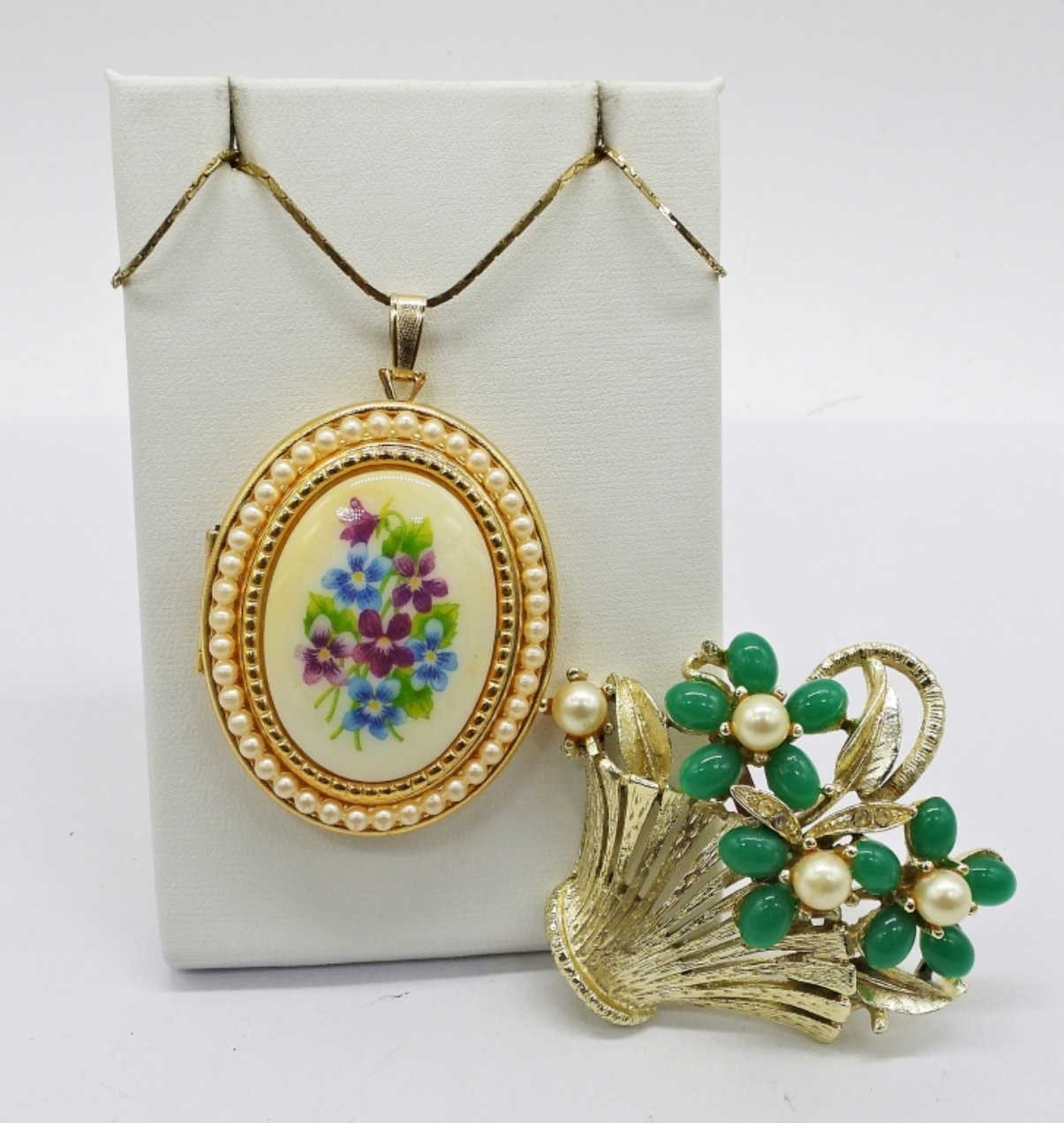 Vintage Gold Tone AVON Locket with Faux Pearls and 17″ Chain. Gold Tone Flower Basket Brooch with Gemstones.