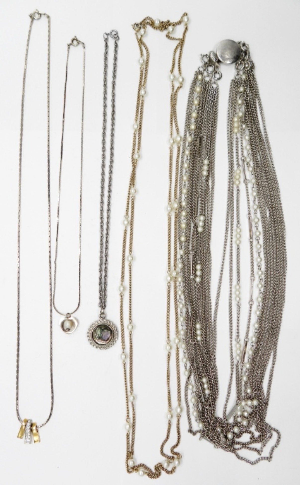 Five Vintage Silver Tone Necklaces. Three Strand, Removable Necklace with chains and faux pearls, 20″. 58″ Silver Tone Chain with Faux Pearls. Abalone Shell Pendant on a Silver Tone Chain, 16″. Silver Tone Heart