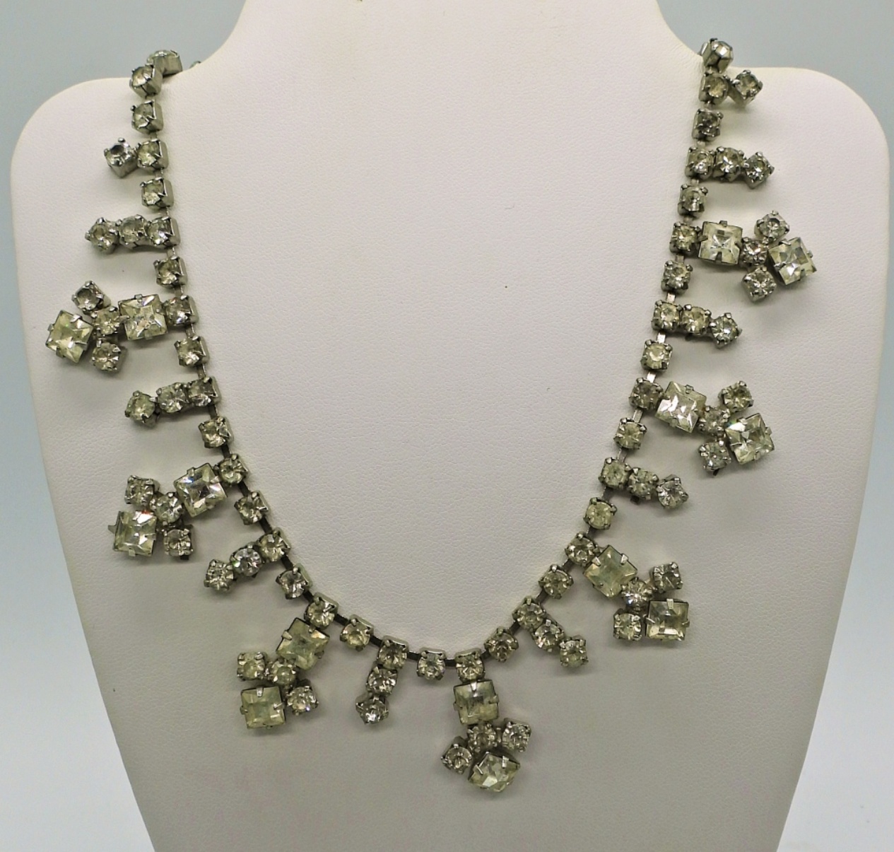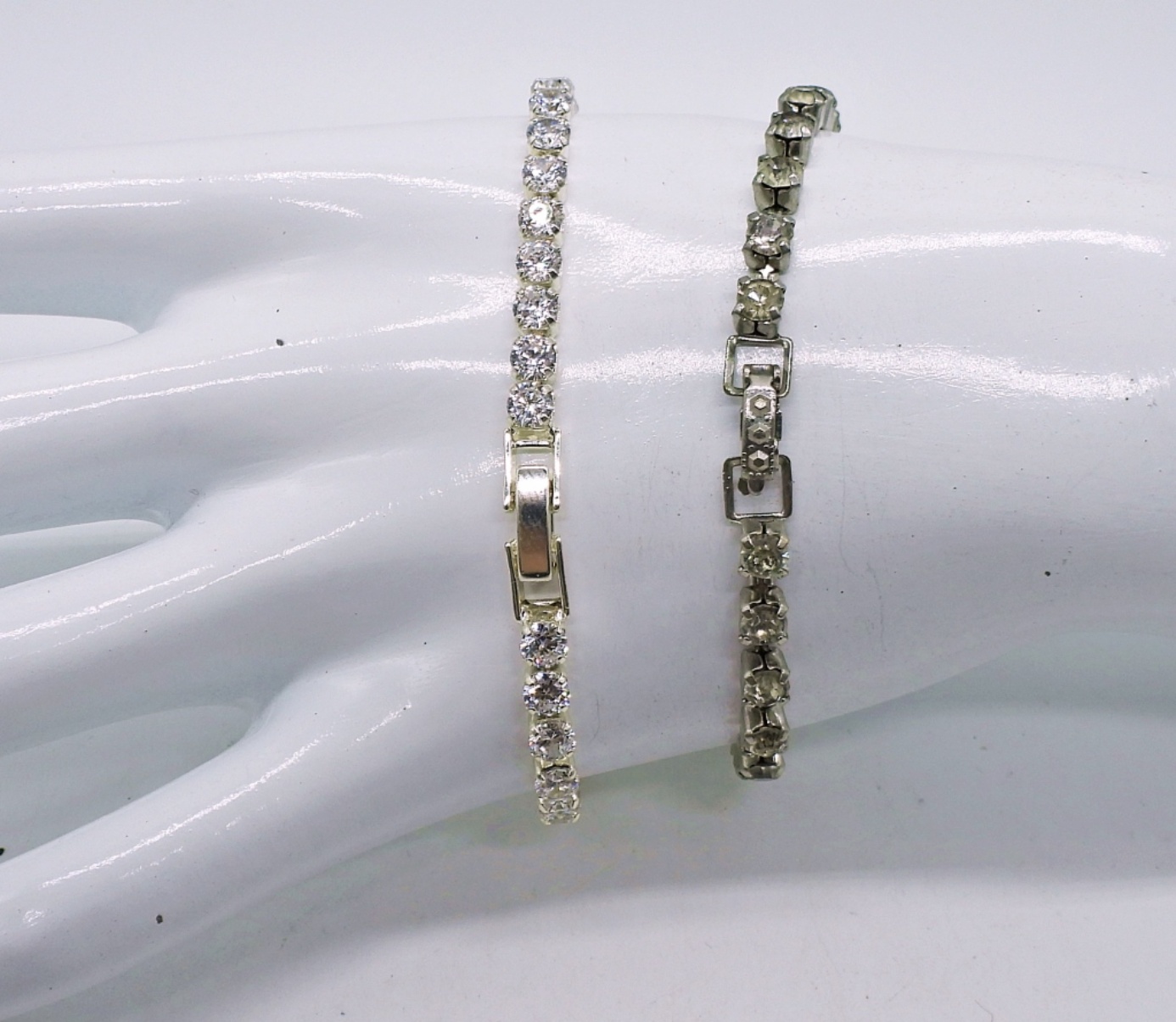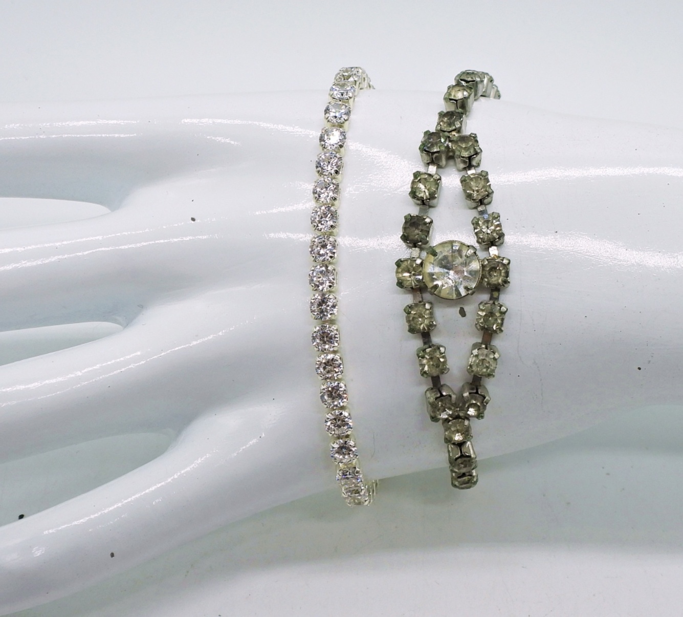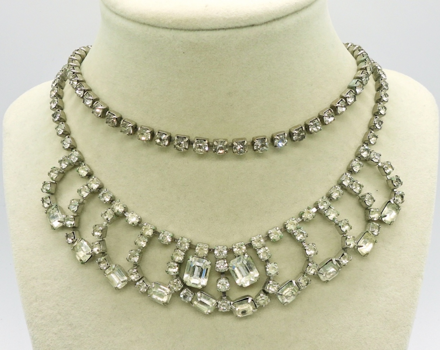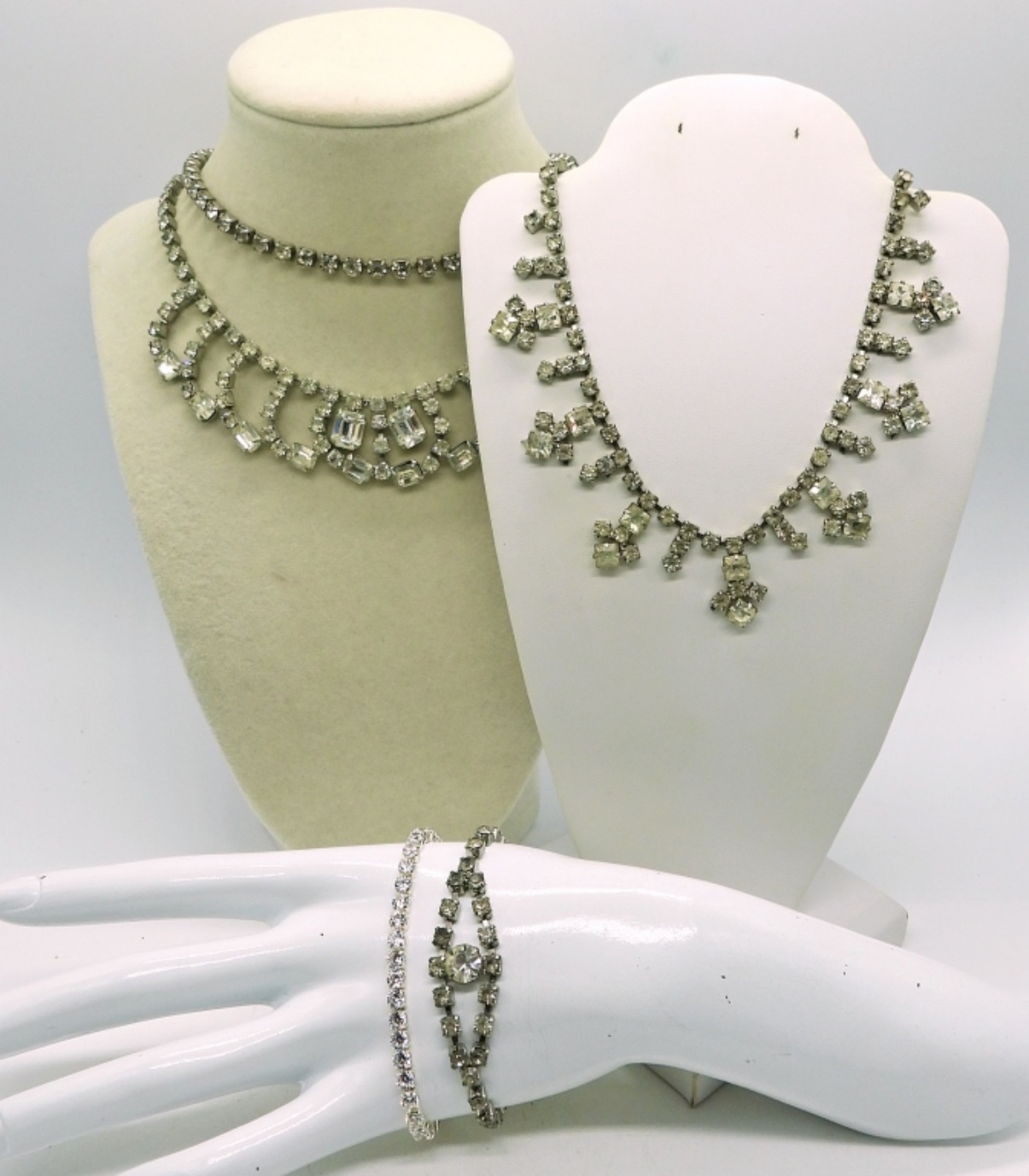 Vintage Silver tone Rhinestone Necklaces, 14 & 15″. Two Vintage Rhinestone Bracelets, 7 & 8″.