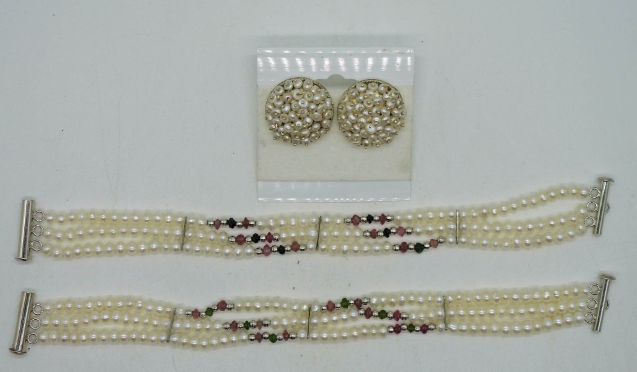 Two Seed Pearl Bracelets with natural gemstone beads and sterling clasps, 8″. One pair of seed pearl earrings in a silver tone setting.