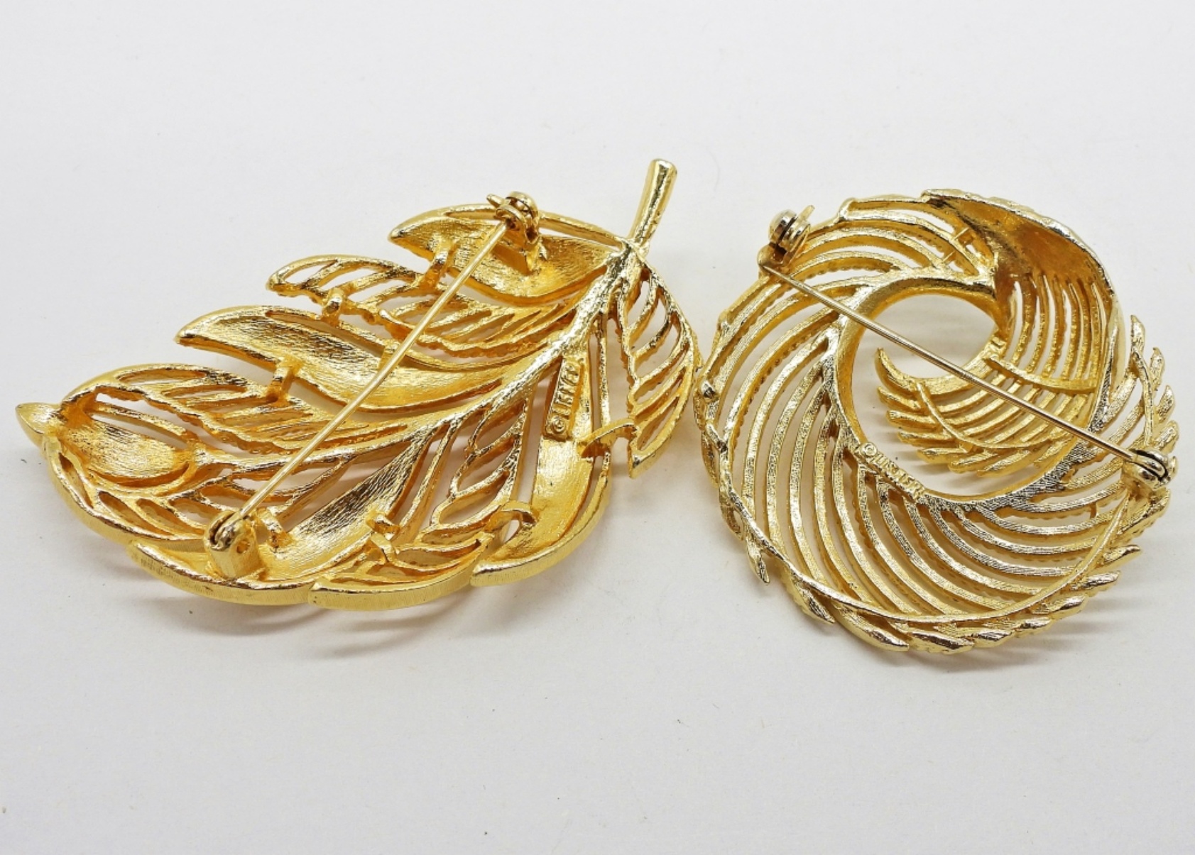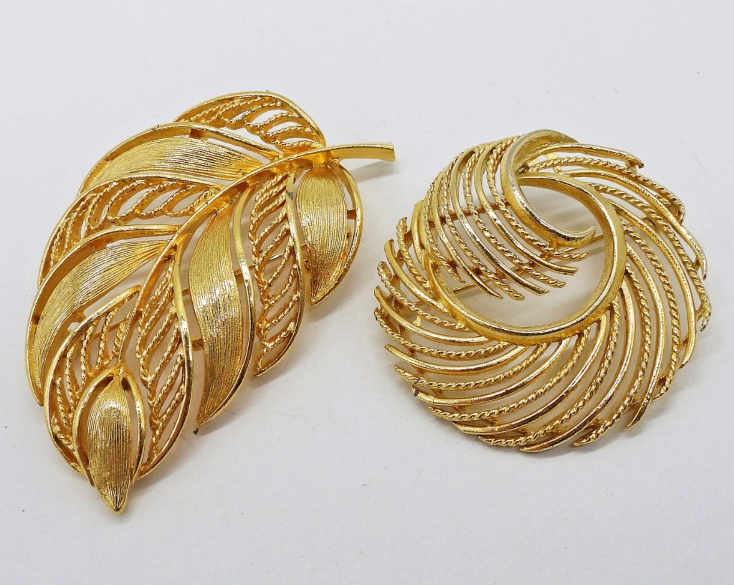 Two Gold Tone Lisner Brand Vintage Brooches. Leaf 3″x 2.5″. Round Brooch is 2″.