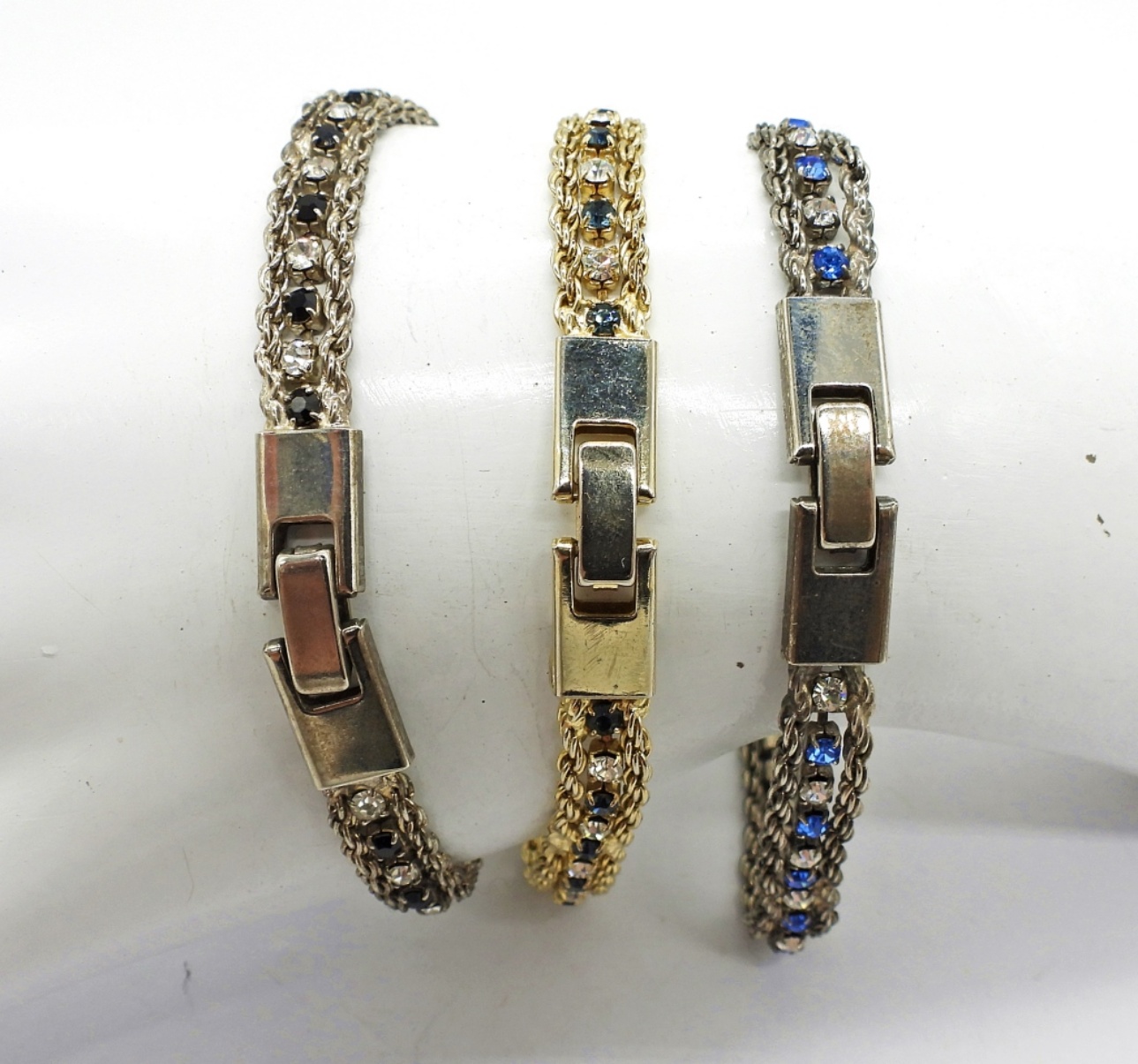 Three Bracelets with Blue, Black and White Gemstones. 7″ Two Silver Tone, One Gold Tone.