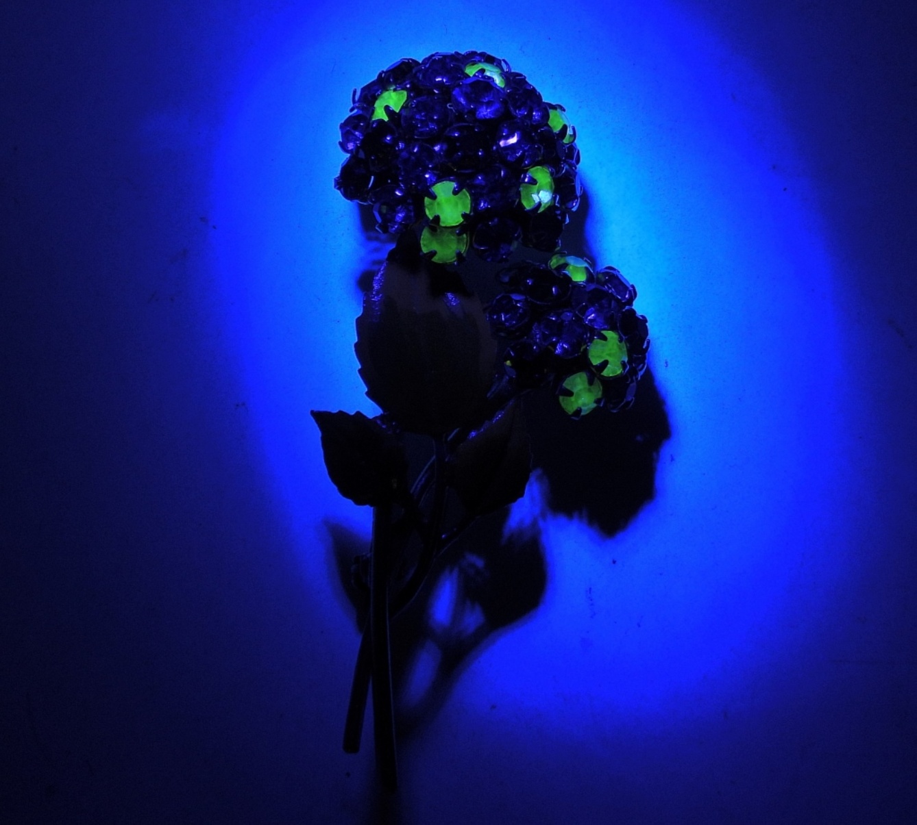 Three Vintage Gold Tone Brooches with Rhinestones, Gemstones and Painted. Blue & Green Bouquet has several Uranium Glass Rhinestones. See Photos!