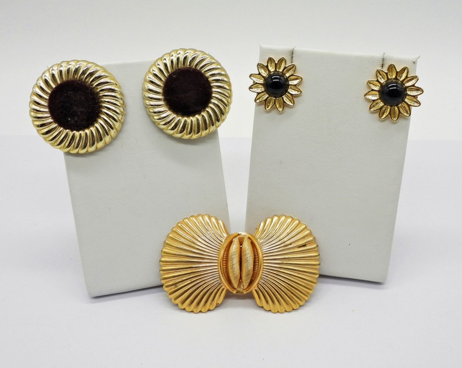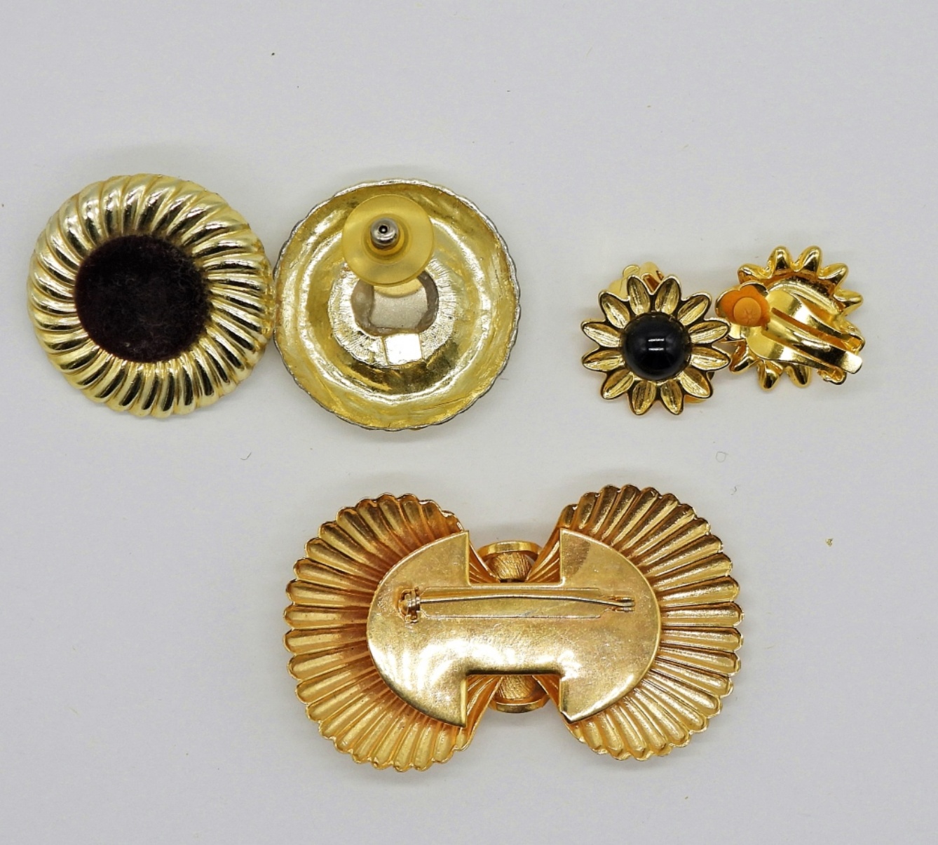 Two Pair of Vintage Gold Tone Clip On & Pierced Earrings. Gold Tone Vintage Brooch, 2.5″x1.5″.
