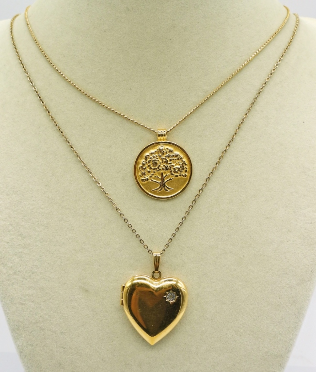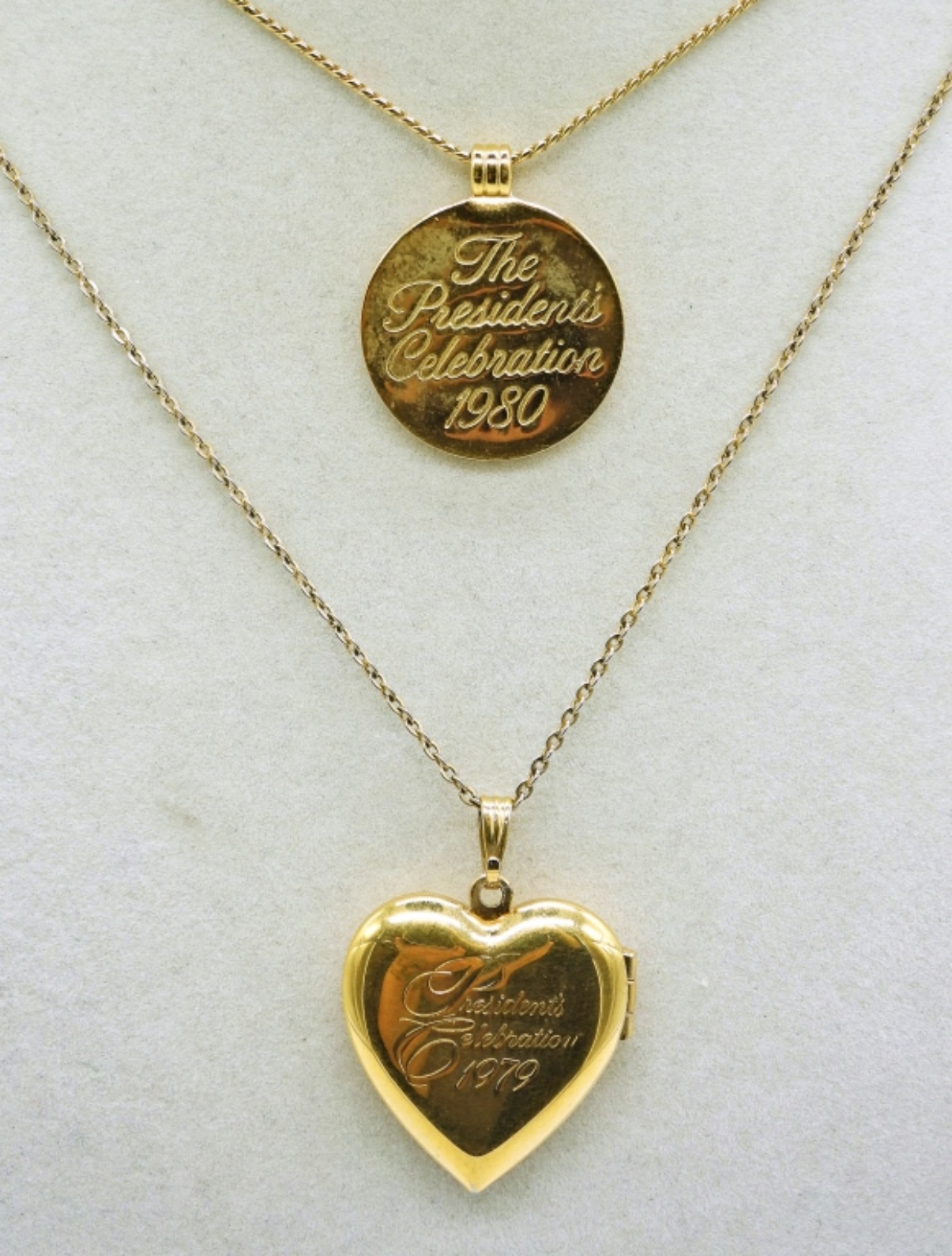 Two Gold Tone Necklaces with 18″ & 24″ Chains. Heart Locked Engraved with “Presidents Celebration 1979” and Circle is Engraved with “The Presidents Celebration 1980”.