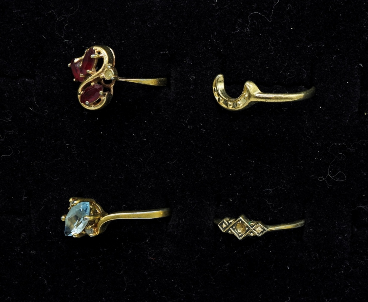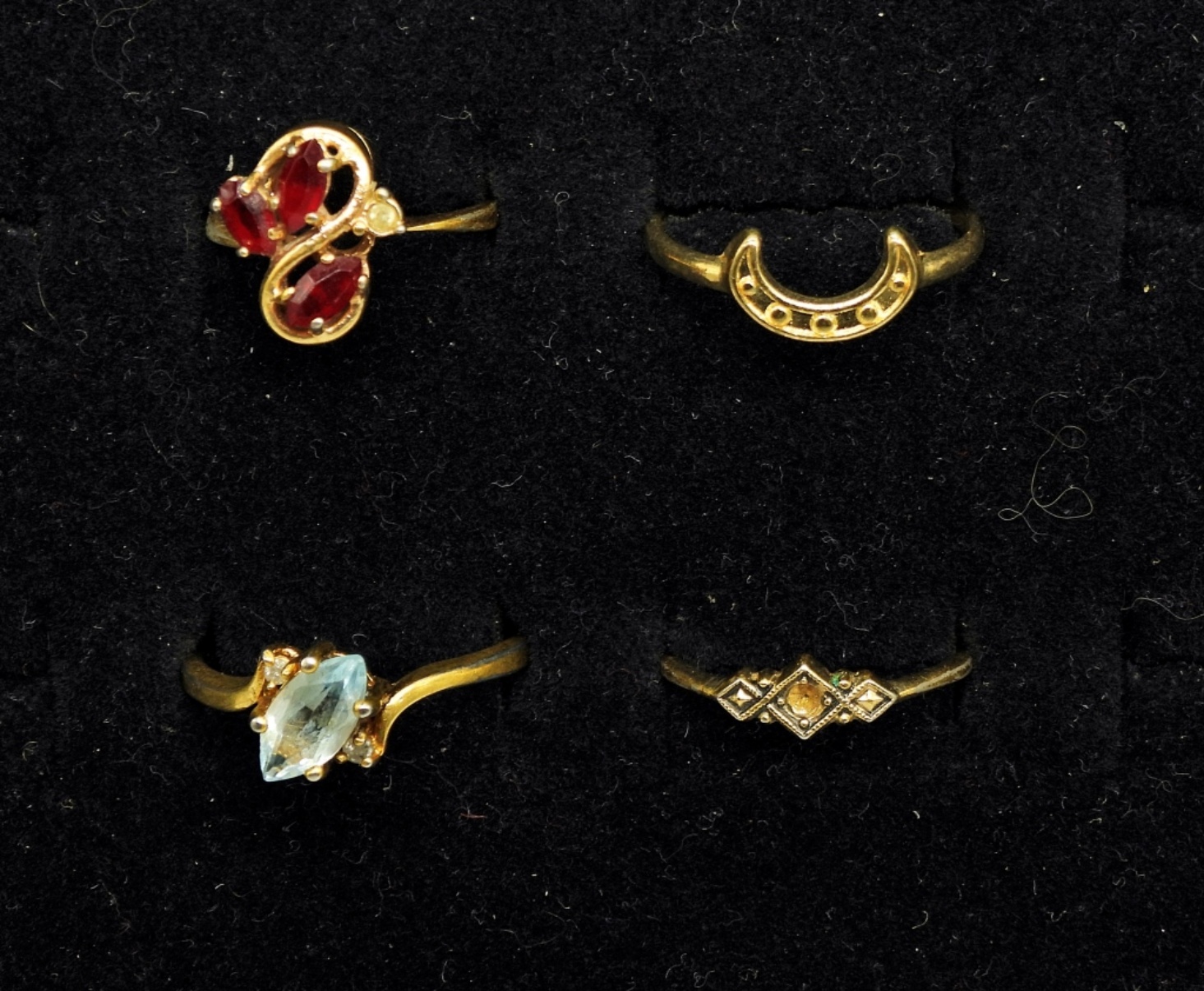 Four Gold Tone Gemstone Rings in sizes 5, 7, 8.5, 10.5