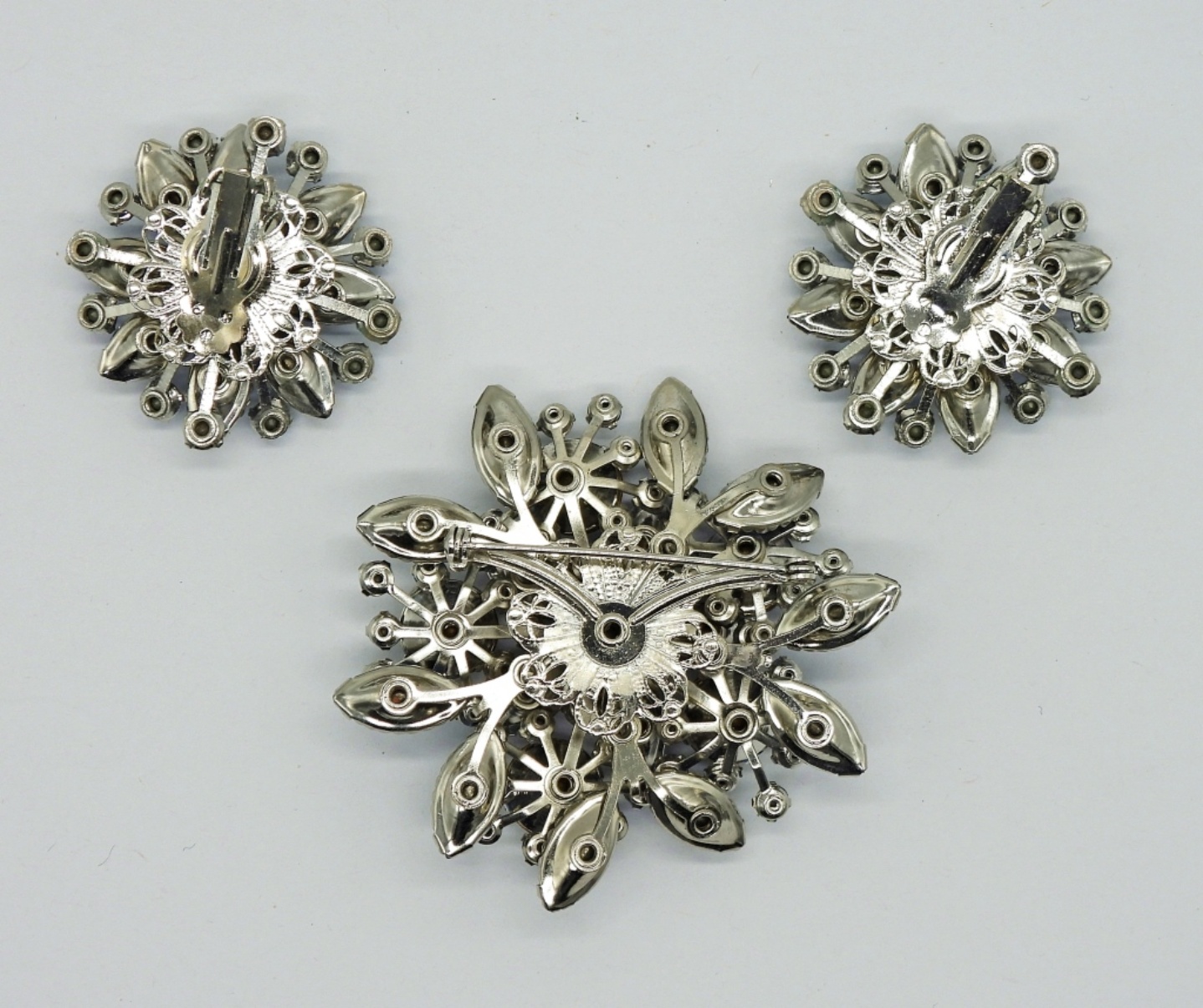 Silver Tone Blue Rhinestone Brooch and Matching Earrings. Brooch is 2.5″, Earrings are 1.5″.