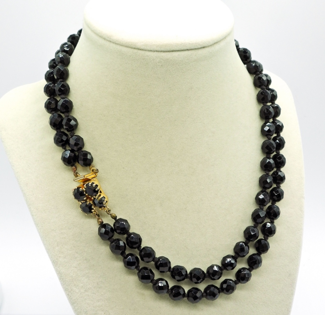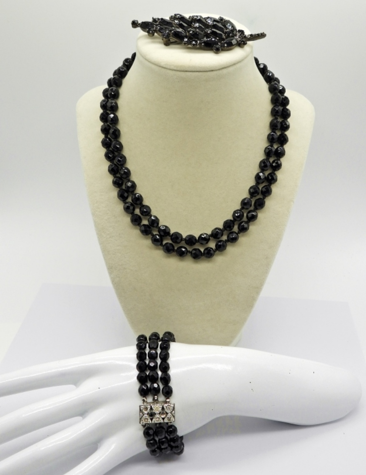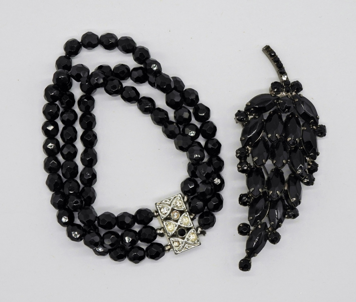 Vintage Black Faceted Glass Beaded Necklace and Bracelet, 16″ & 8″. Black Glass Bead Brooch, Missing One Small Gemstone. Brooch Measures 3.5″z1.5″.