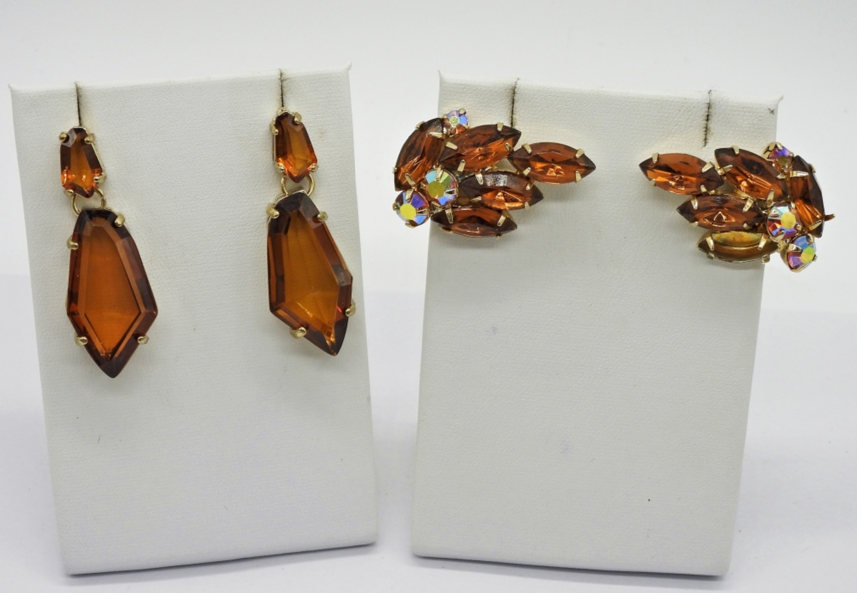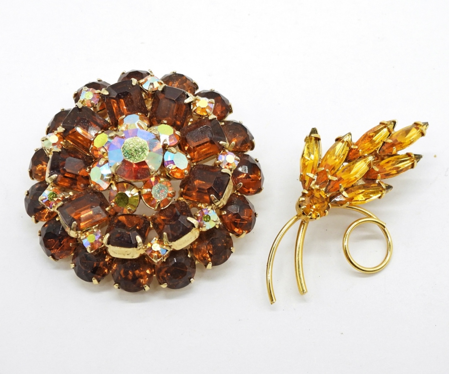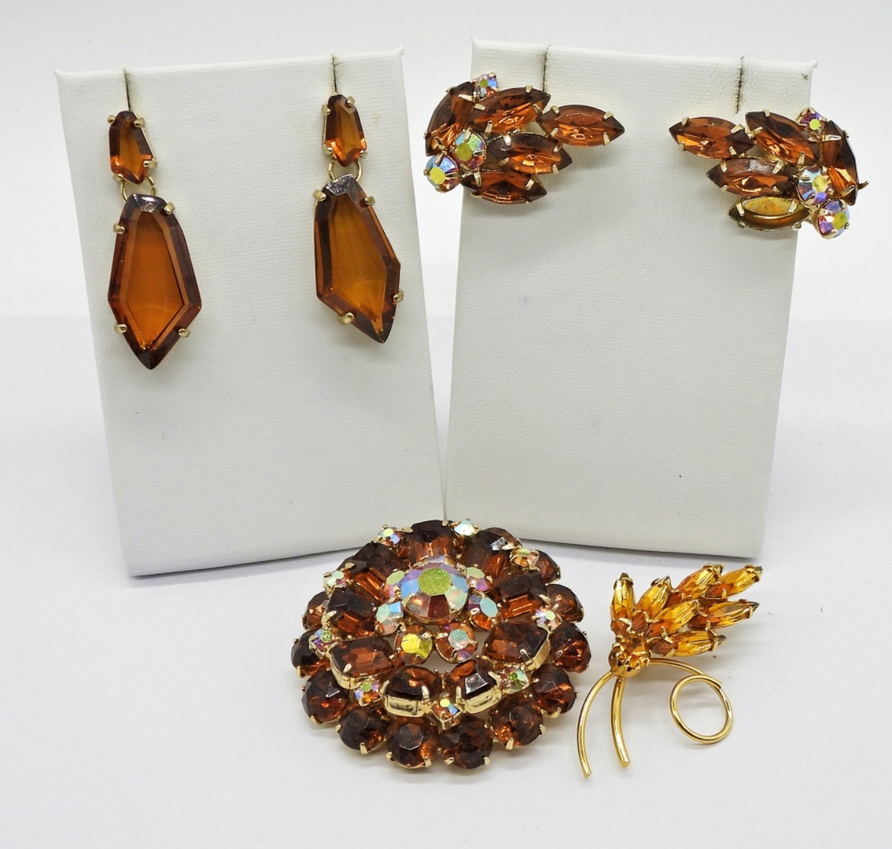 Vintage Gold Tone, Brown & Yellow Rhinestone Jewelry Set. Earrings Missing One Rhinestone. Brooch is 2″.