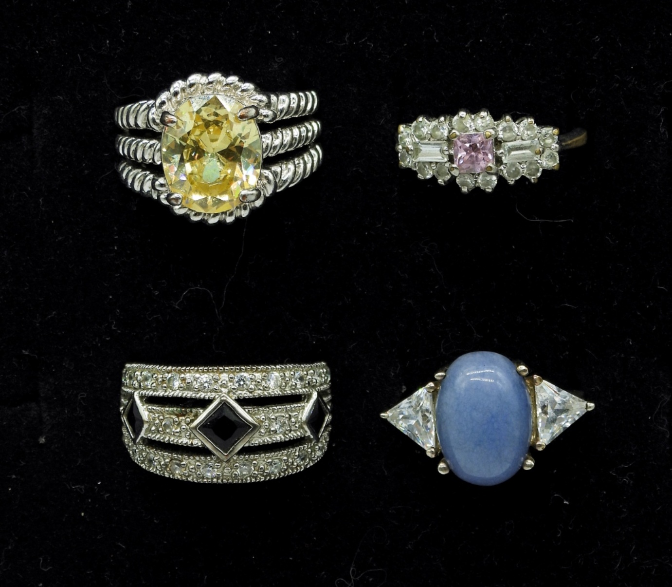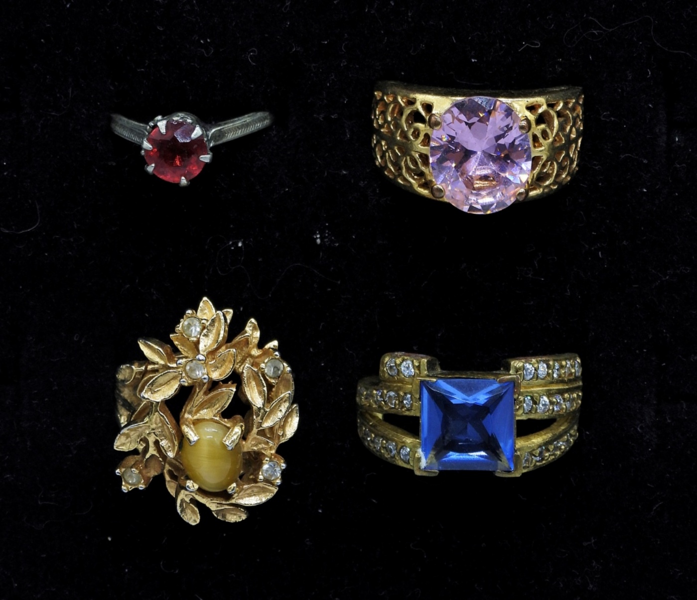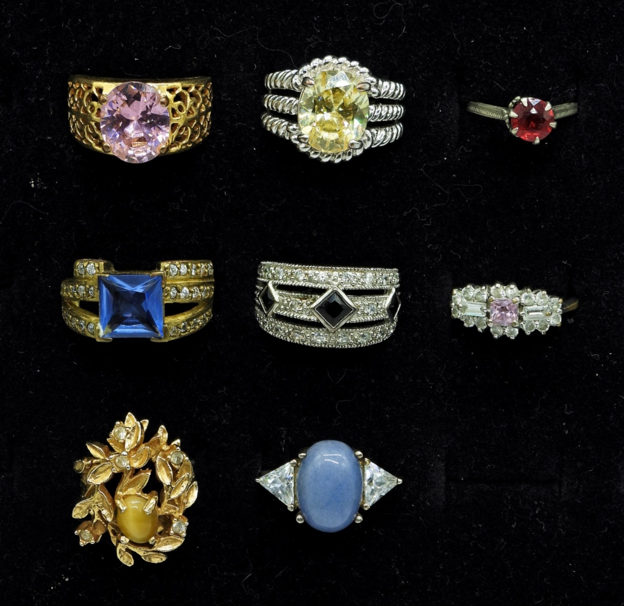 Five Silver Tone Gemstone Rings, Three Gold Tone Gemstone Rings. Sizes 4.5, 5, 6, 6.5, 8.
