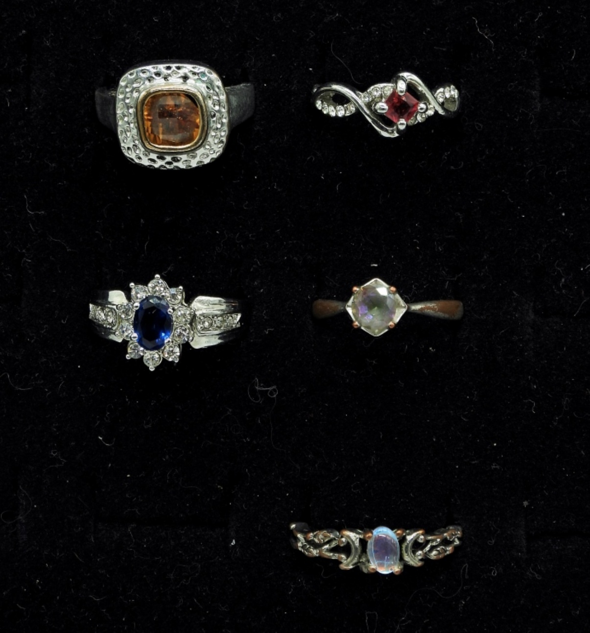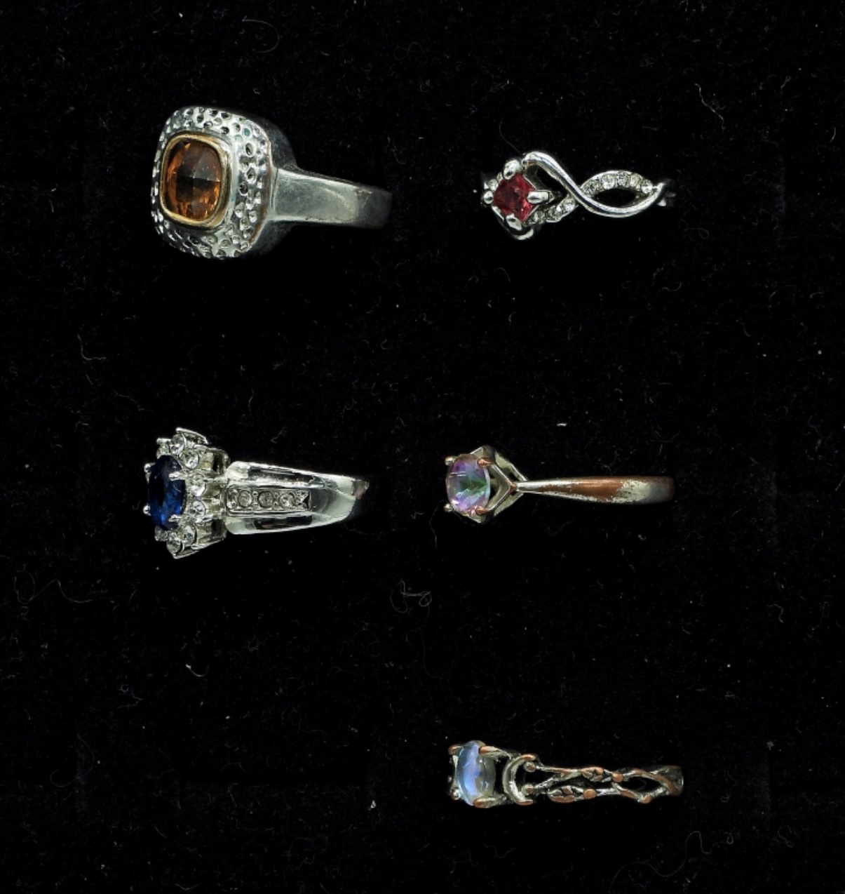 Five Silver Tone Gemstone Rings. Sizes 4.5, 6, 7.5, 8, 8.5