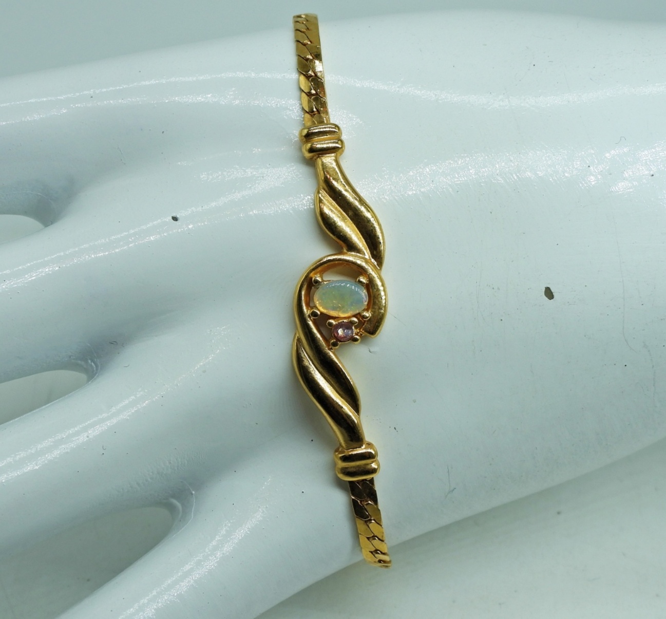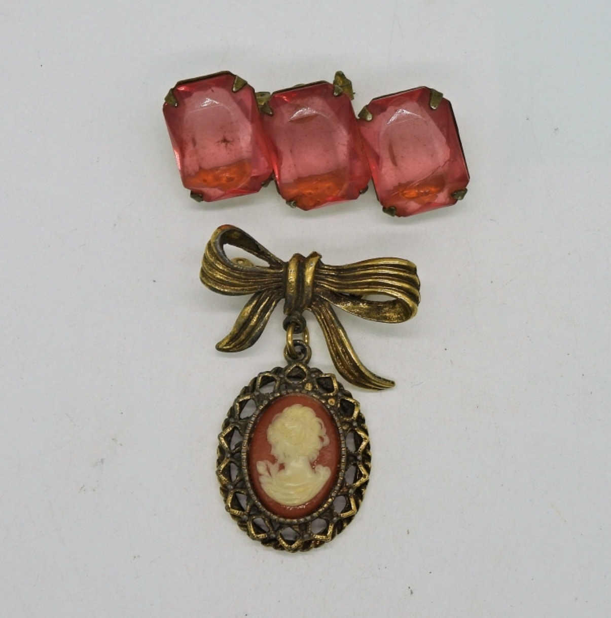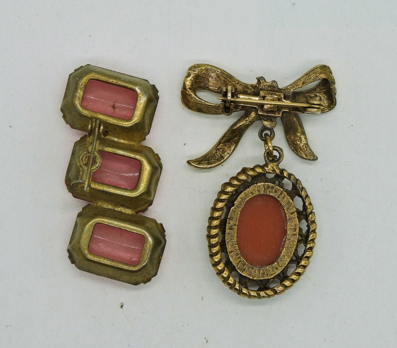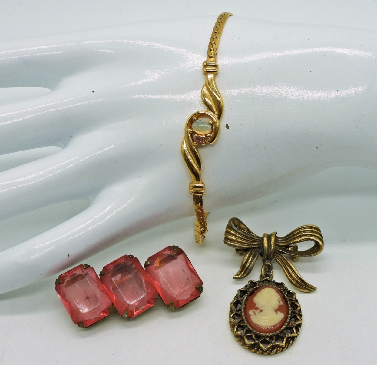 Two Vintage Gold Tone Brooches and a Gold Tone Bracelet, 8″.