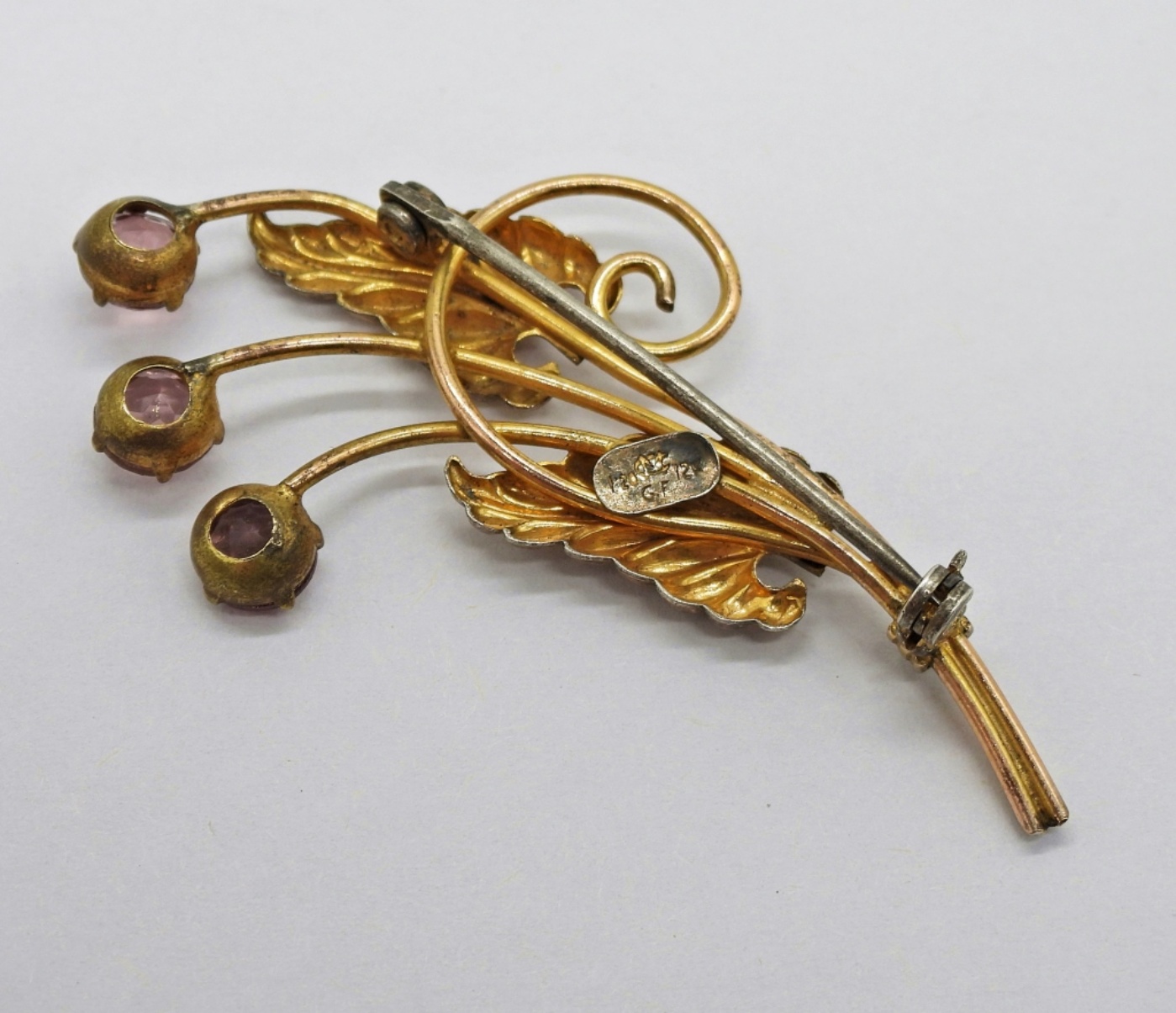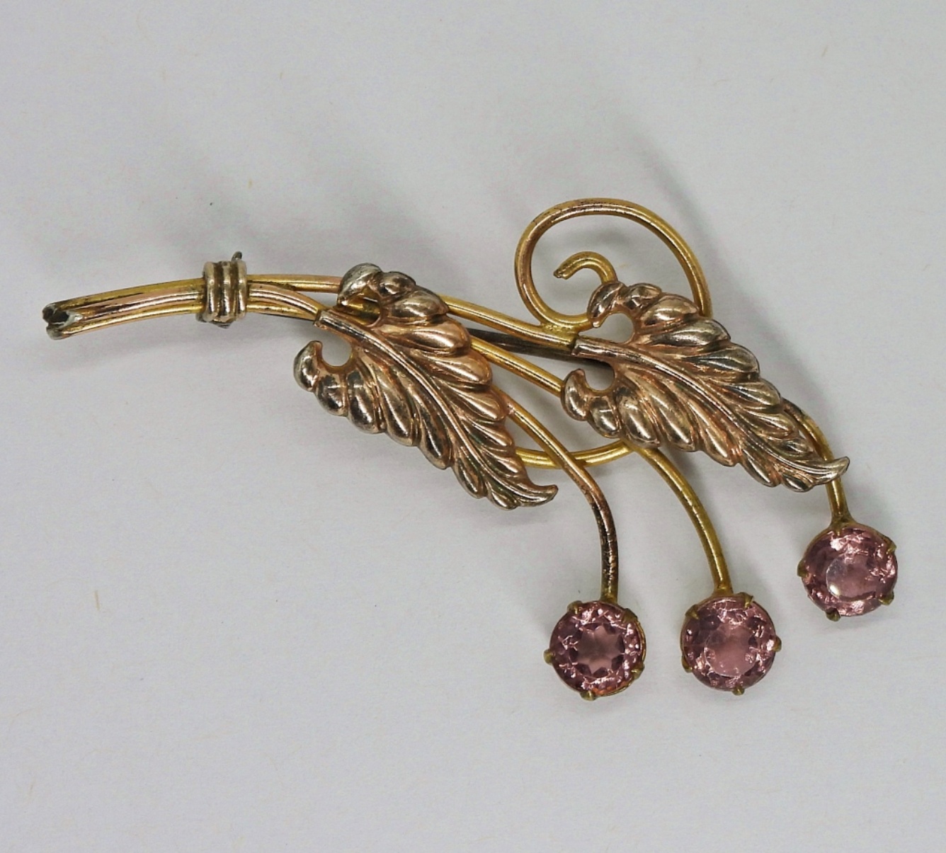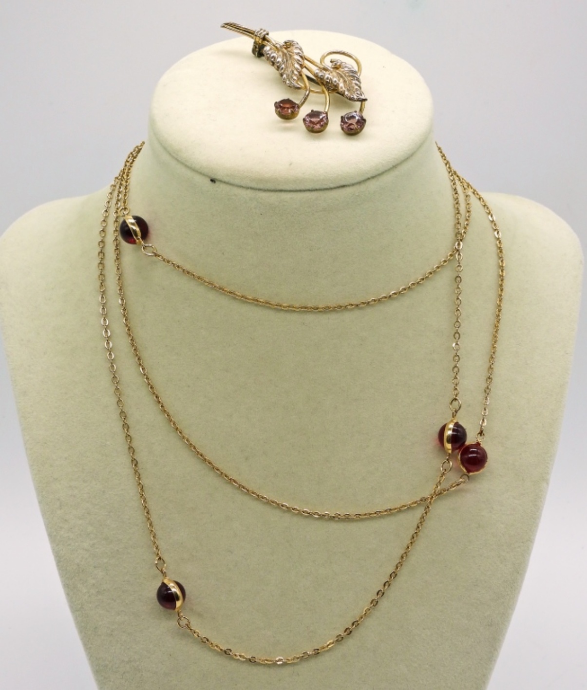 Vintage Gold Tone AVON Necklace, 42″ with Red Beads. Floral Gold Tone Vintage Brooch with Pink Rhinestones.