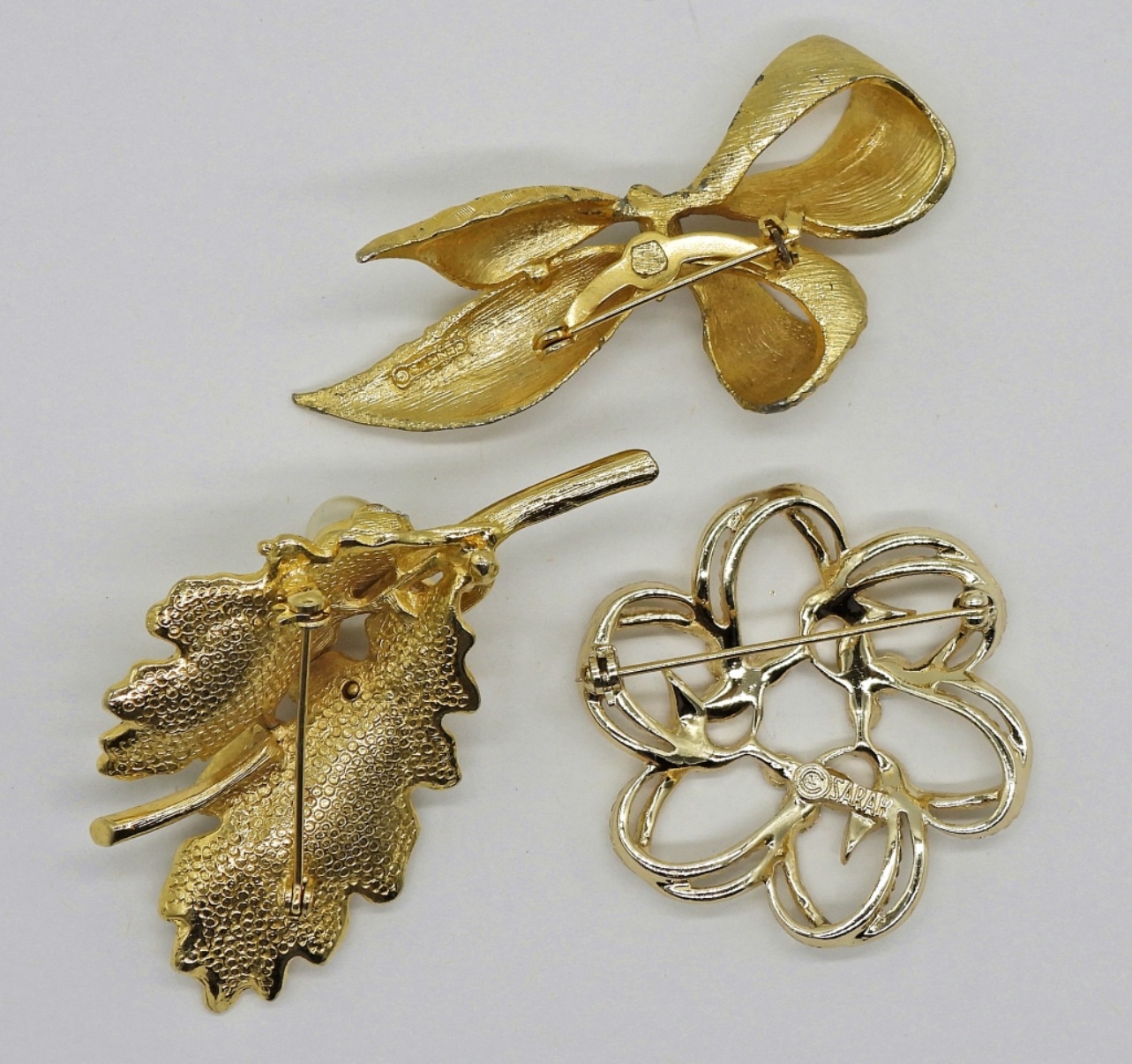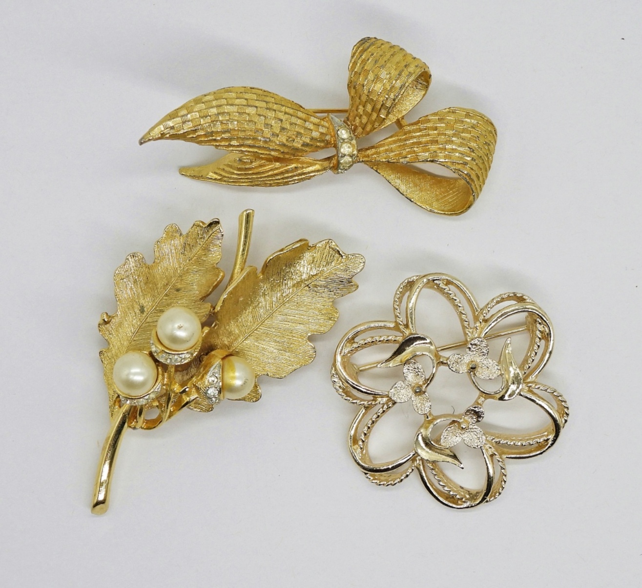 Three Vintage Gold Tone Brooches. One is SARAH COVENTRY.