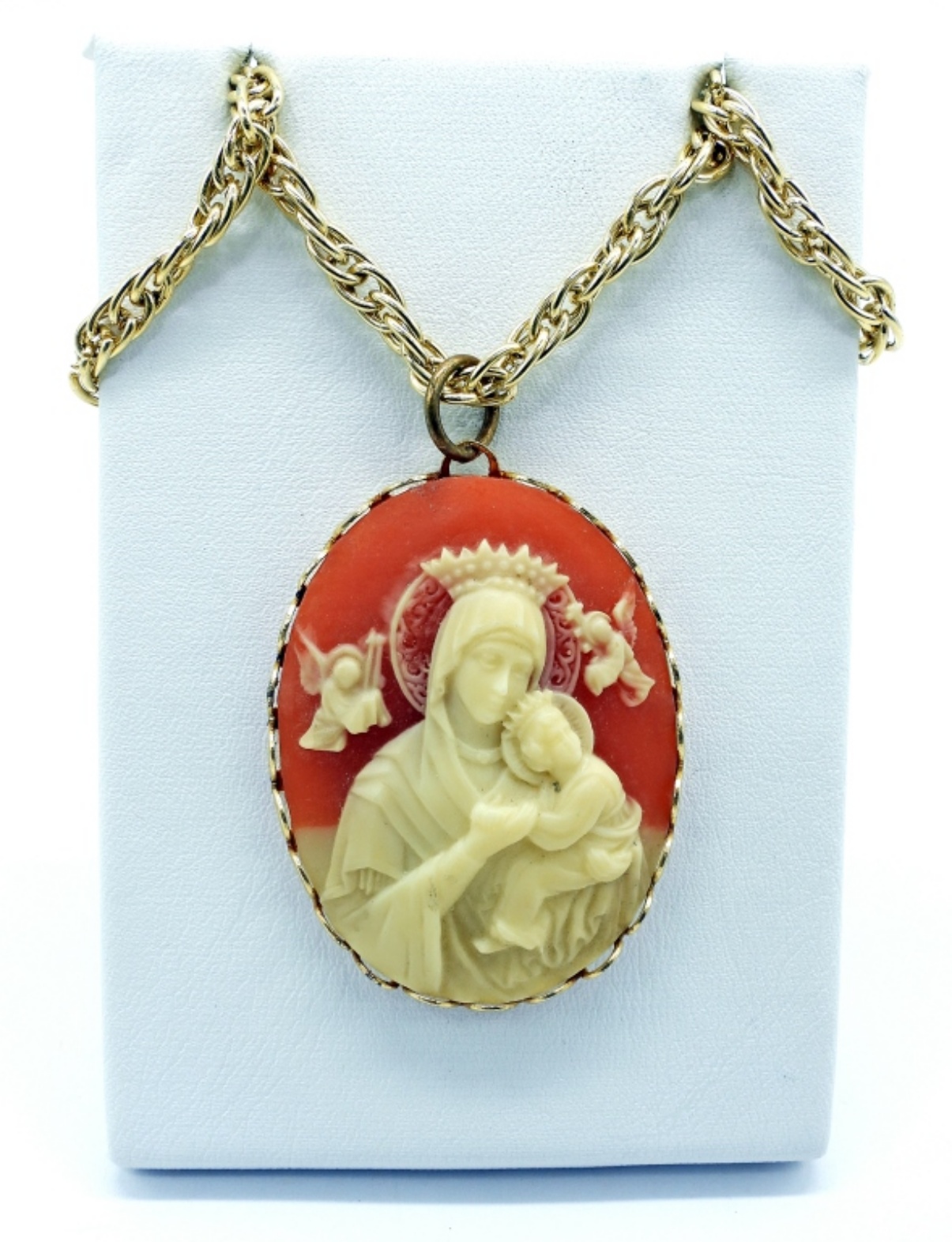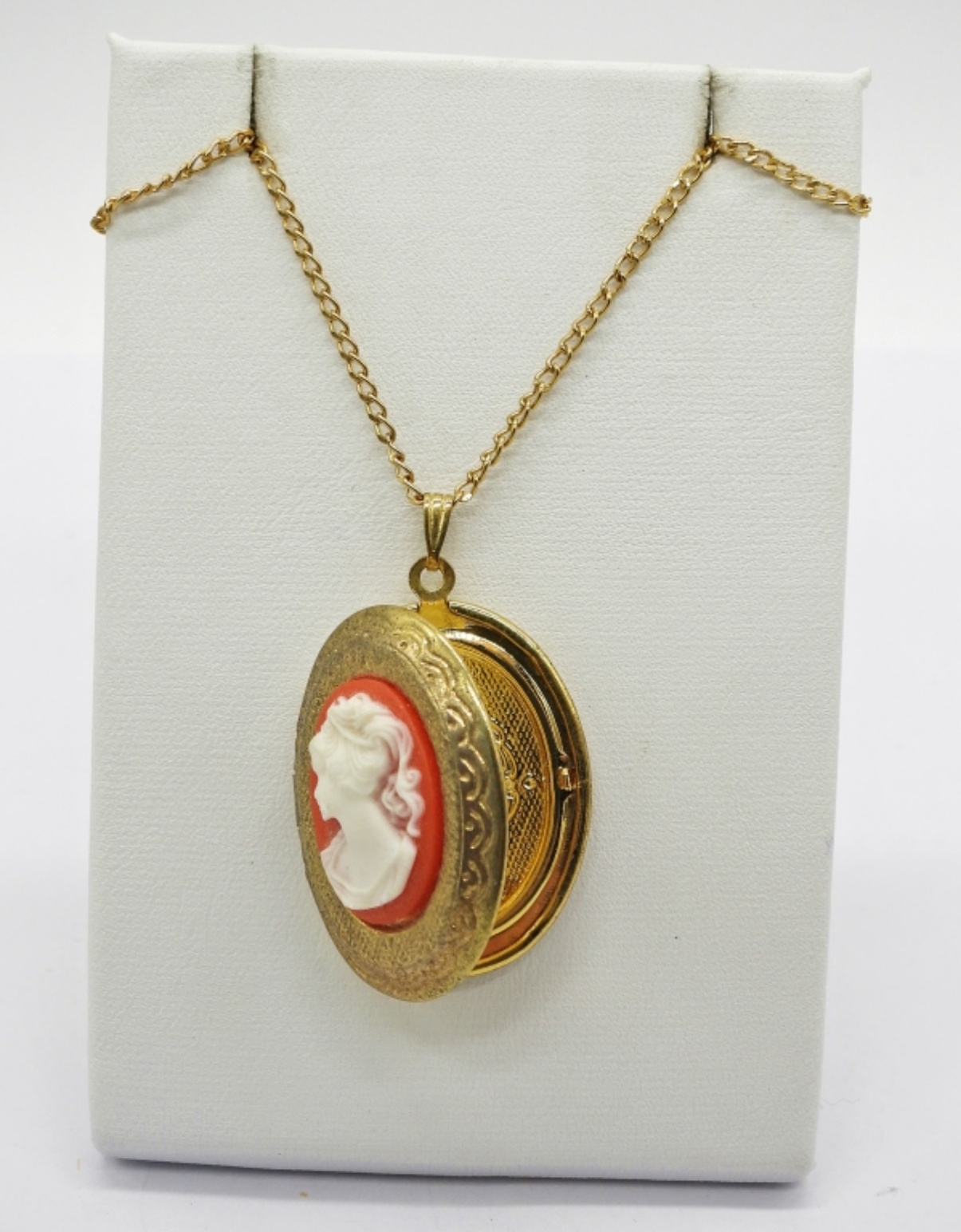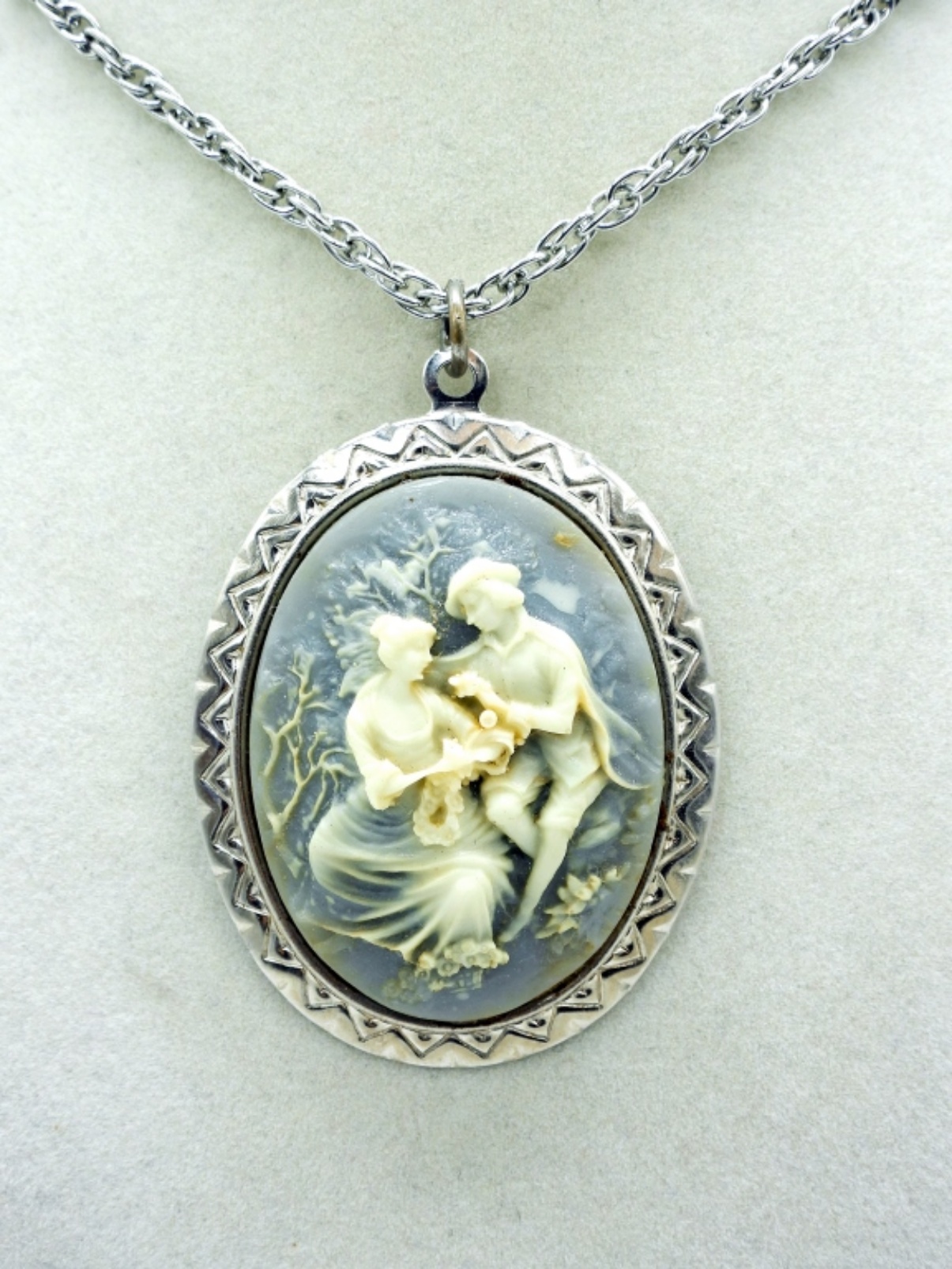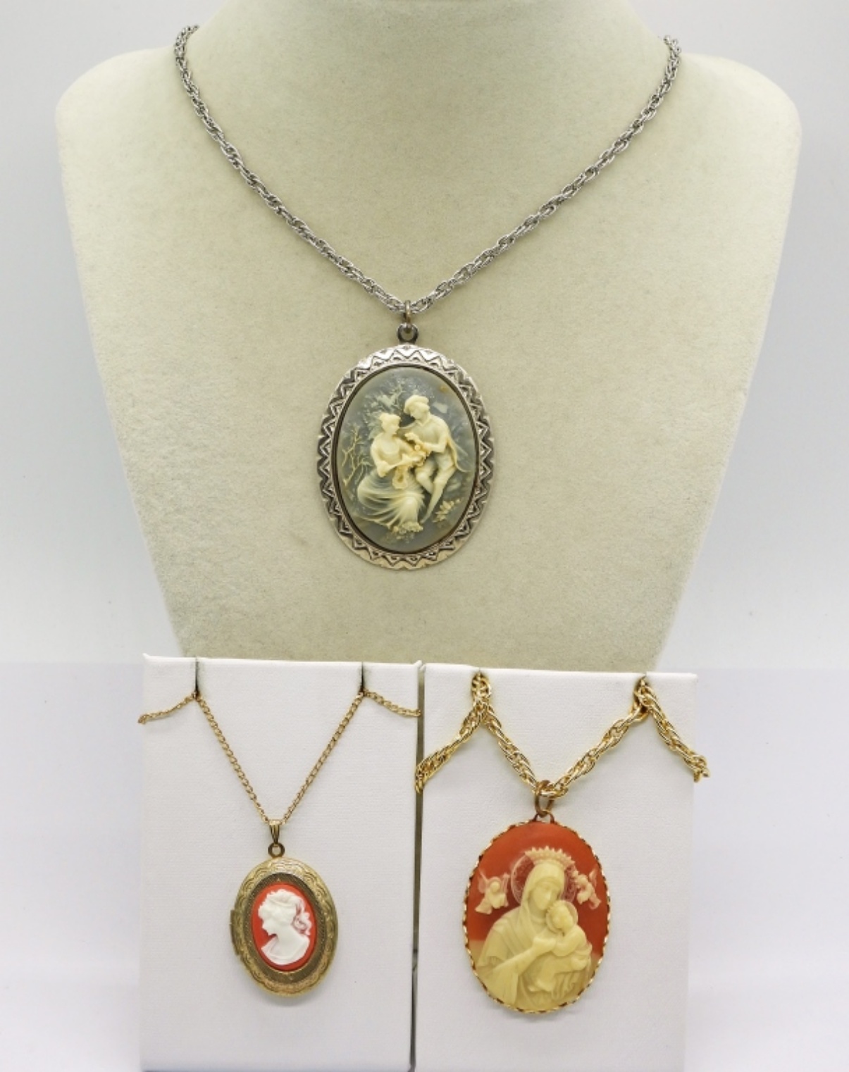 Three Vintage Cameo Necklaces, 2 Gold Tone and 1 Silver Tone. 24″ & 17″