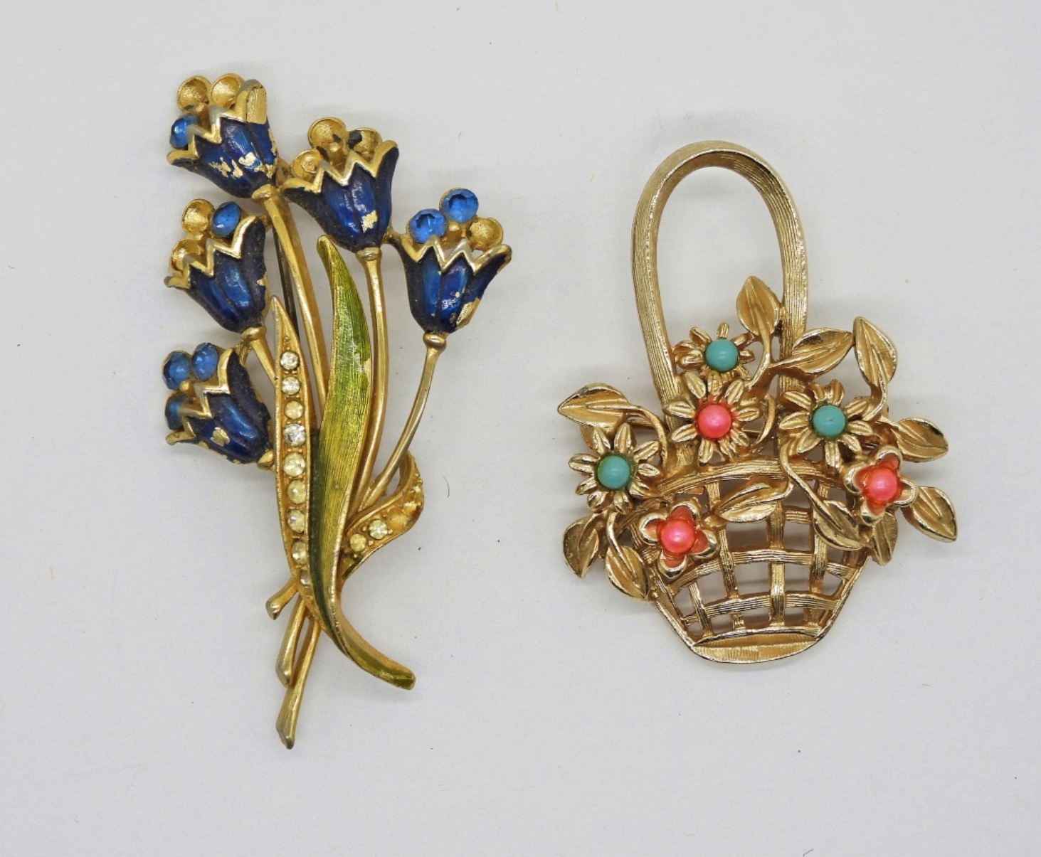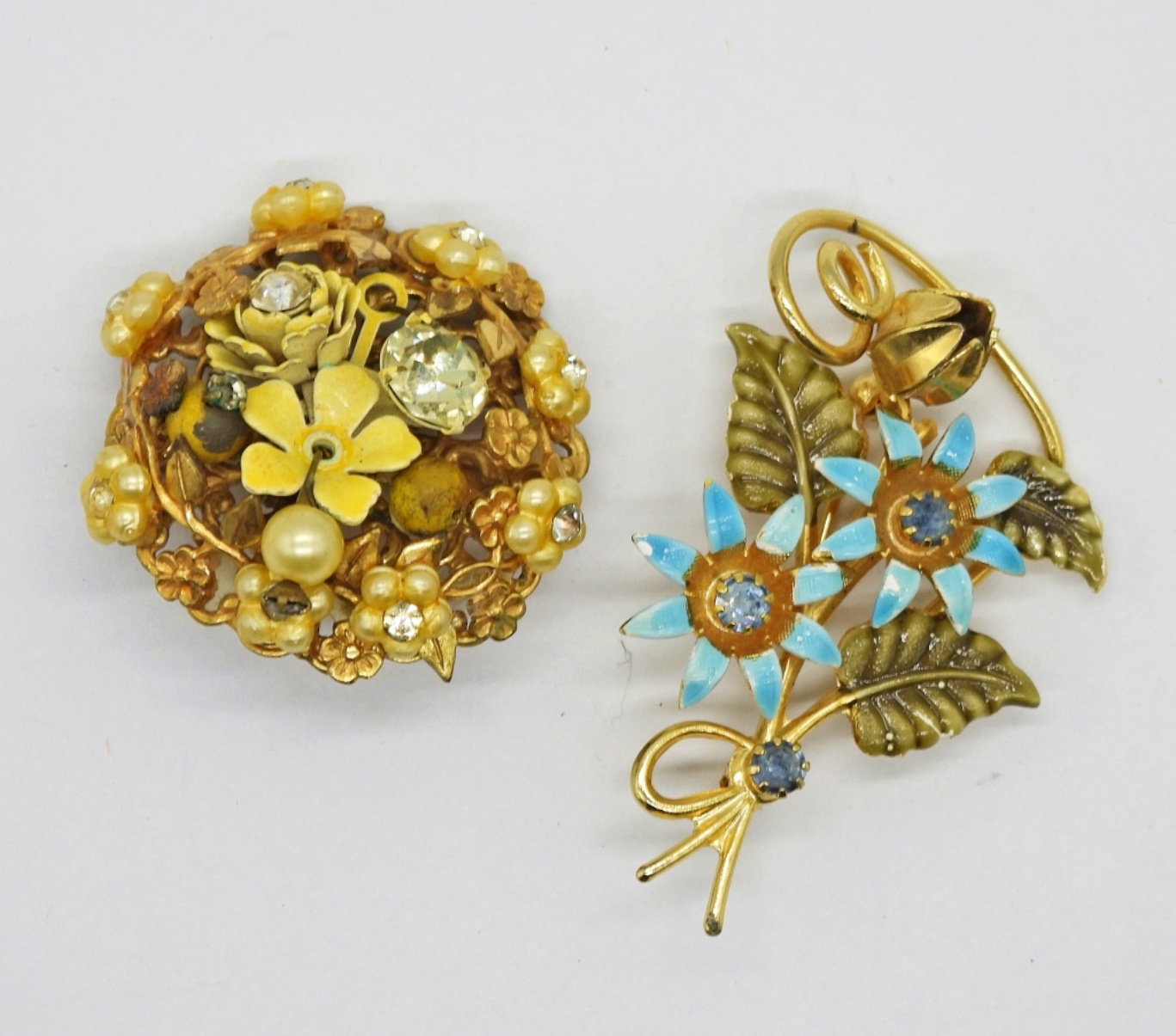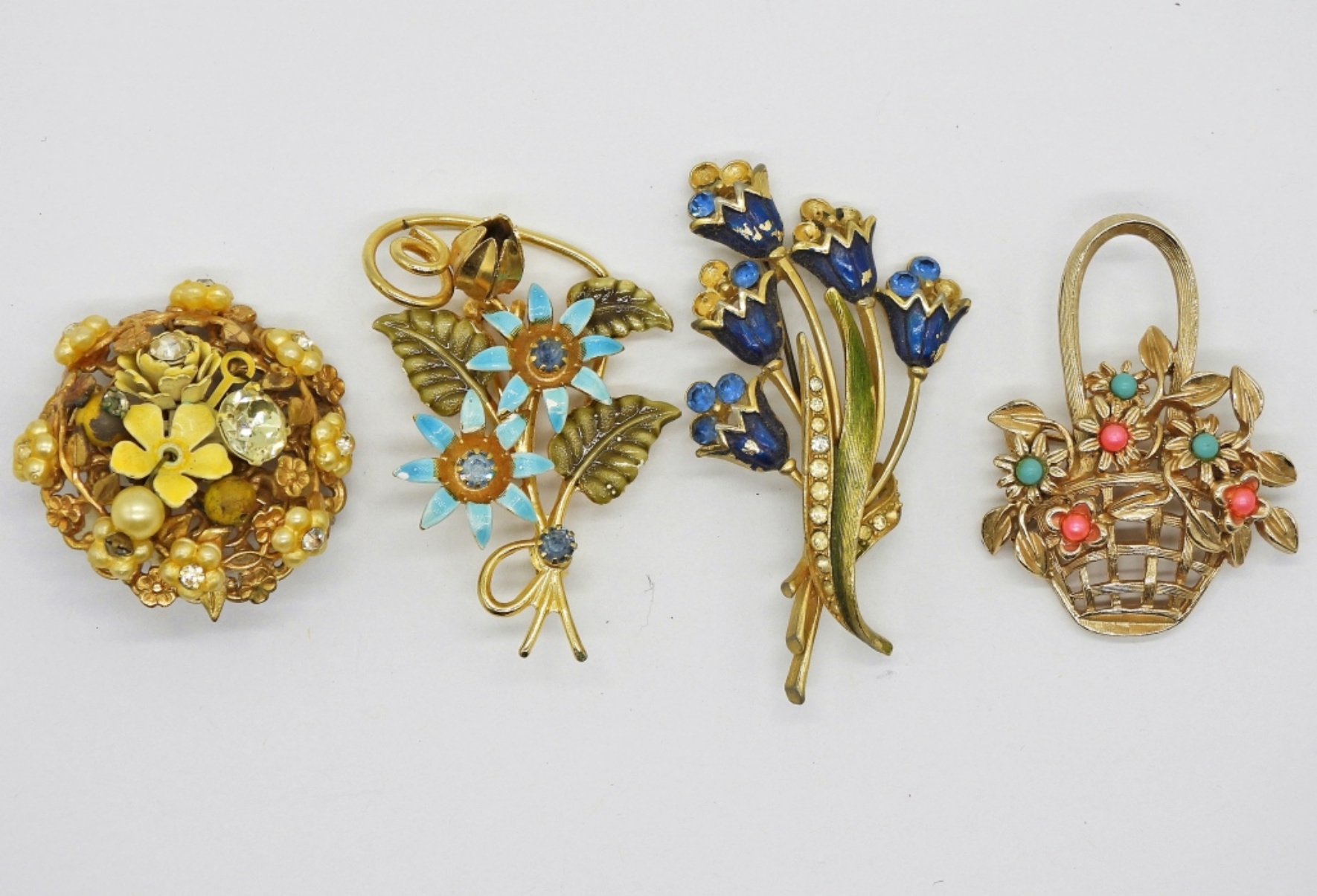 Four Gold Tone Vintage Brooches with Rhinestones and Enameled.