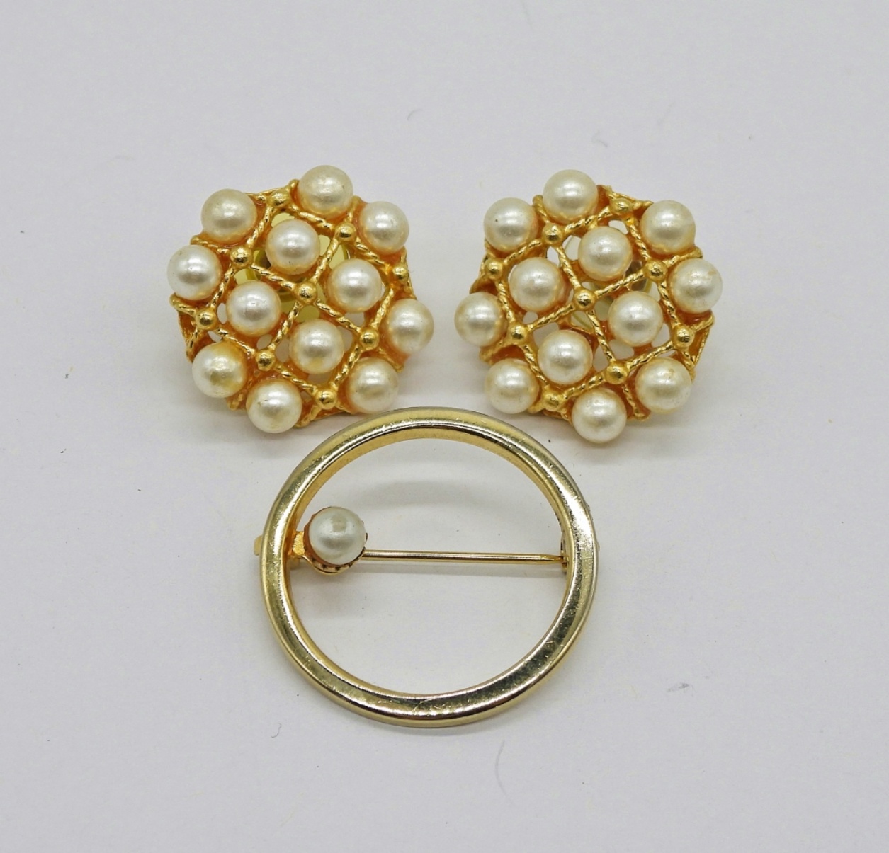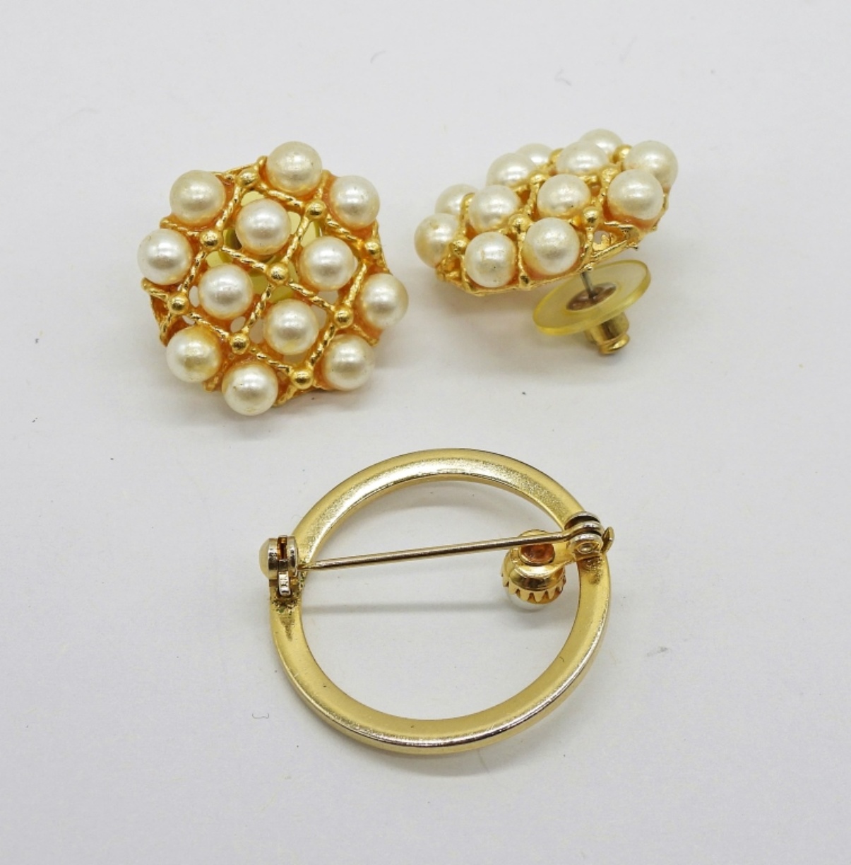 Vintage Gold Tone Earrings and Small Round Brooch with Faux Pearls.