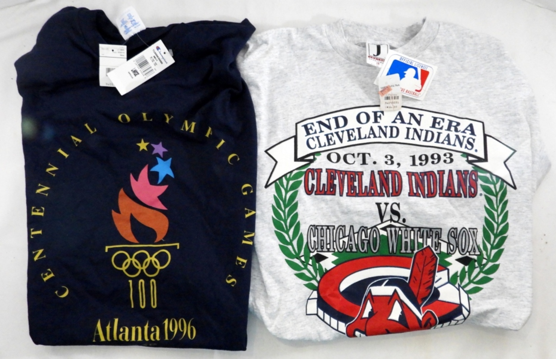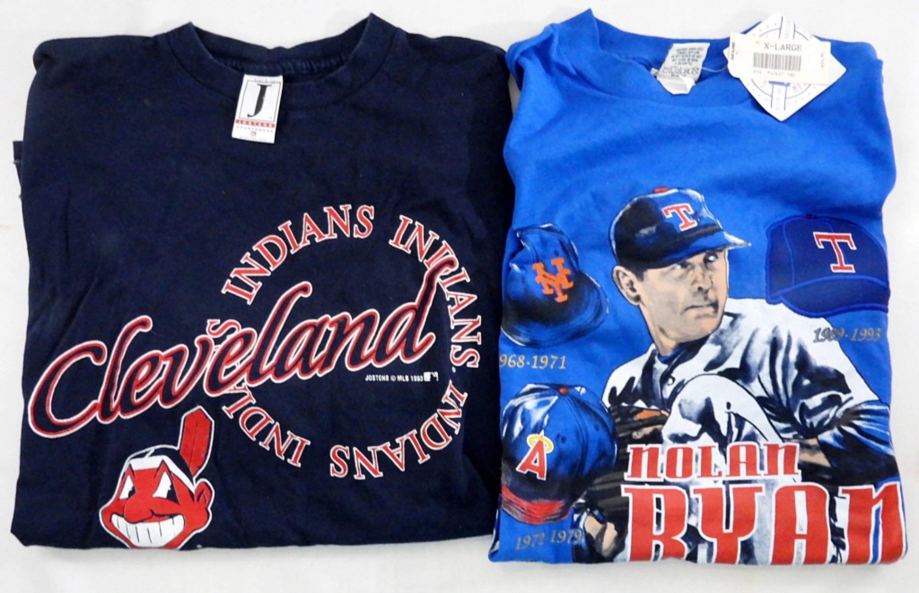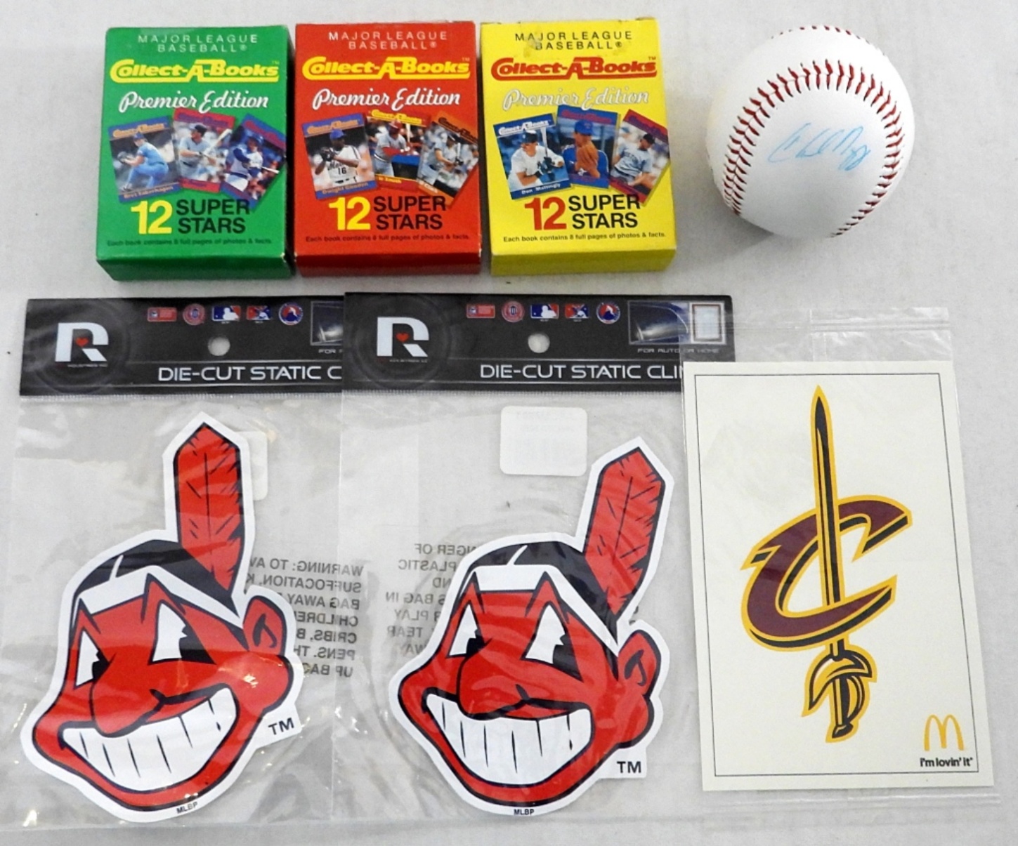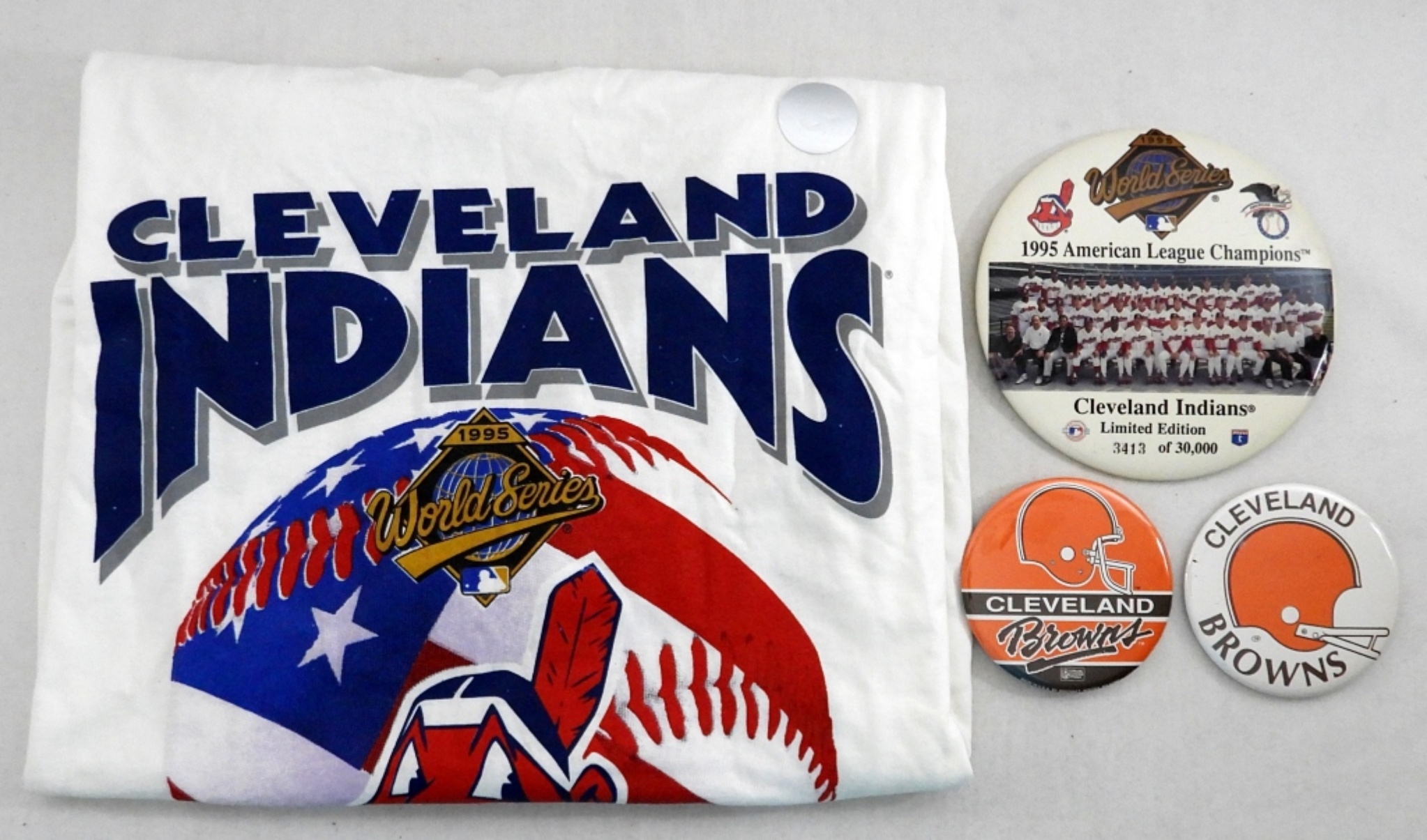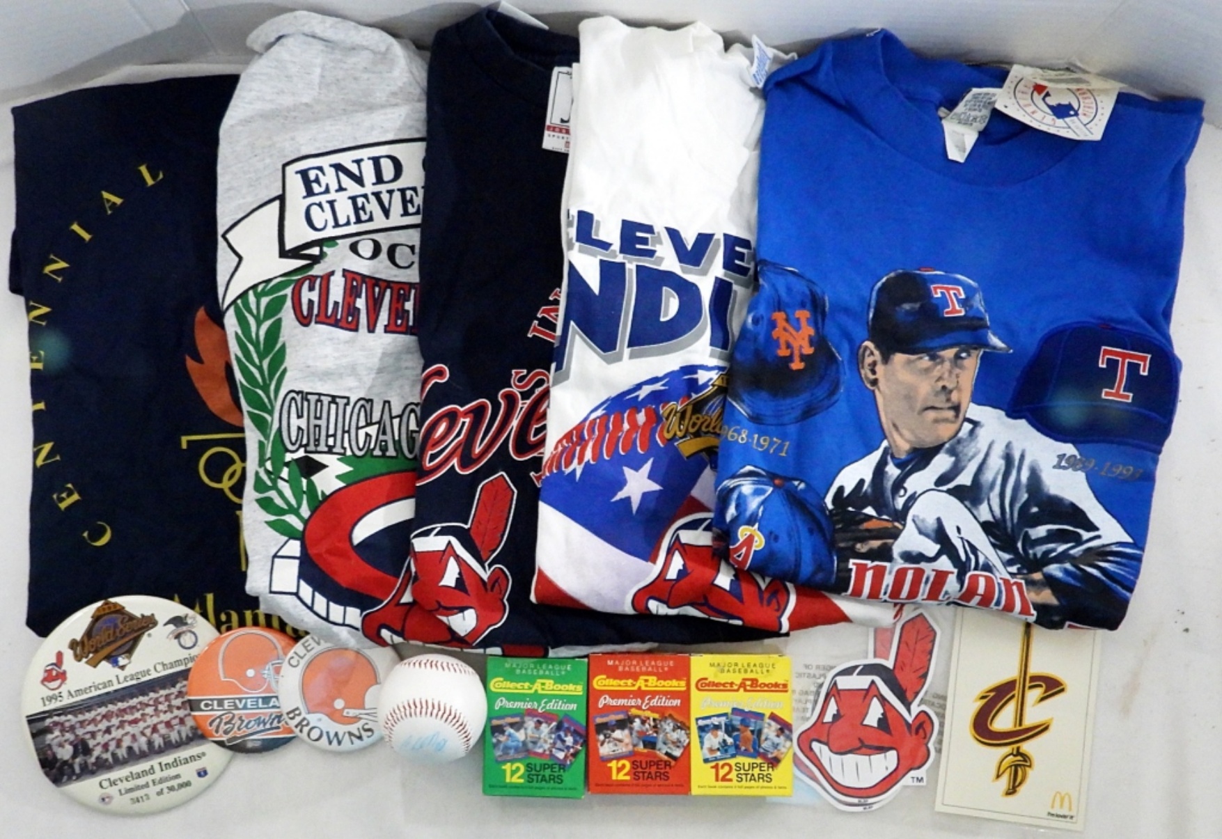 CLEVELAND INDIANS, BROWNS & MORE; (5) T-SHIRTS BRAND NEW WITH TAGS, (3) SPORTS CARD SETS IN BOXES, (3) LARGE FAN BUTTON PINS, AUTOGRAPHED BASEBALL (UNIDENTIFIED), DECALS & MORE (SEE PICS)
