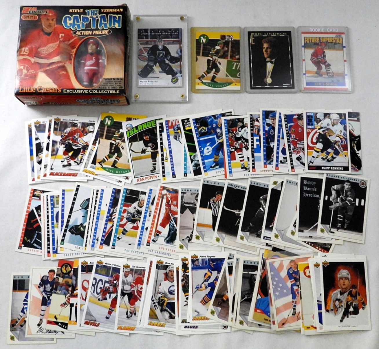 (97) HOCKEY CARDS mostly EARLY 1990s & MINI STEVE YZERMAN “LITTLE CEASARS” ACTION FIGURE