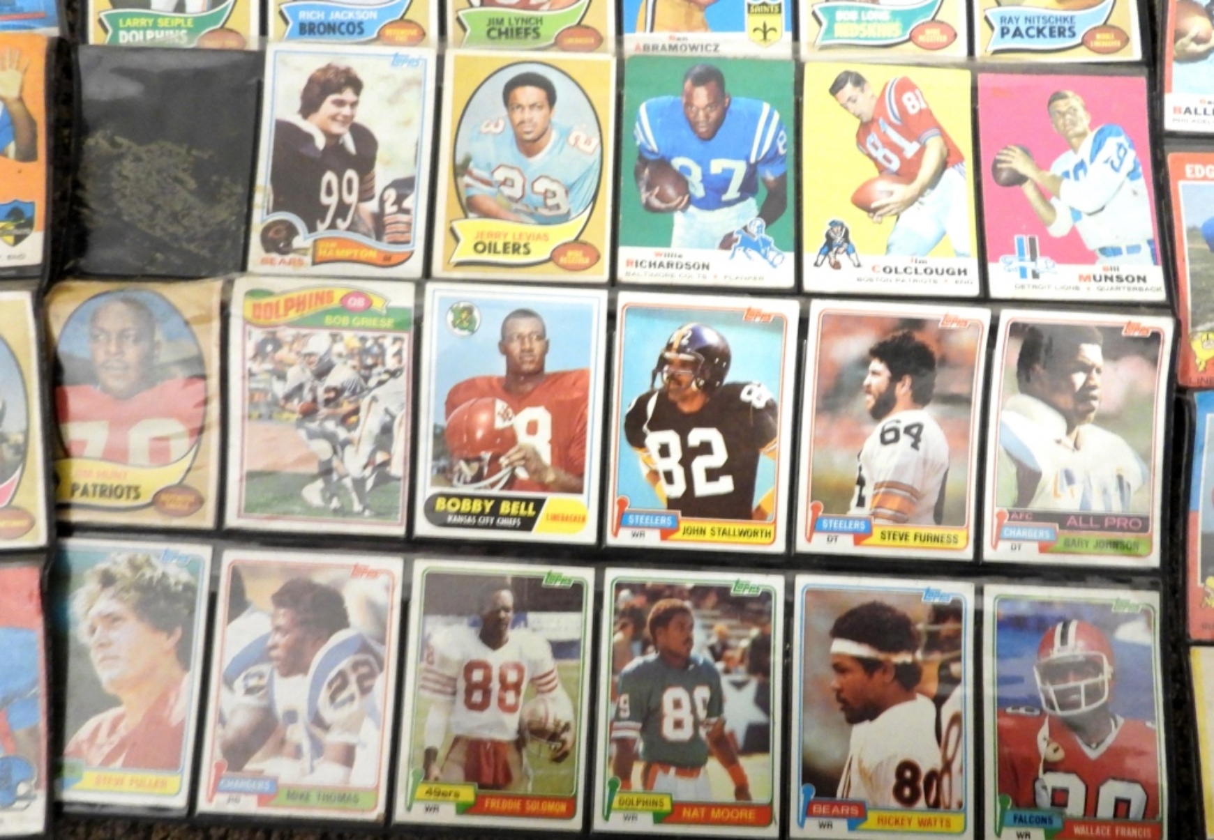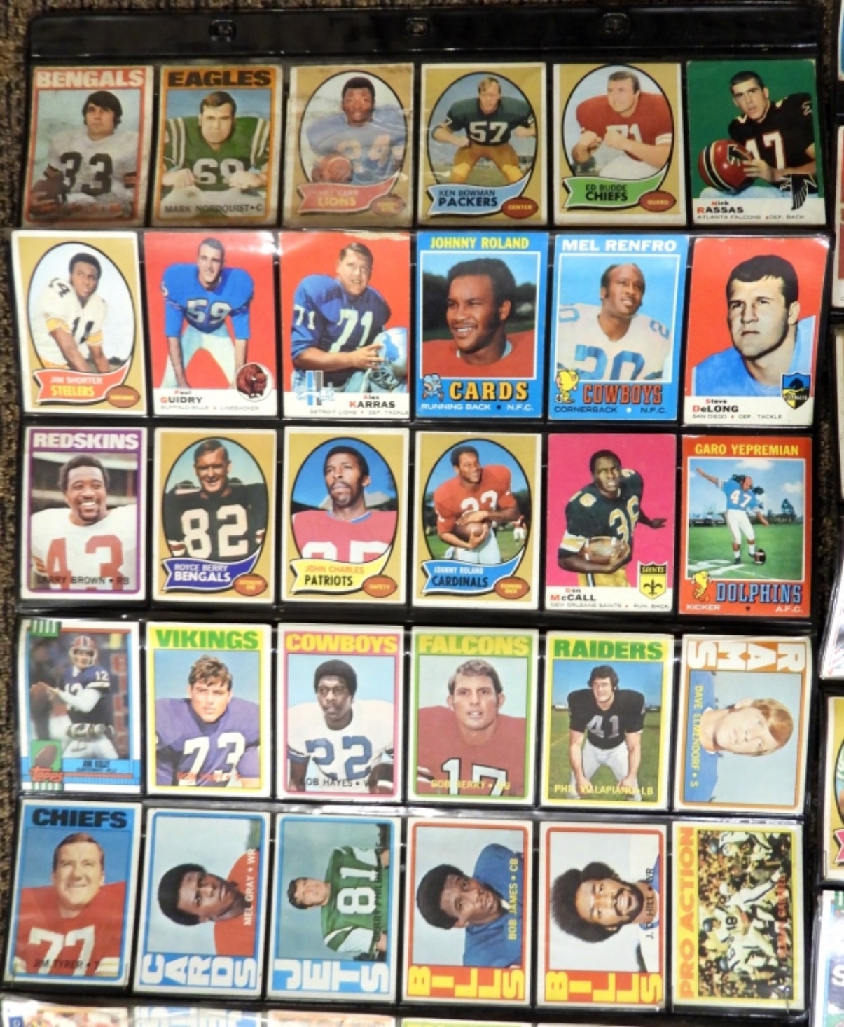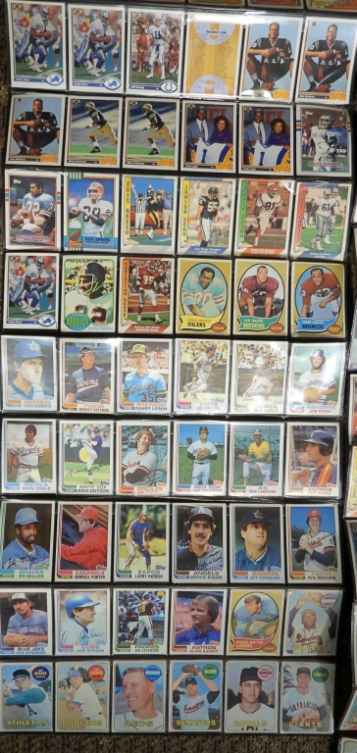 UNSEARCHED LOT of FOOTBALL & BASEBALL – 60s, 70s & 80s – OVERALL EX/VGEX with some bent from being stored in these wall display sheets. CRAZY MIX with STARS!!