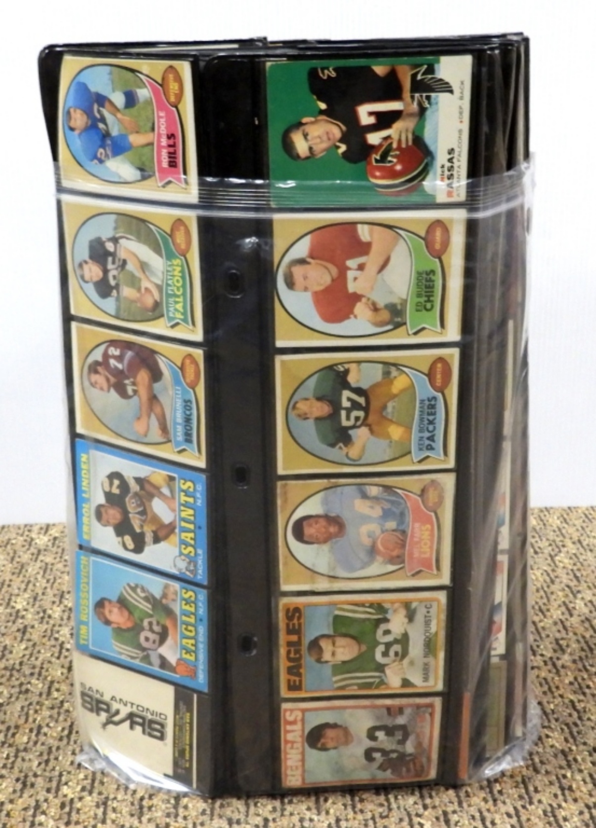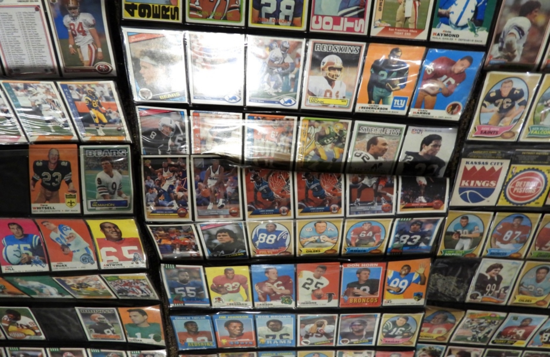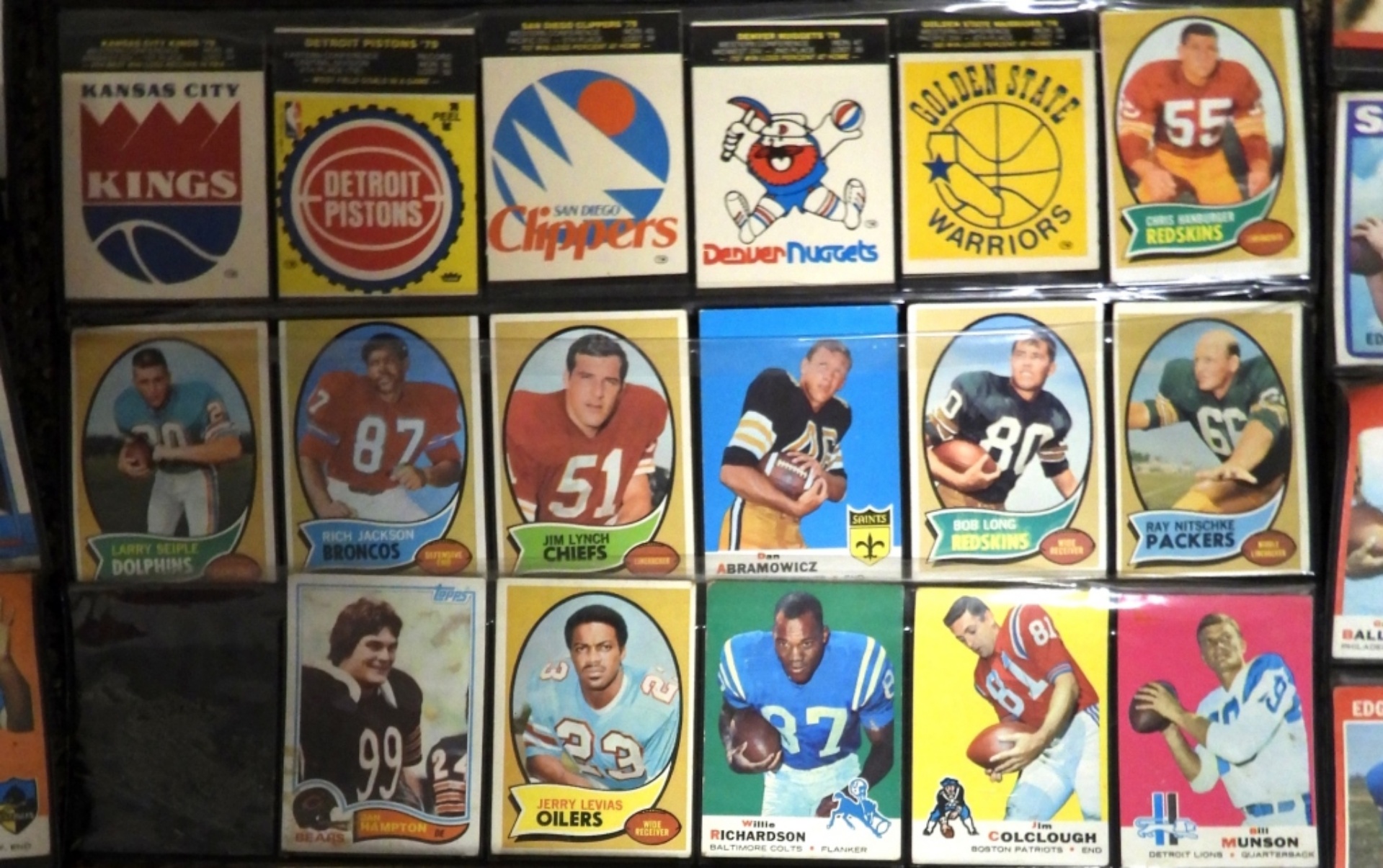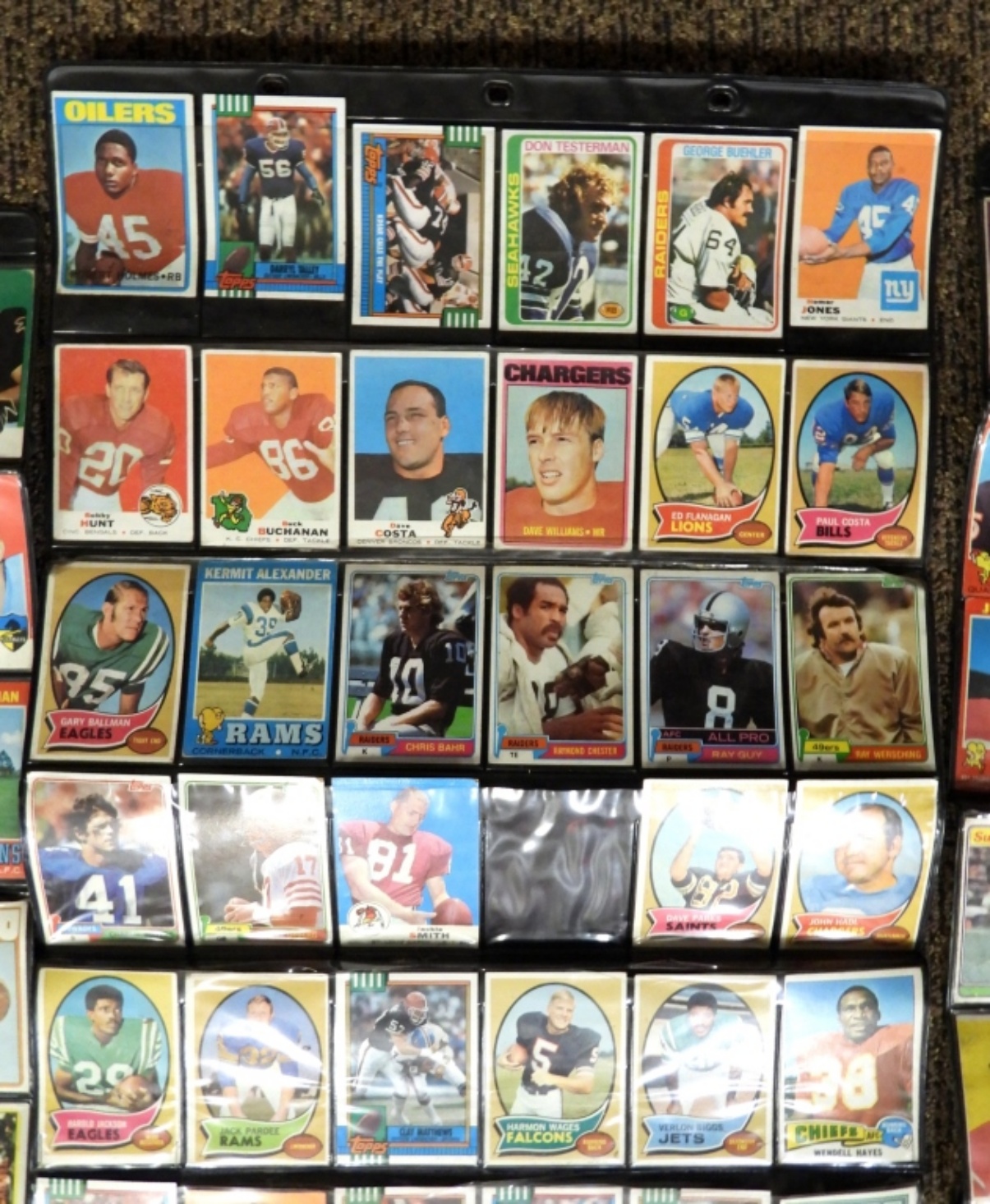 UNSEARCHED LOT of FOOTBALL & BASEBALL – 60s, 70s & 80s – OVERALL EX/VGEX with some bent from being stored in these wall display sheets. CRAZY MIX with STARS!!