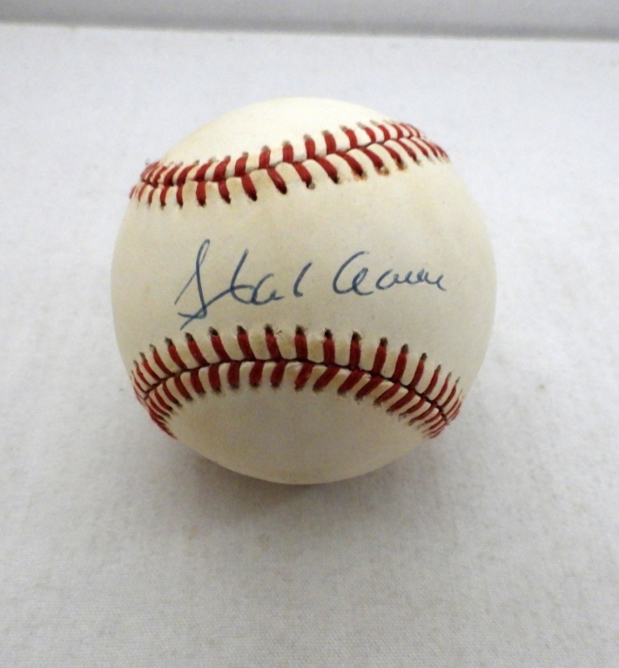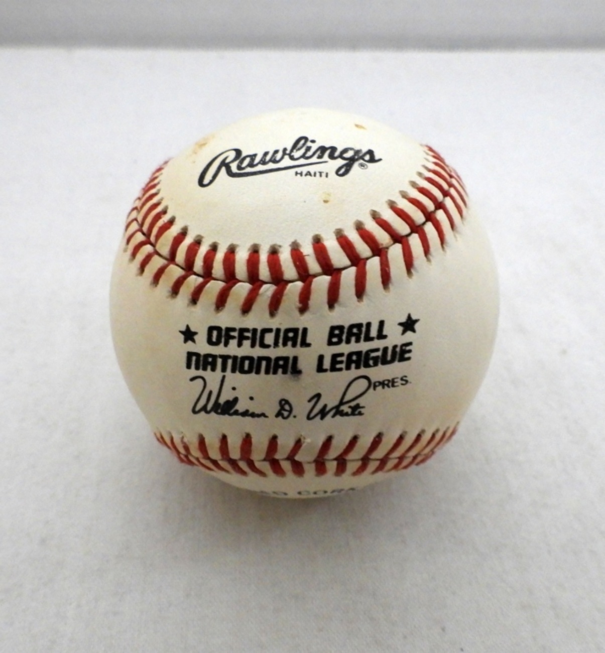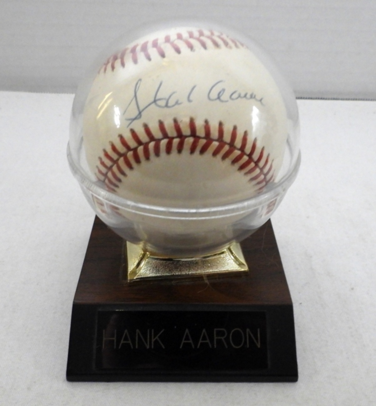 IN WOODEN STAND, SIGNED ON OFFICIAL NATIONAL LEAGUE BALL