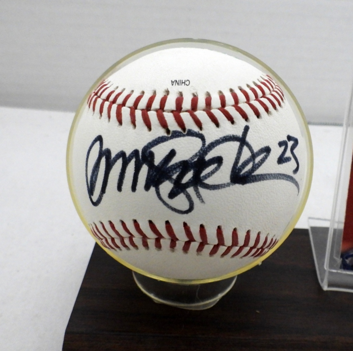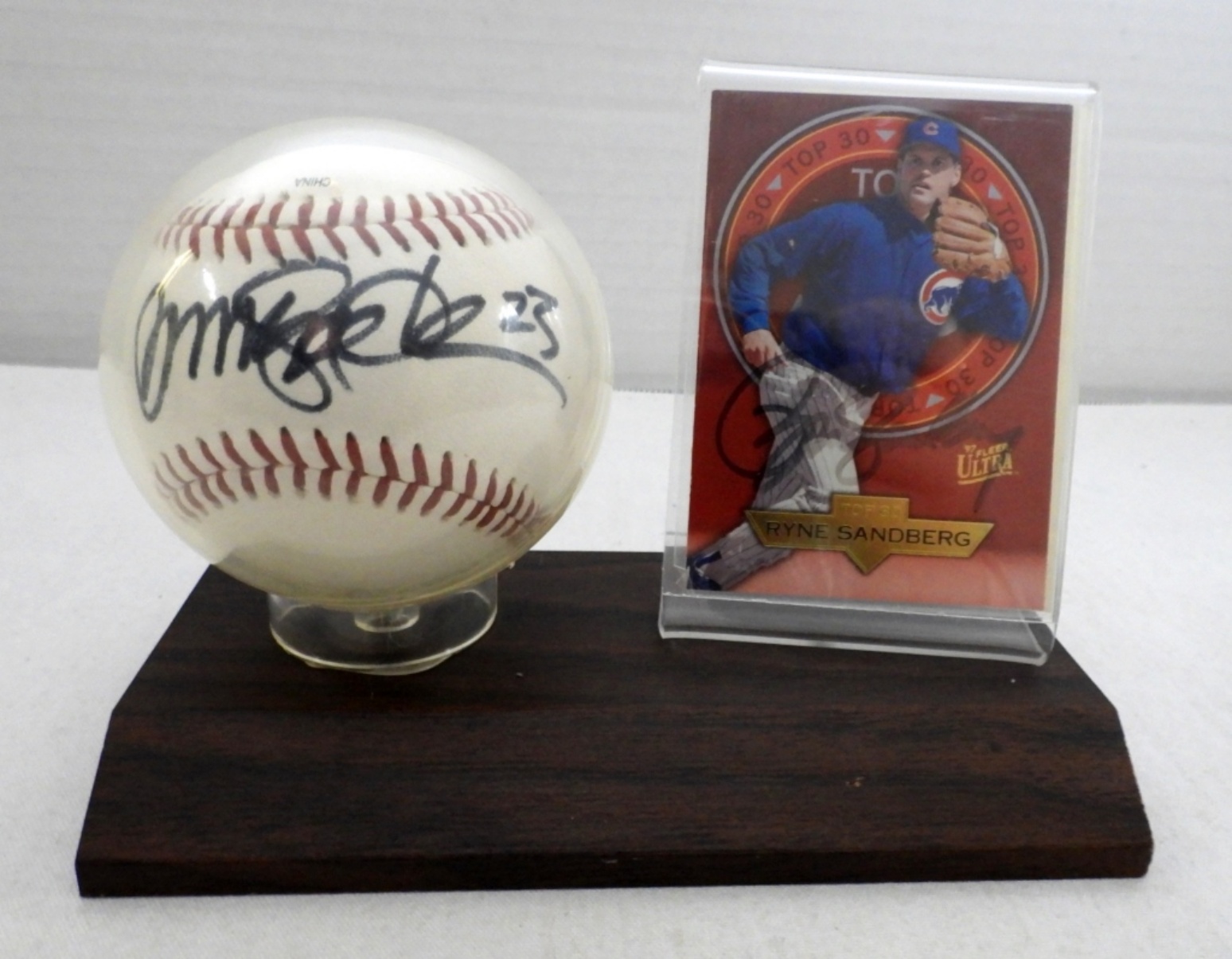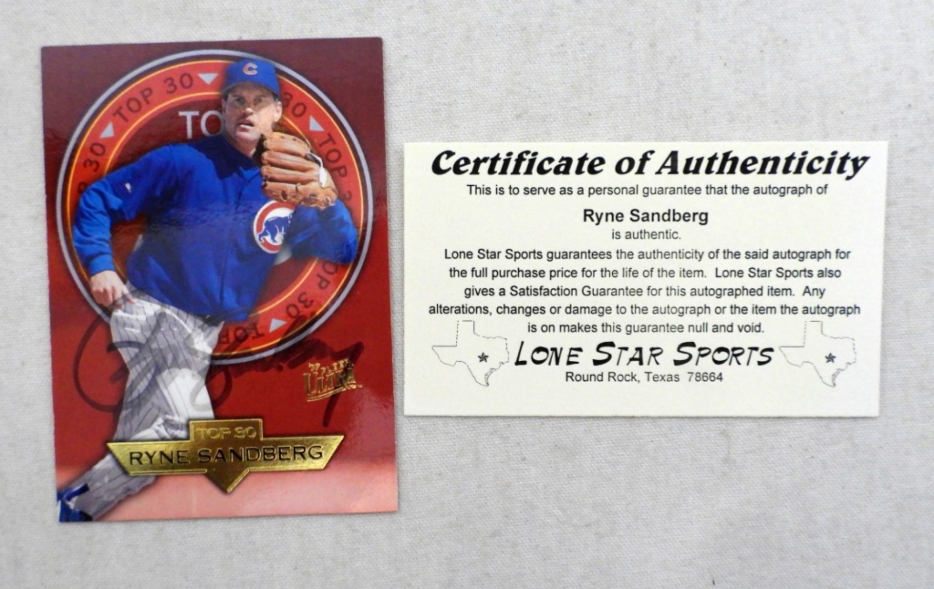 ON WOODEN PLAQUE, SIGNED ON RAWLINGS OFFICIAL BASEBALL, ’97 FLEER ULTRA 20 OF 30 TOP 30 BASEBALL CARD, COA FROM LONE STAR SPORTS