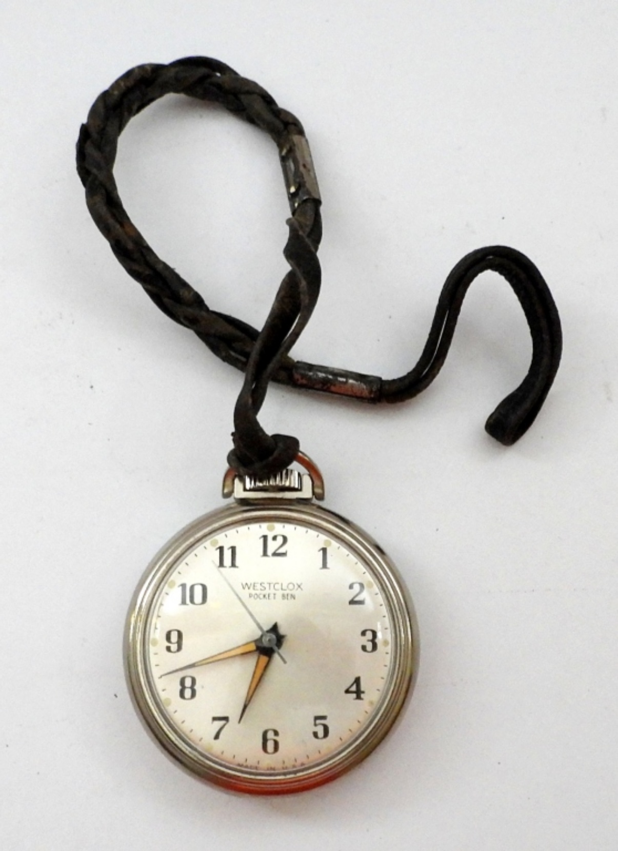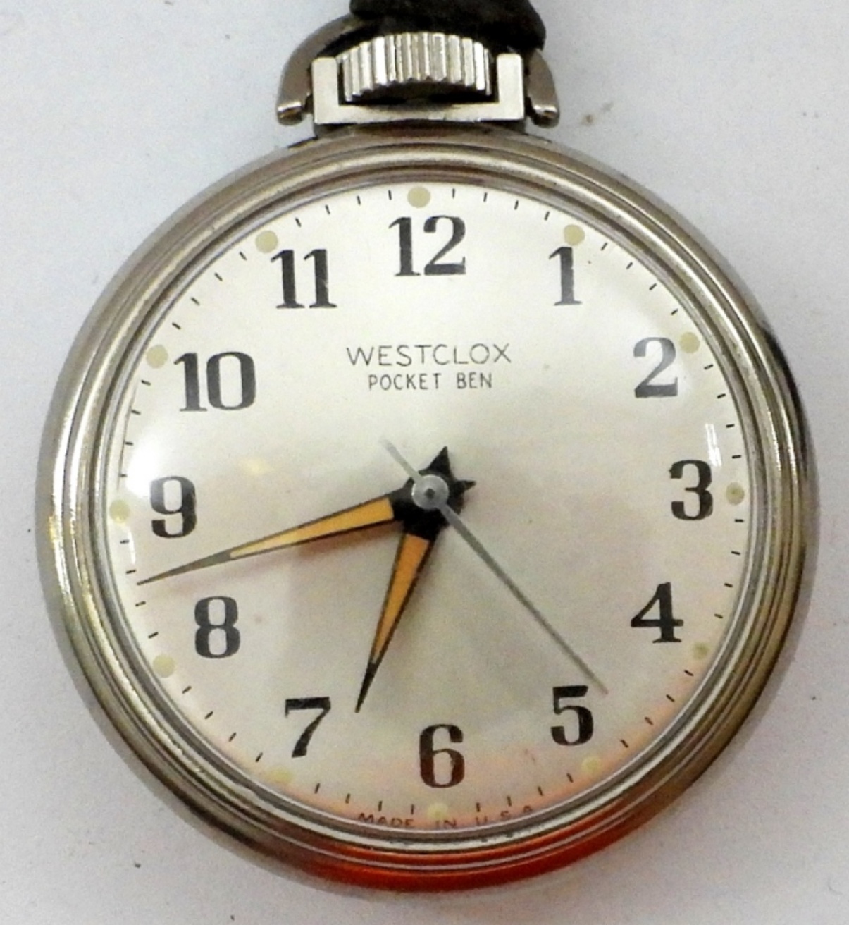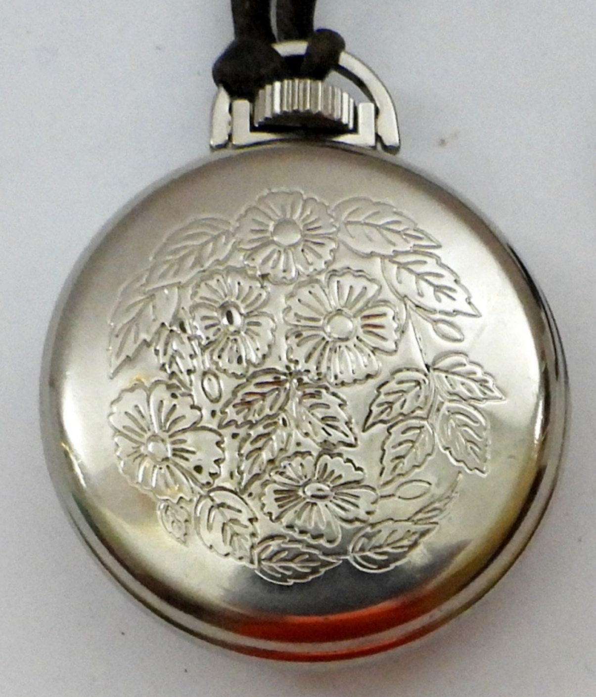 VINTAGE WESTCLOX POCKET BEN MECHANICAL POCKET WATCH, CHROME PLATED, FLORAL DESIGN – IN WORKING CONDITION, NEEDS SERVICED