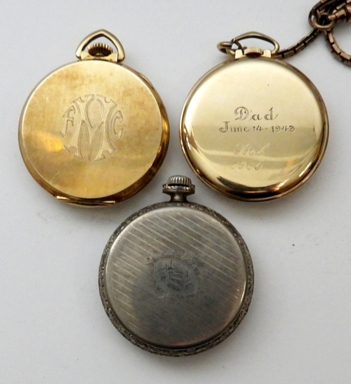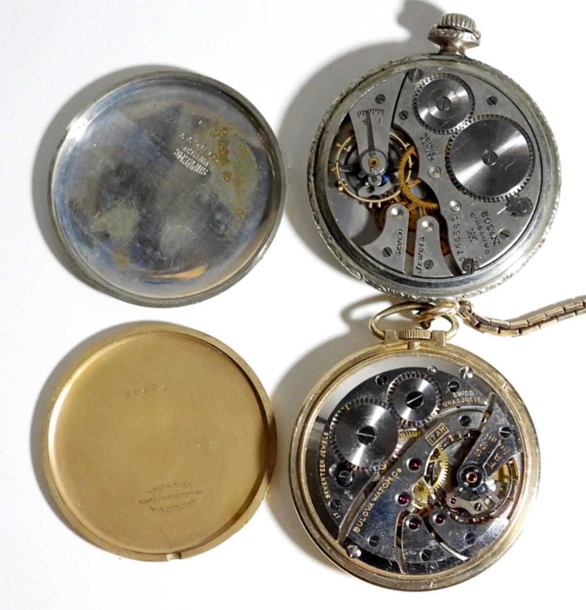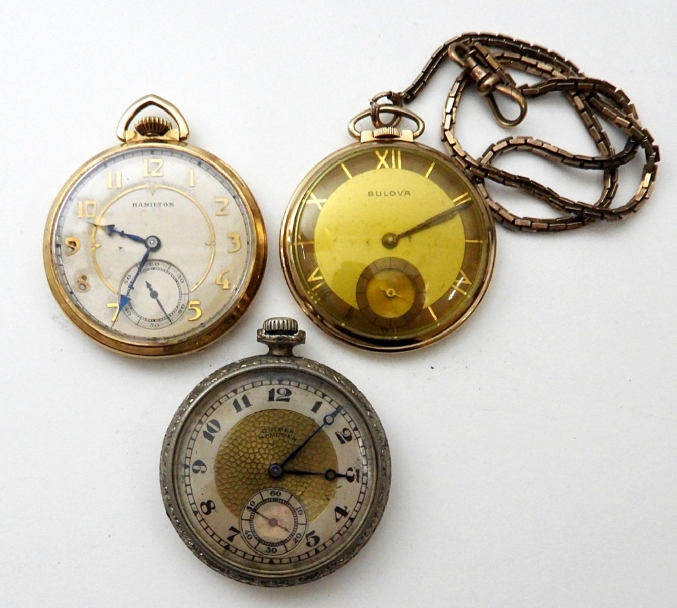 (1) BULOVA w/CHAIN, (1) HAMILTON, (1) DUEBER HAMPDEN – ALL WORKING CONDITION – LOT NEEDS SERVICED