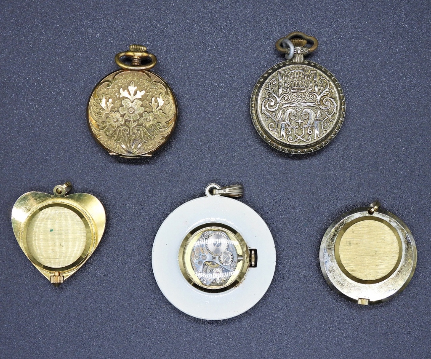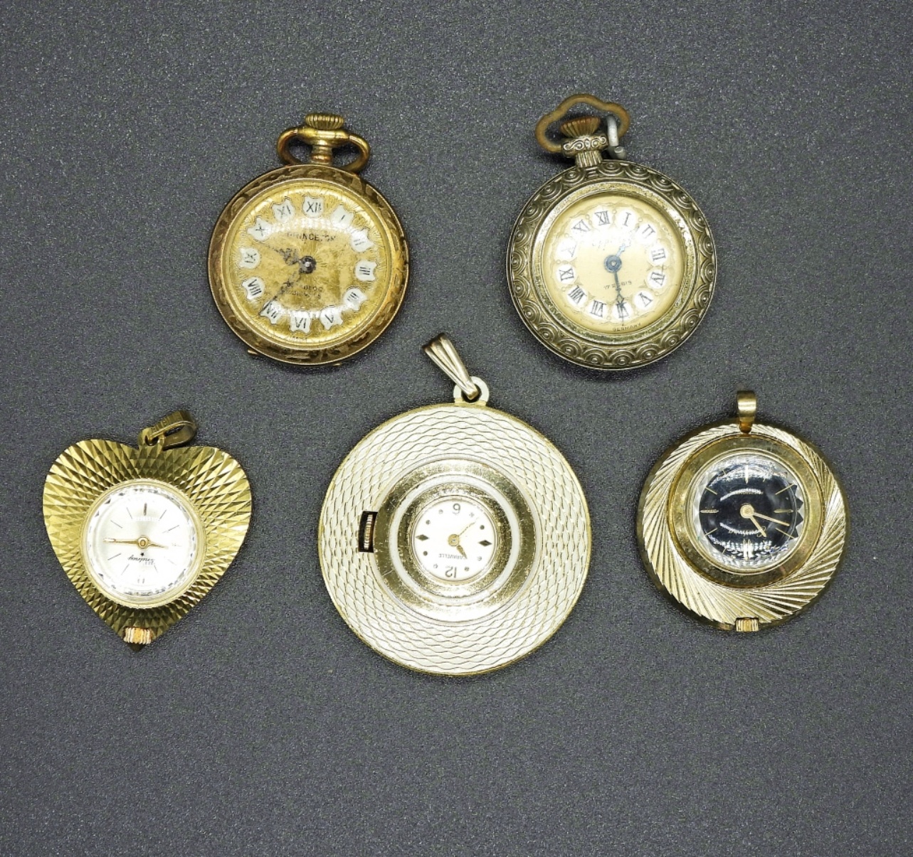 5 GOLD TONE VINTAGE PENDANT WATCHES WITHOUT CHAINS. -NOT TESTED AS TO WORKING OR NOT.