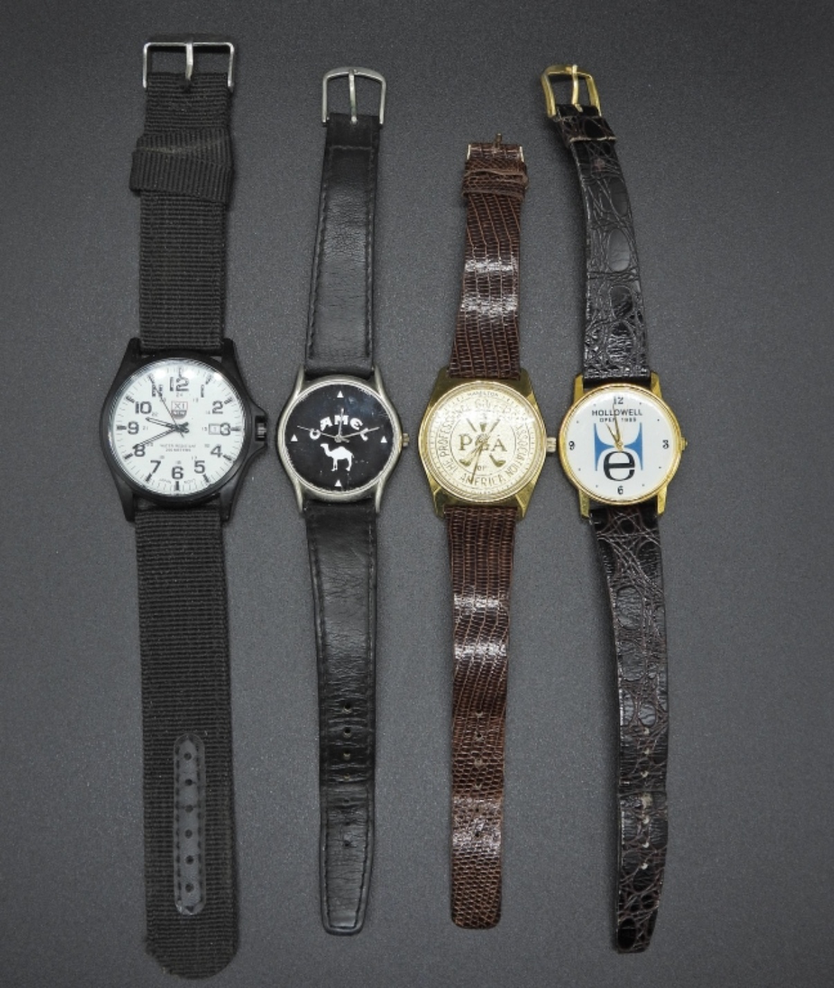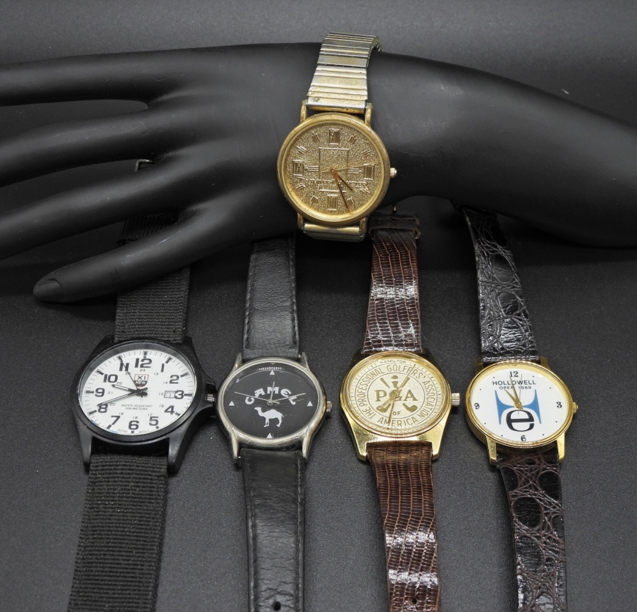 5 UNISEX NOVELTY WATCHES. PGA, CAMEL, HOLLOWELL, DAIMLER CHRYSLER -NOT TESTED AS TO WORKING OR NOT.