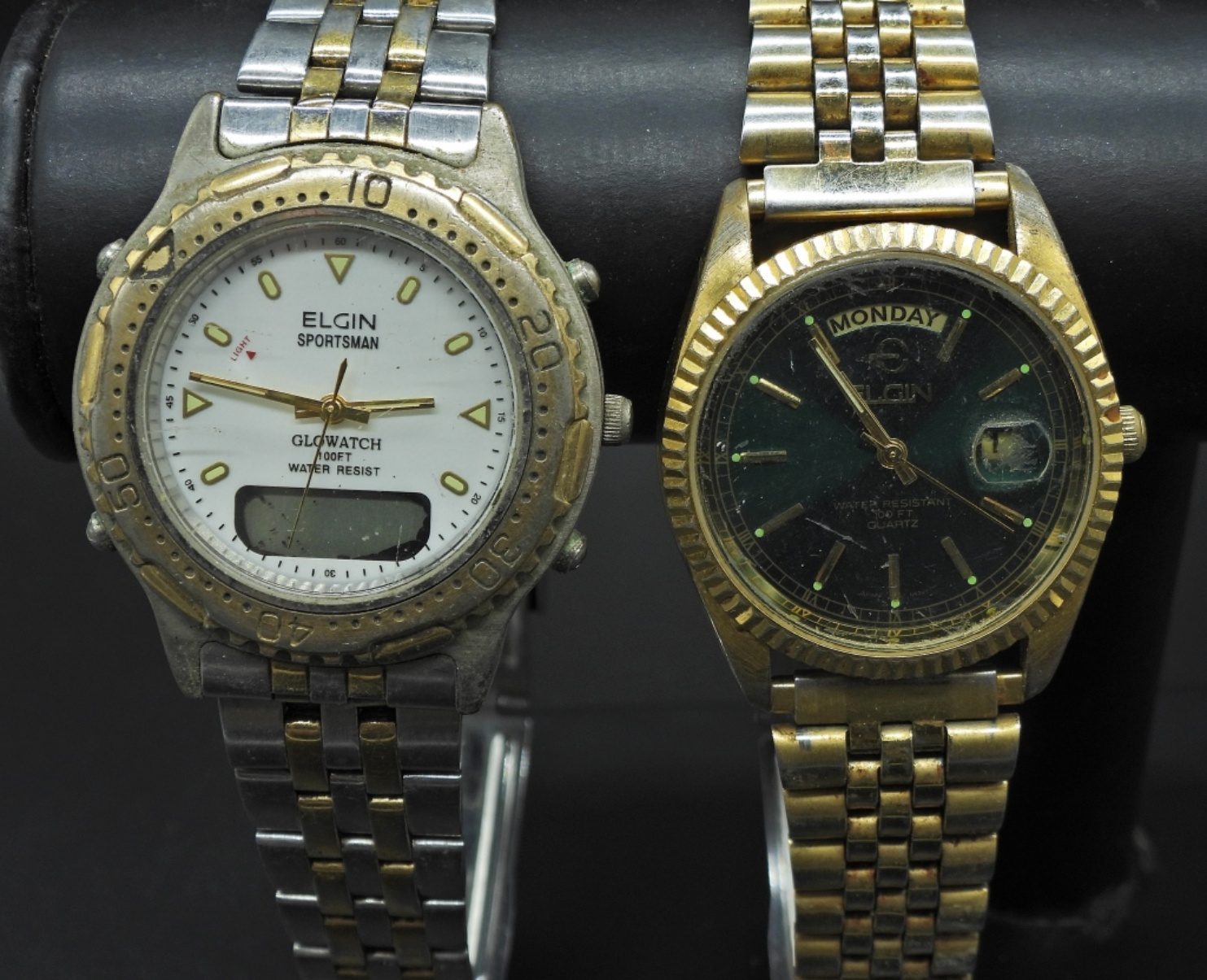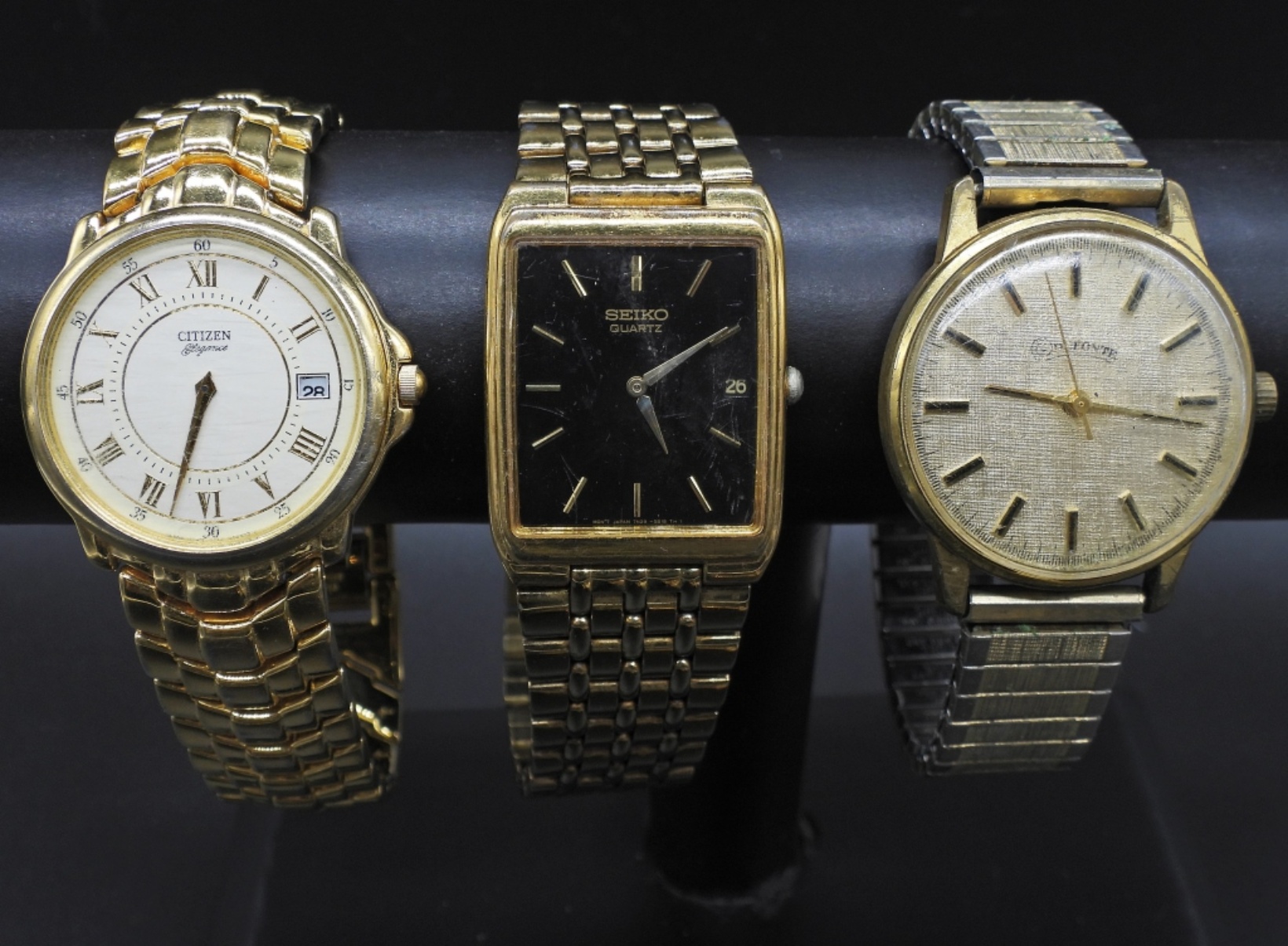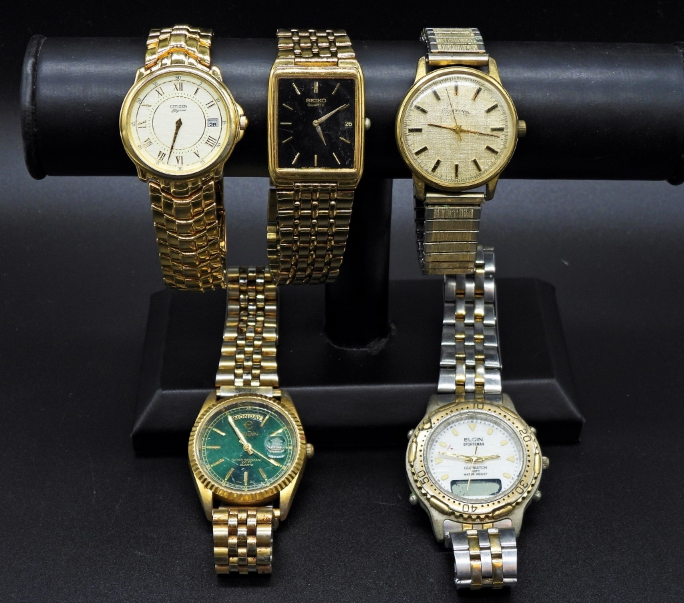 ELGIN (BAND NEEDS FIXED), CITIZEN, SEIKO, DUFONTE. -NOT TESTED AS TO WORKING OR NOT.