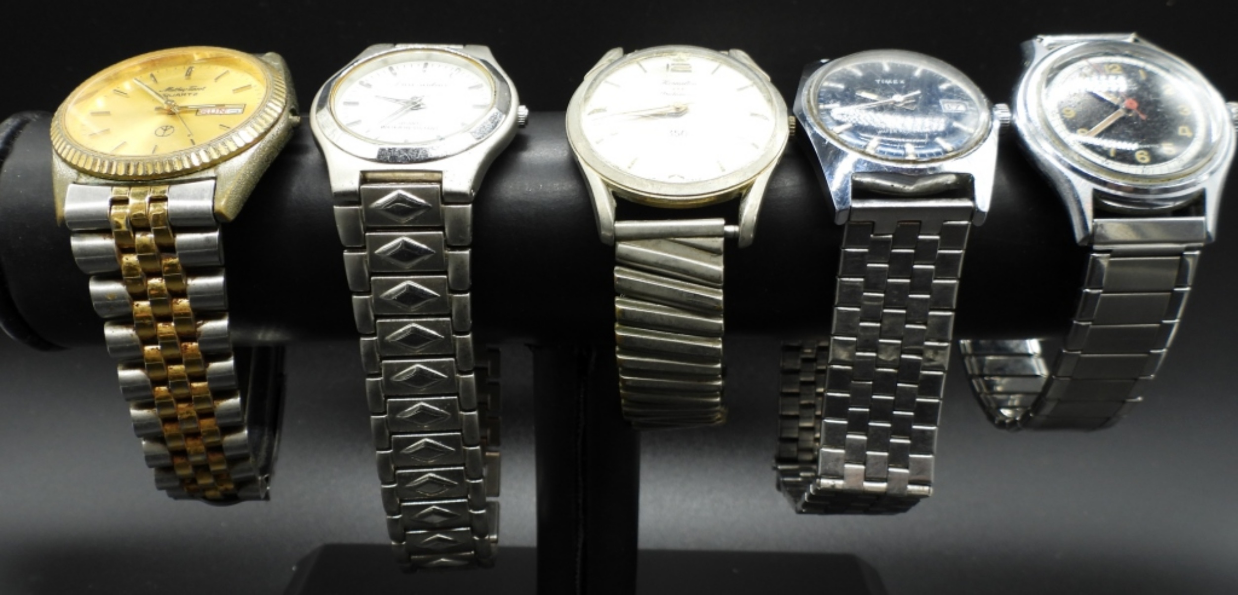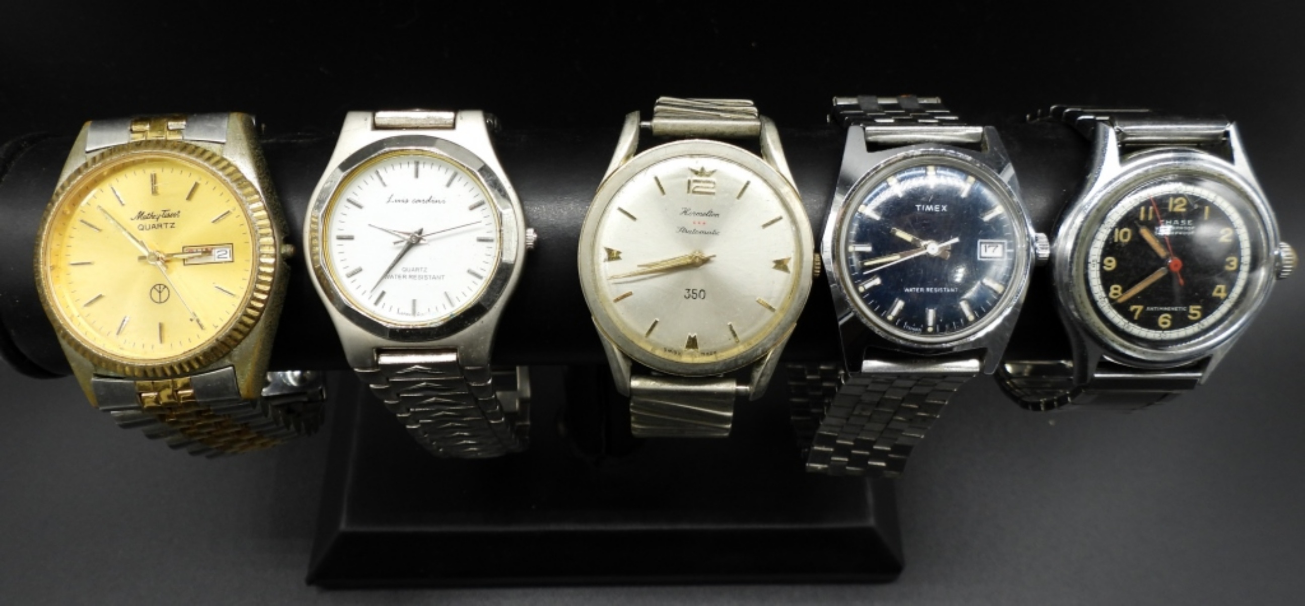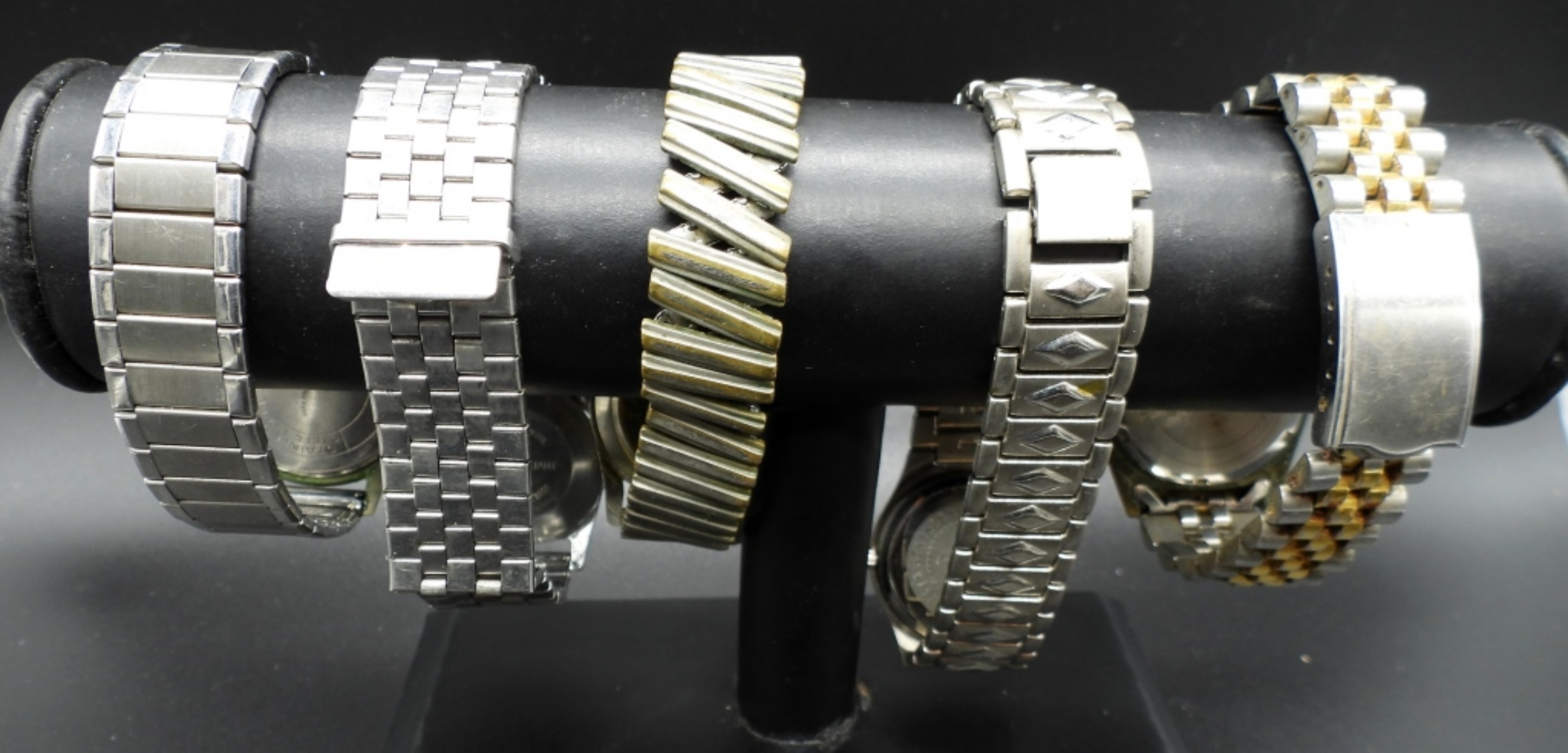 NOT TESTED,2- STRETCHY BANDS, 3- CLASP BANDS, 1- TIMEX, 1- CHASE, 1- LUIS CARDINI QUARTZ, 1 KORMELTON, 1 MARTHEY-TISSOT QUARTZ