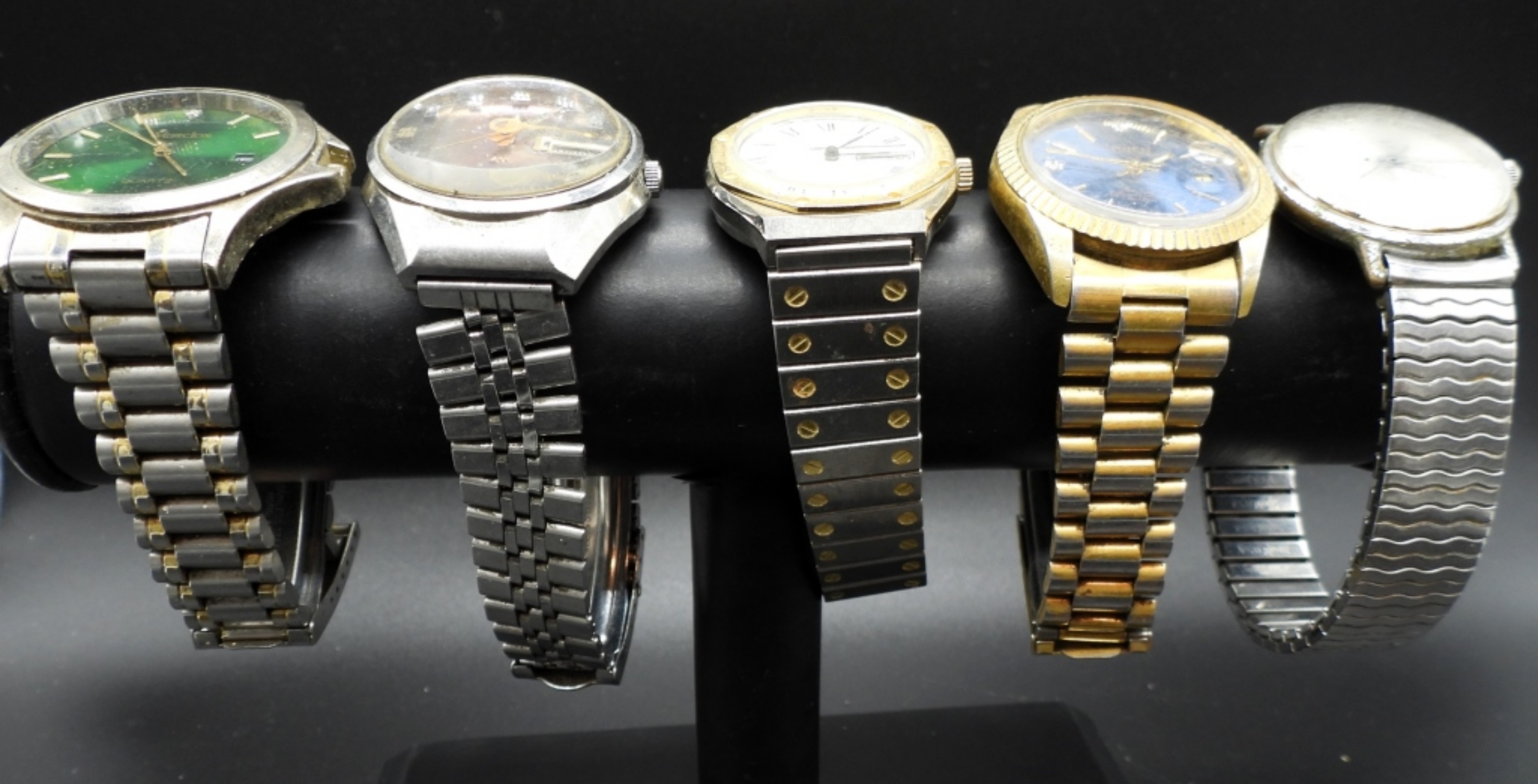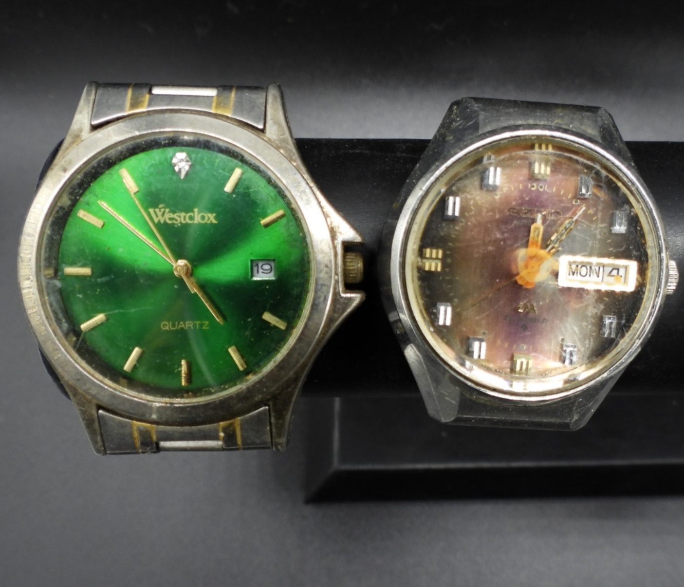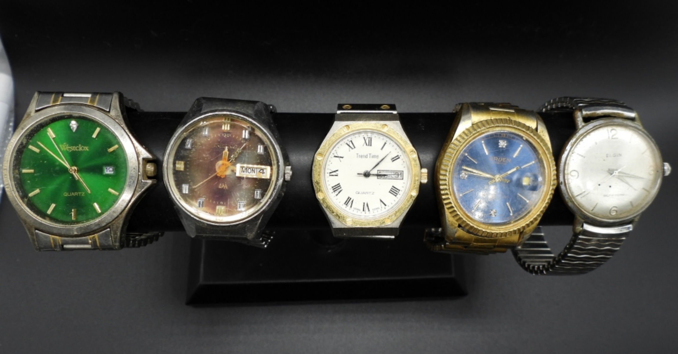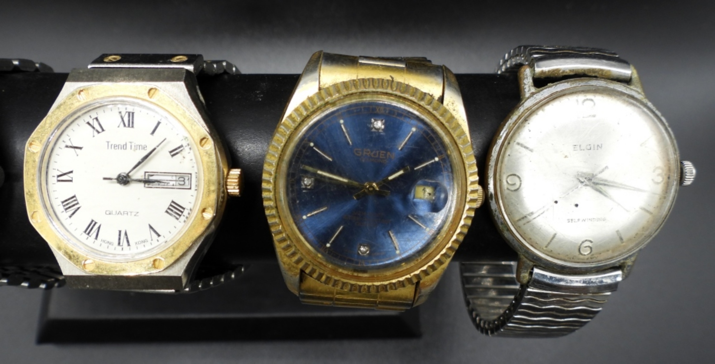 NOT TESTED, 1 WESTCLOX QUARTZ, 1 TRENDTIME QUARTZ, 1 ELGIN, 1 GRUEN QUARTZ, 1 SEIKO