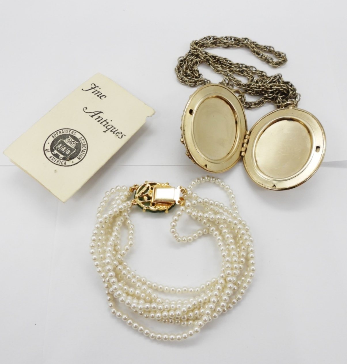 VINTAGE GOLD TONE JADE / JADE CHIP SET. LOCKET NECKLACE IS 24″. FAUX PEARL AND POSSIBLY FAUX JADE BRACELET IS 7″. VINTAGE GOLD TONE JADE BROOCH, 2″x1″.