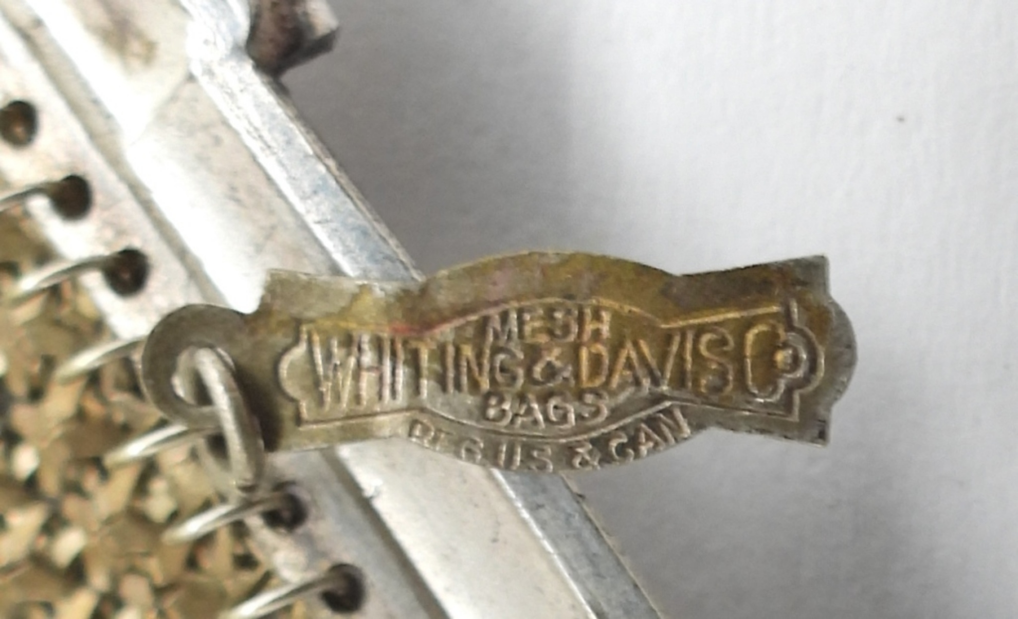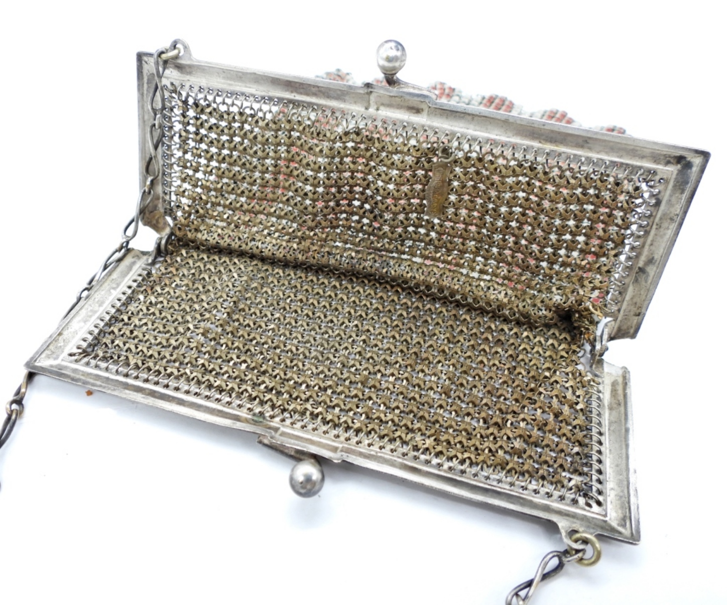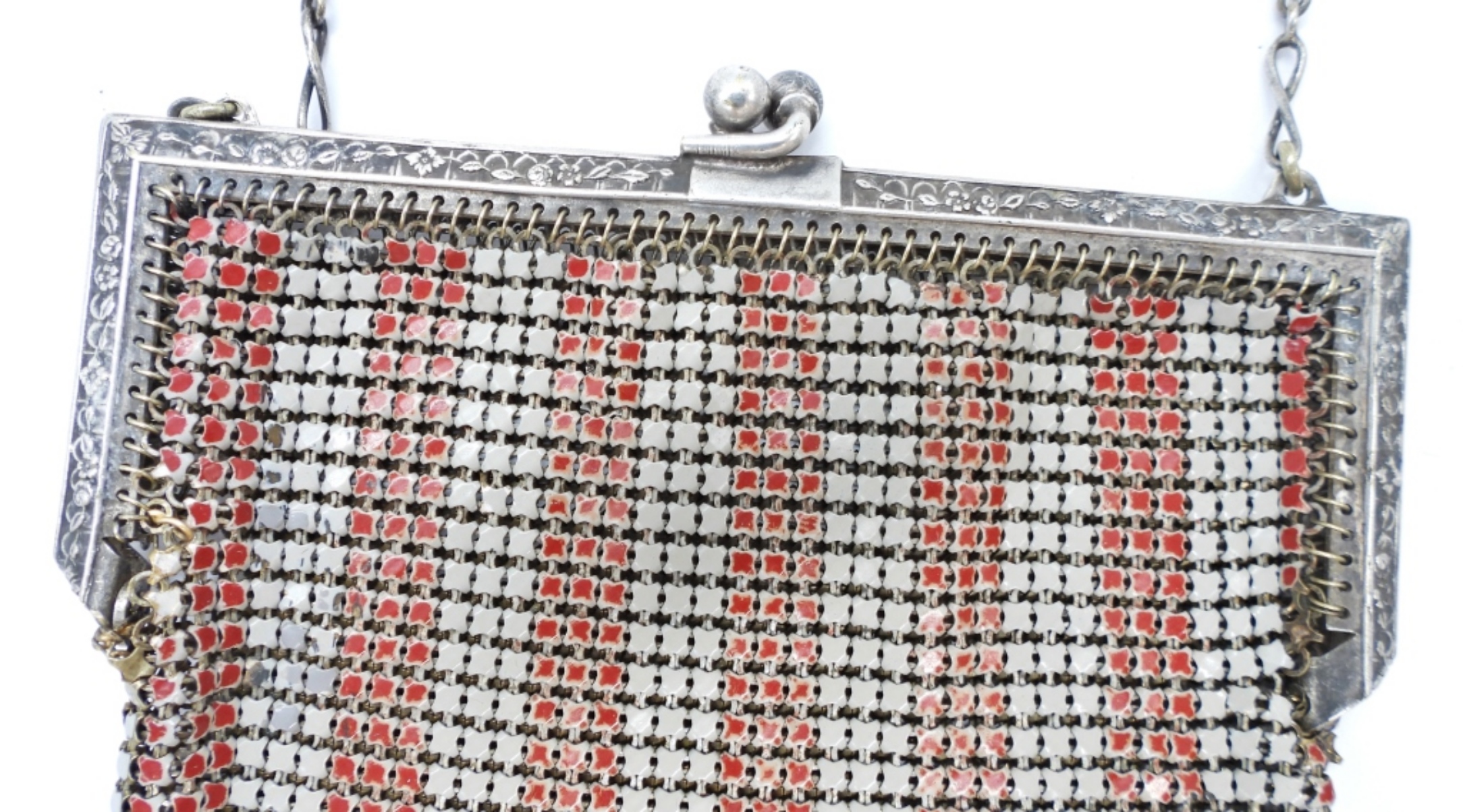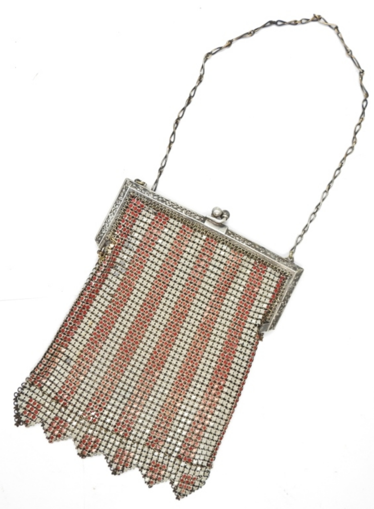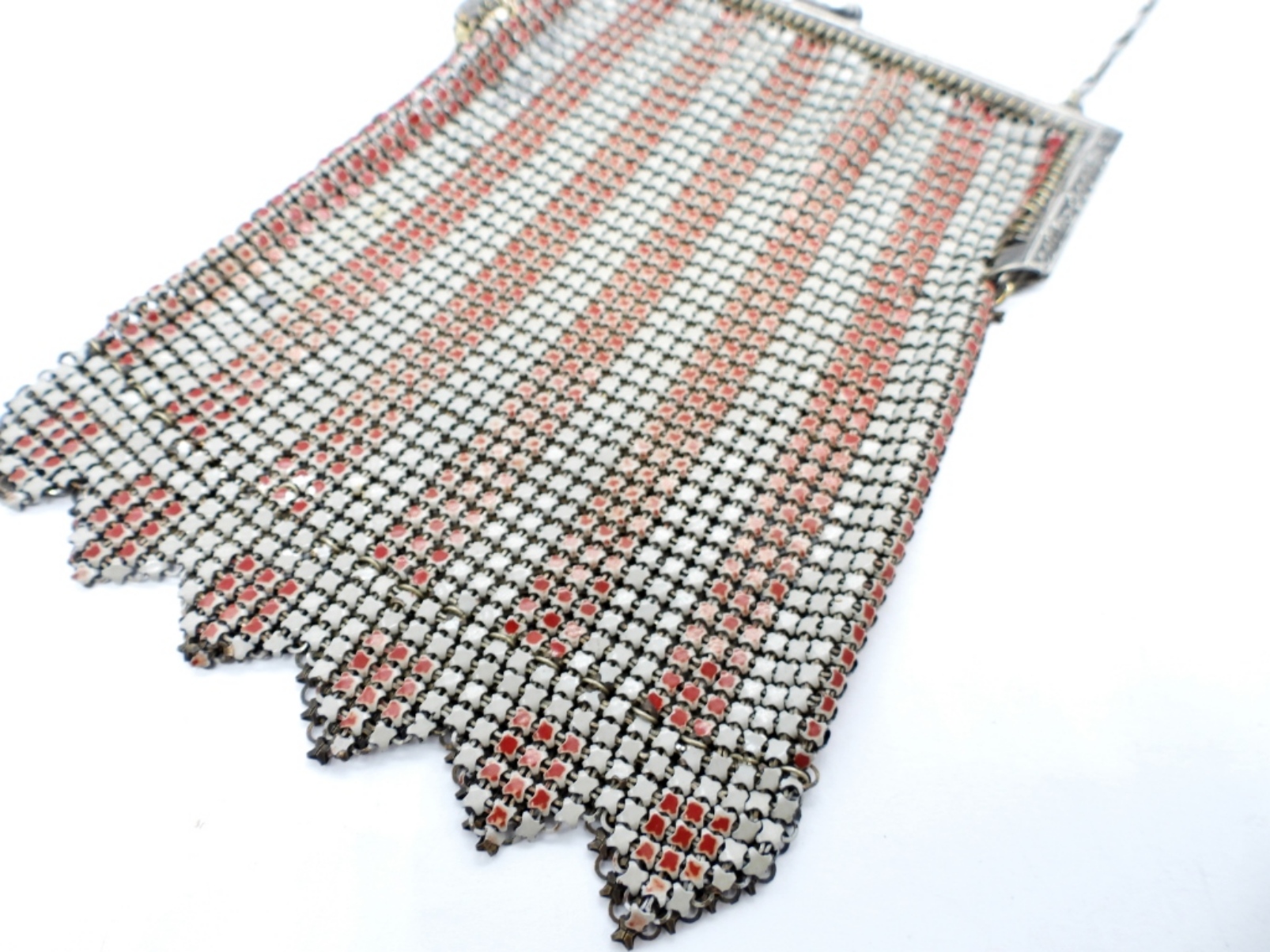 VINTAGE WHITING & DAVIS CO., RED AND WHITE MESH FLAPPER BAG PURSE. ORIGINAL MAKERS TAG INSIDE. 4″ WIDE, 6″ LONG.
