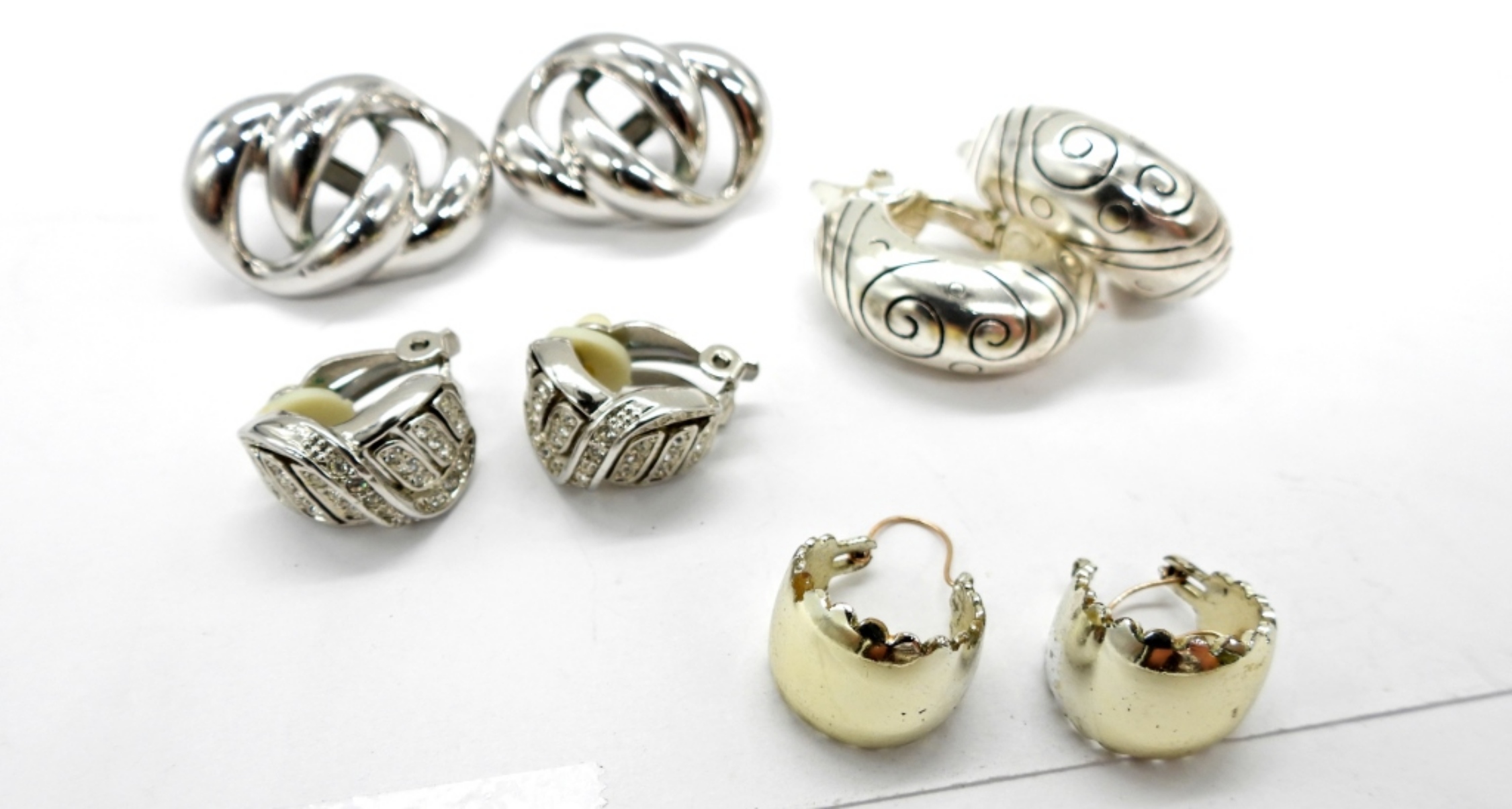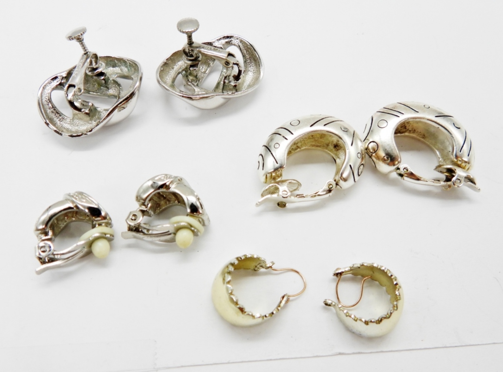 4 PAIR OF SILVER TONE PIERCED, SCREW BACK & CLIP ON EARRINGS.