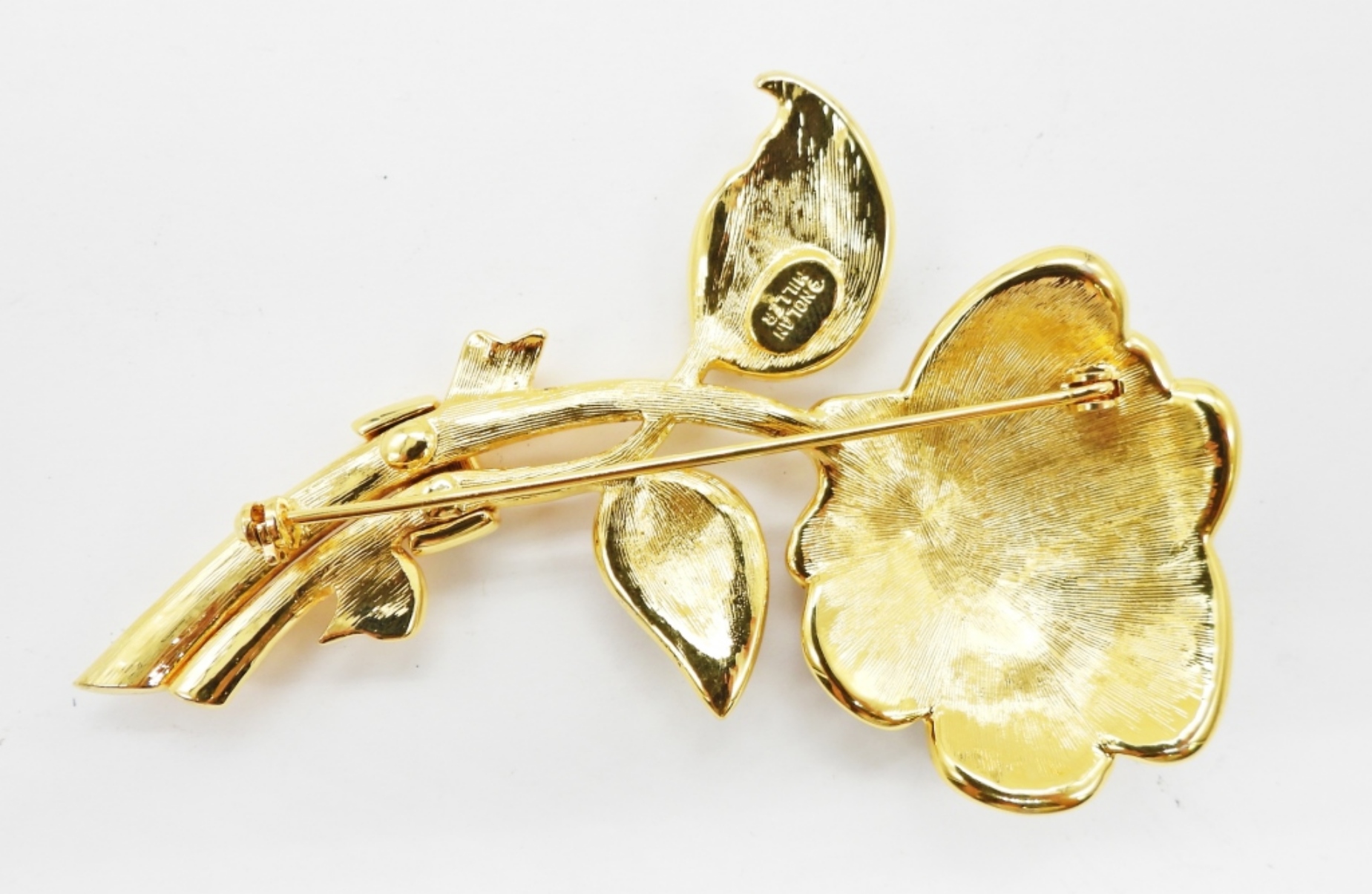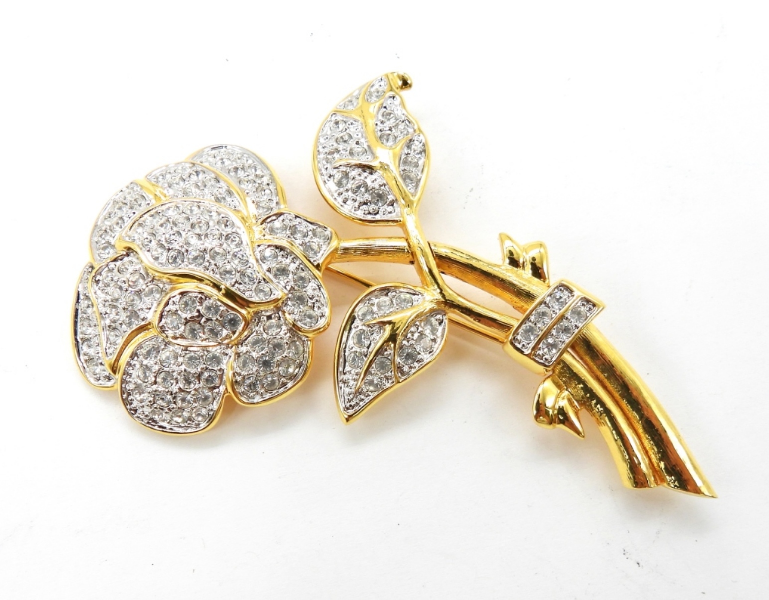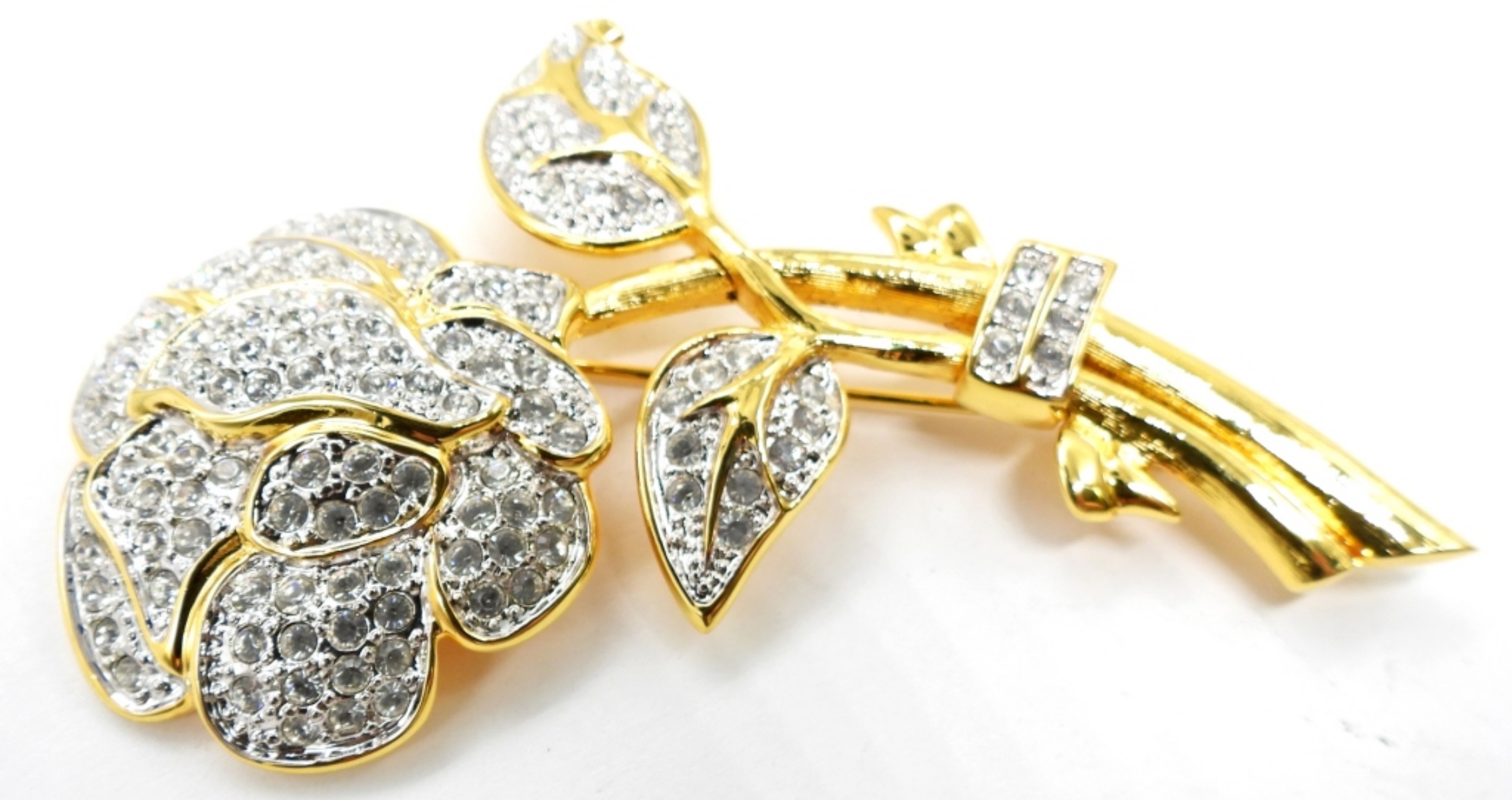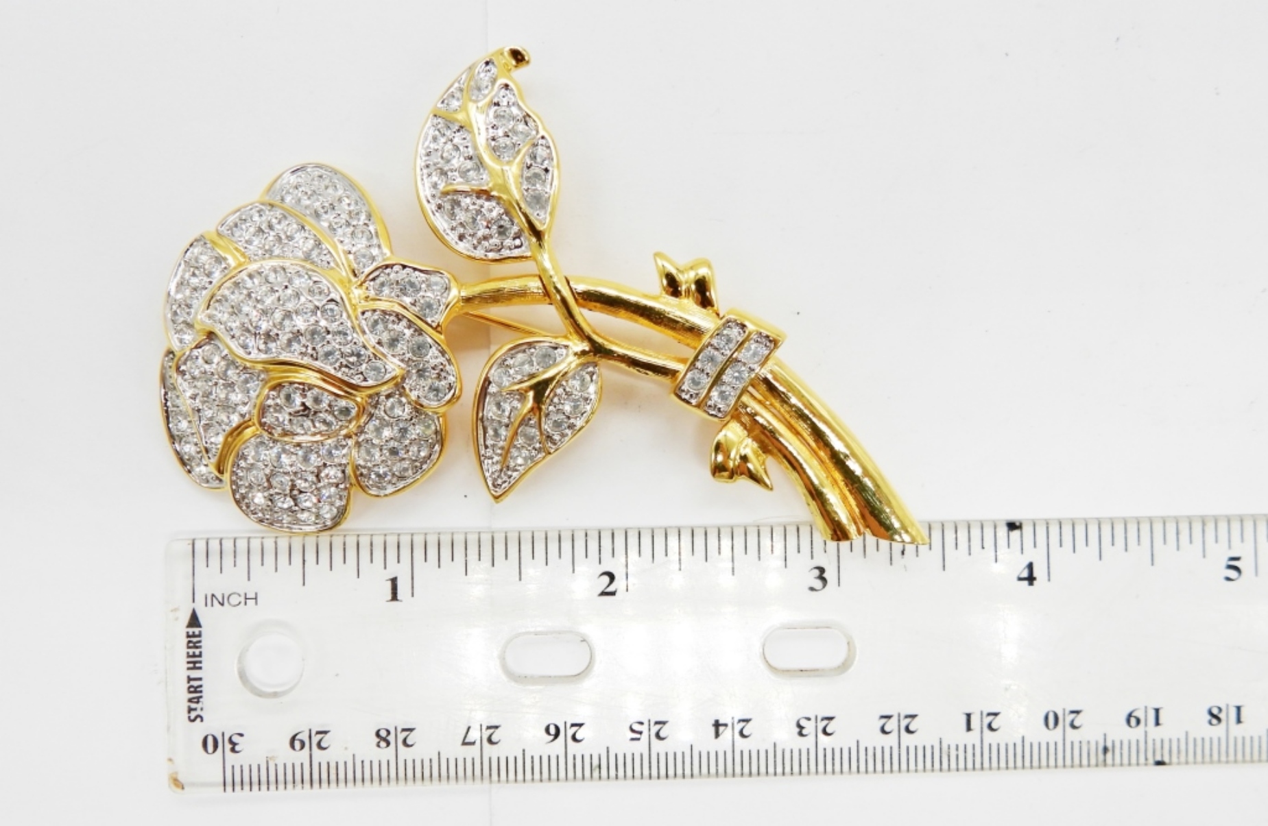 VINTAGE NOLAN MILLER PAVE CLEAR RHINESTONE LONG STEM ROSE PIN BROOCH, GOLD TONE. MARKED NOLAN MILLER