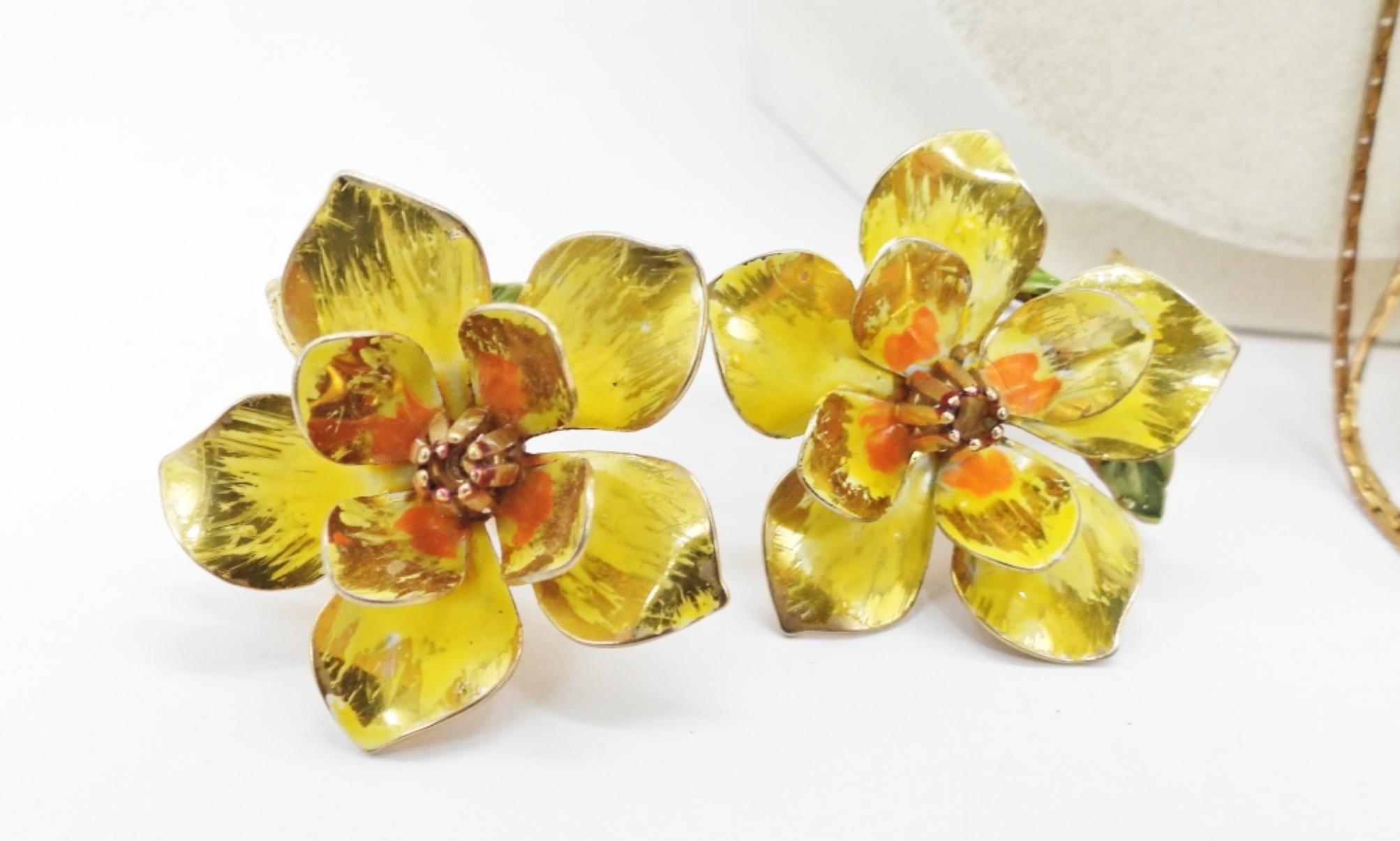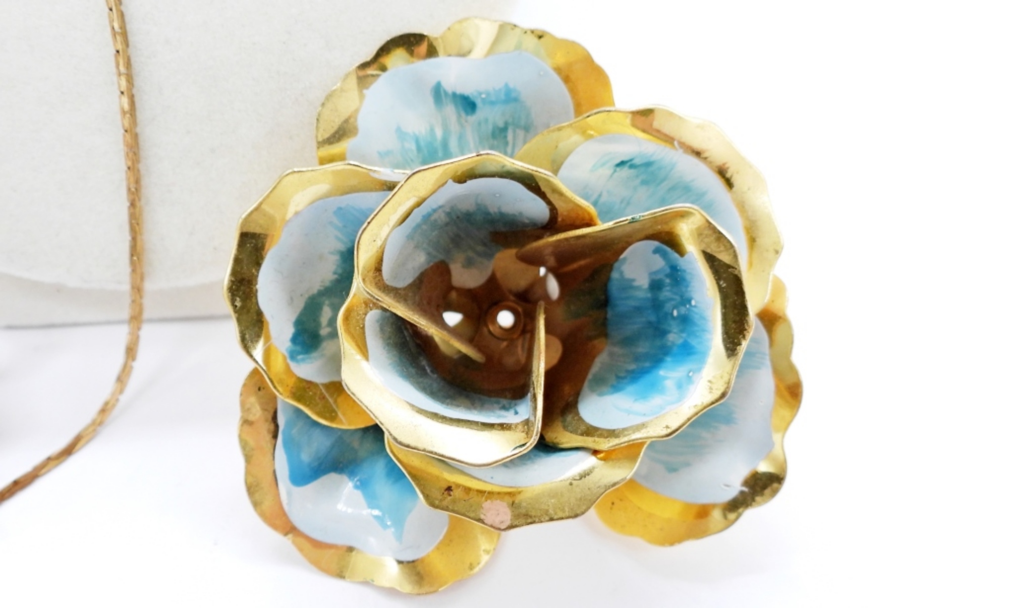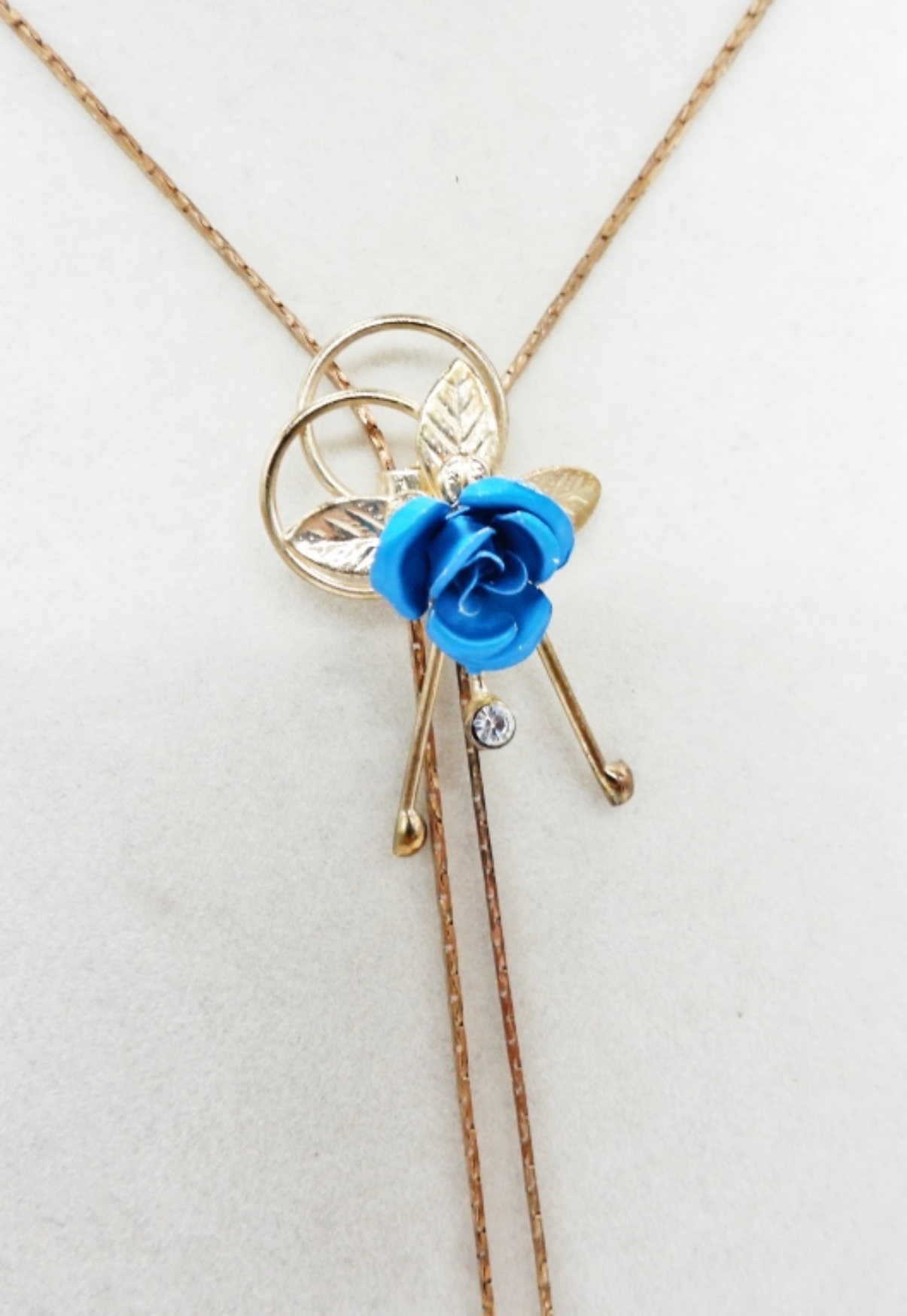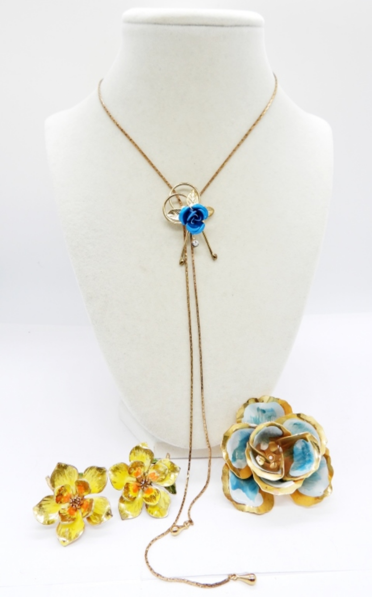 VINTAGE GOLD TONE BOLO STYLE NECKLACE, 30″ WITH BLUE FLOWER. BLUE AND GOLD TONE BROOCH, YELLOW AND GOLD TONE SCREW BACK EARRINGS.