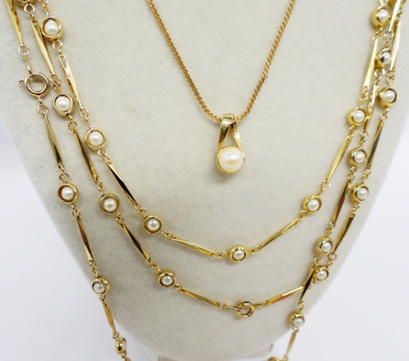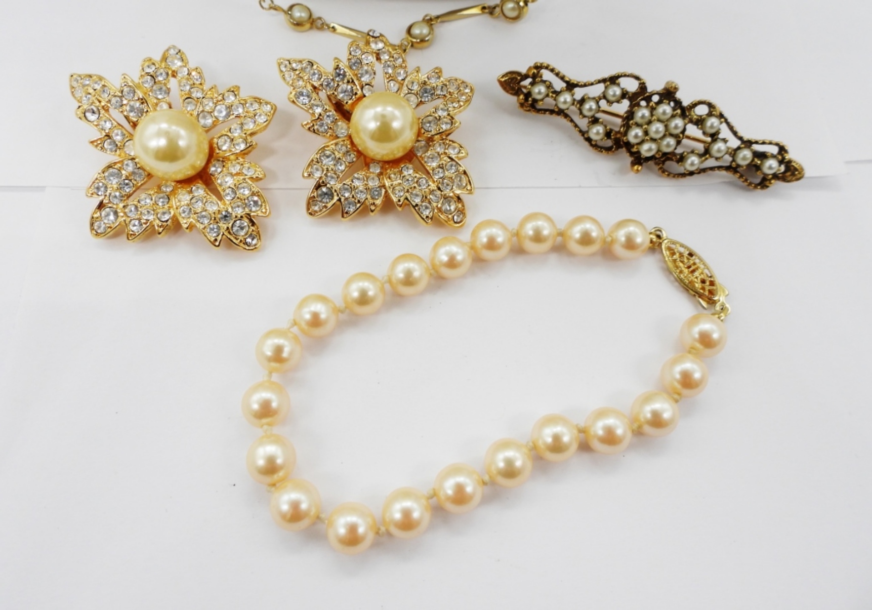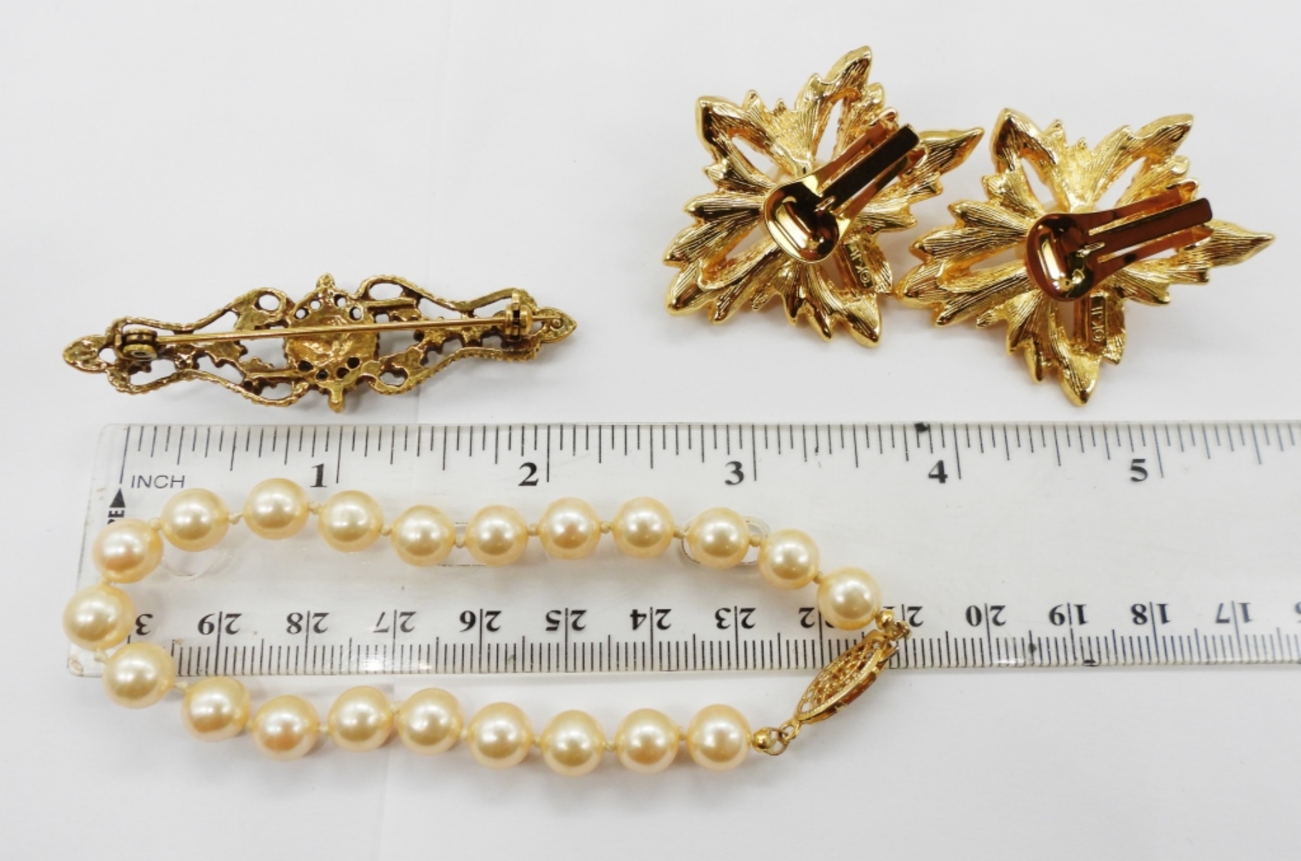 GOLD TONE FAUX PEARL NECKLACES ARE 48″, 28″, 16″. FAUX PEARL BRACELET IS 8″. EARRINGS MEASURE 2″x1″. BROOCH IS 2.5″.