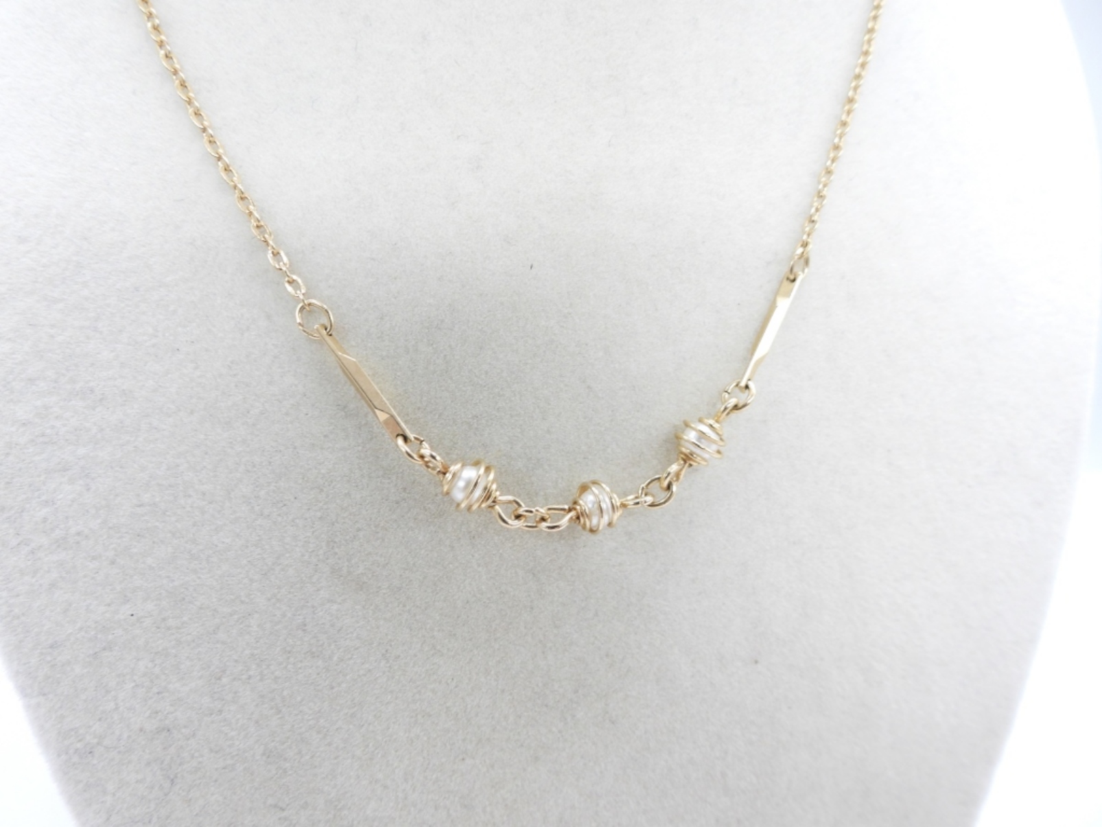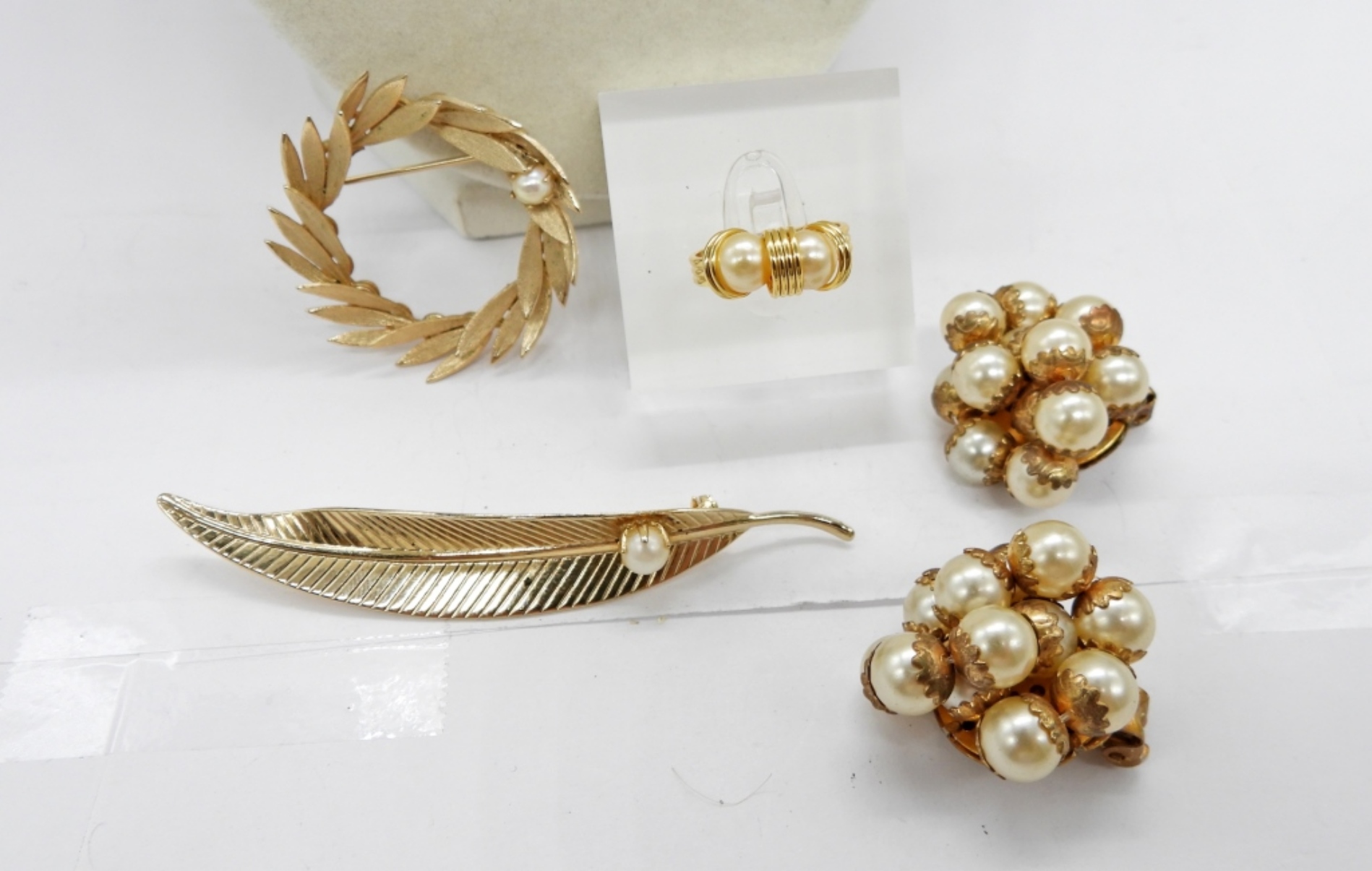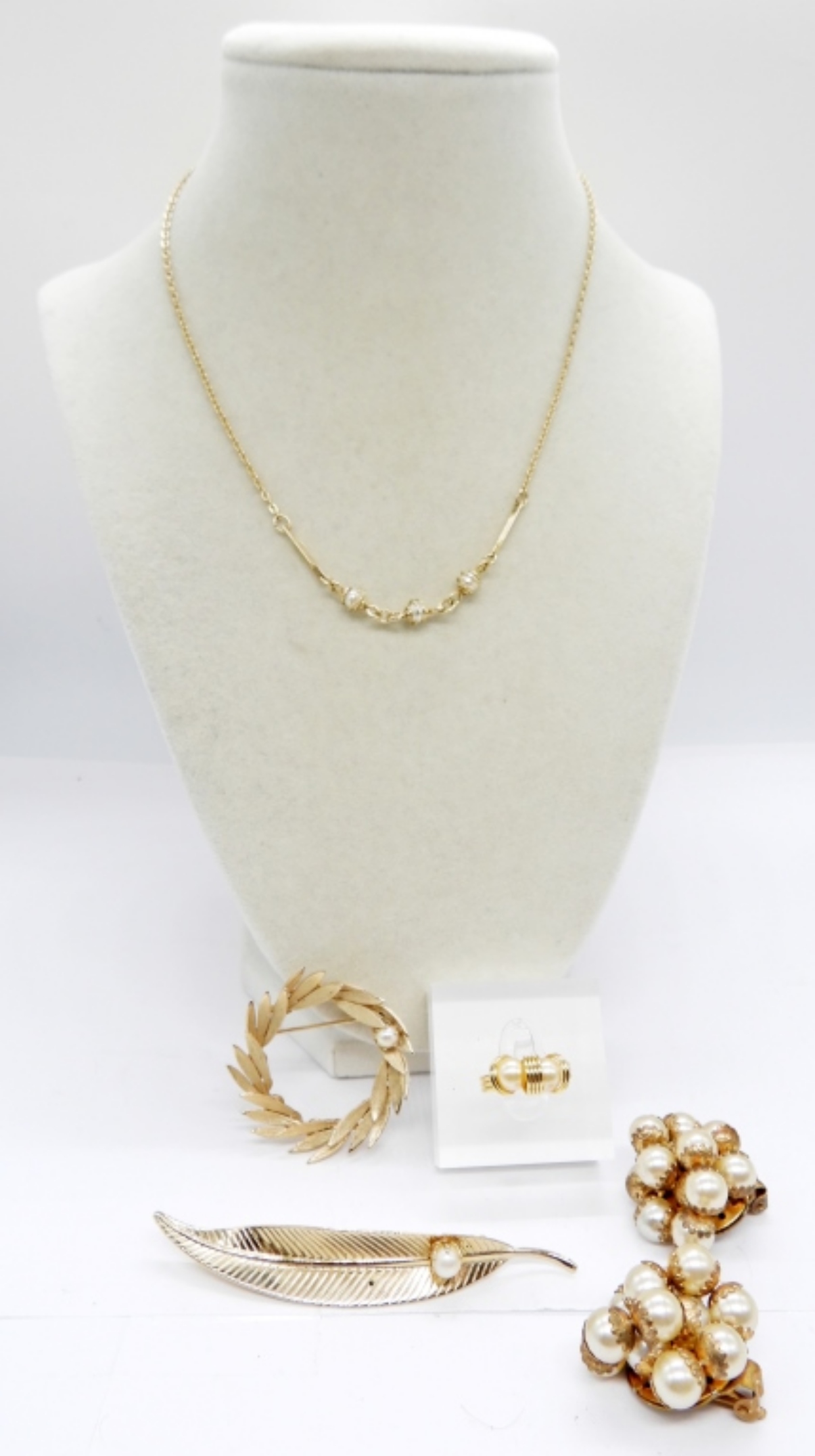 AVON GOLD TONE & PEARL NECKLACE, 16″. SIZE 5 ADJUSTABLE GOLD TONE DOUBLE PEARL RING. 2 GOLD TONE FAUX PEARL BROOCHES. GOLD TONE FAUX PEARL VINTAGE CLIP ON EARRINGS.