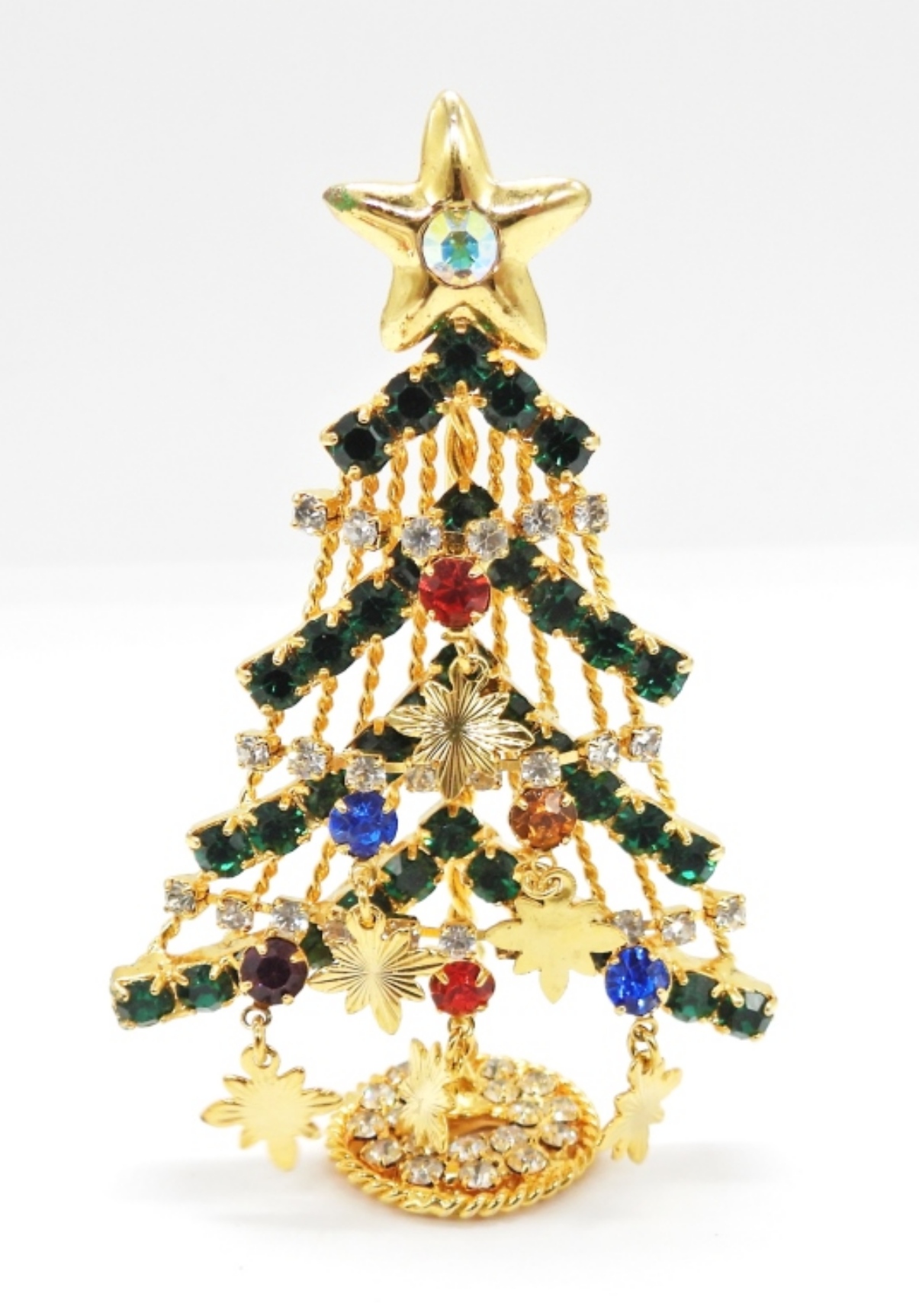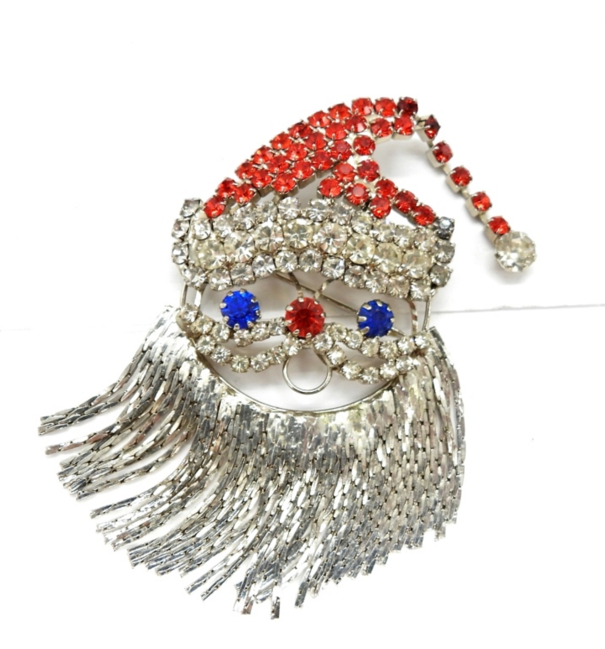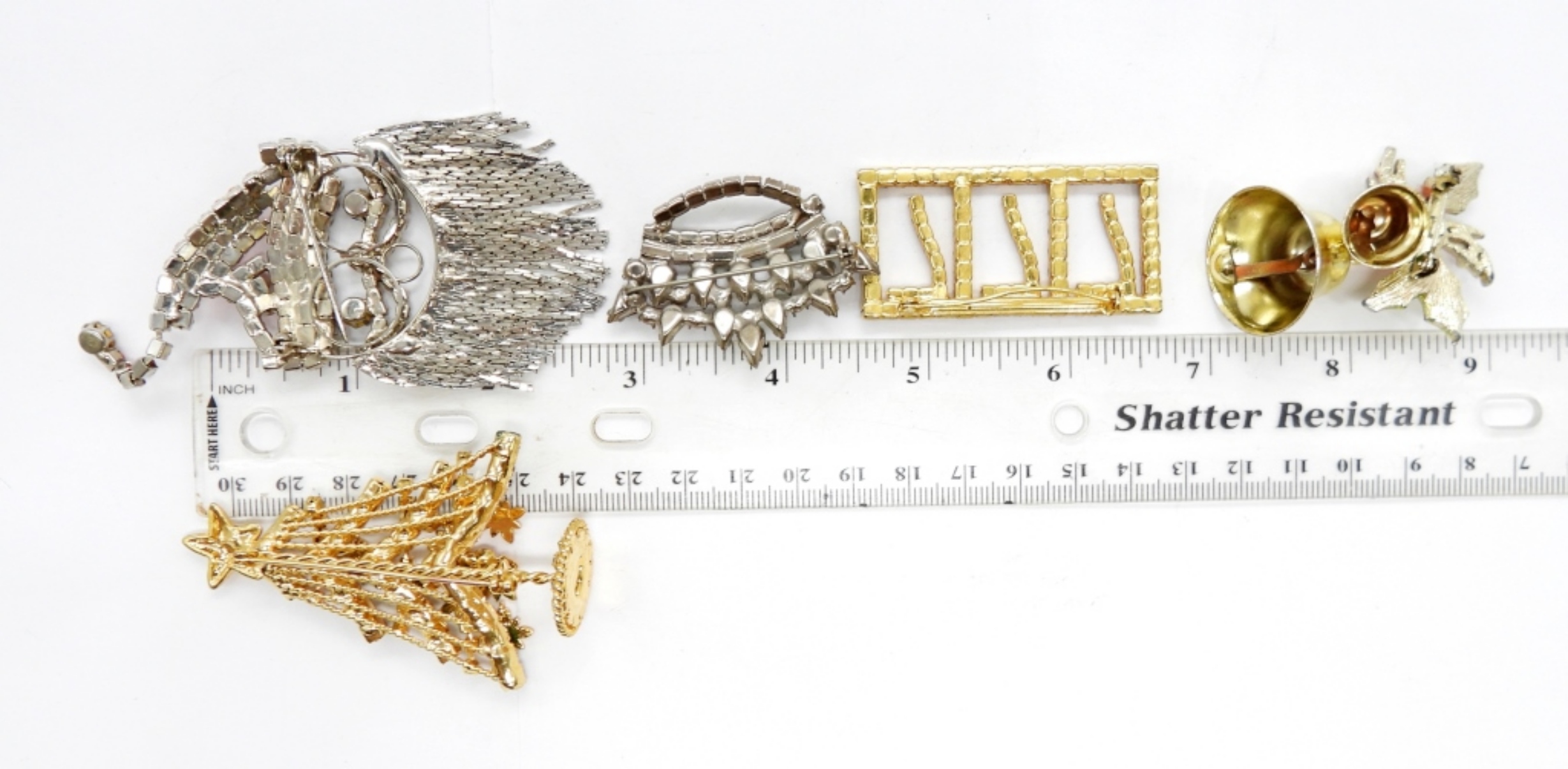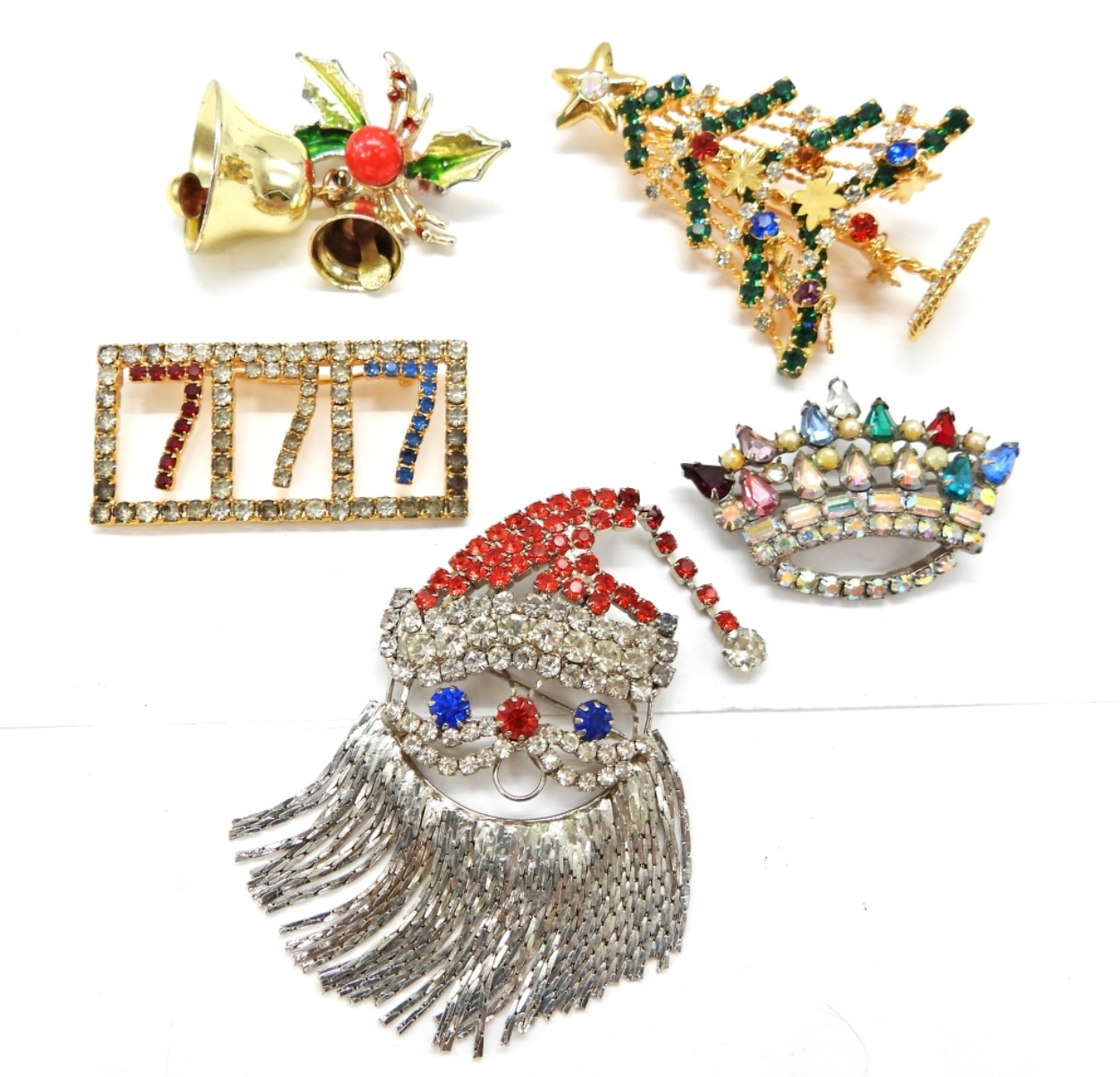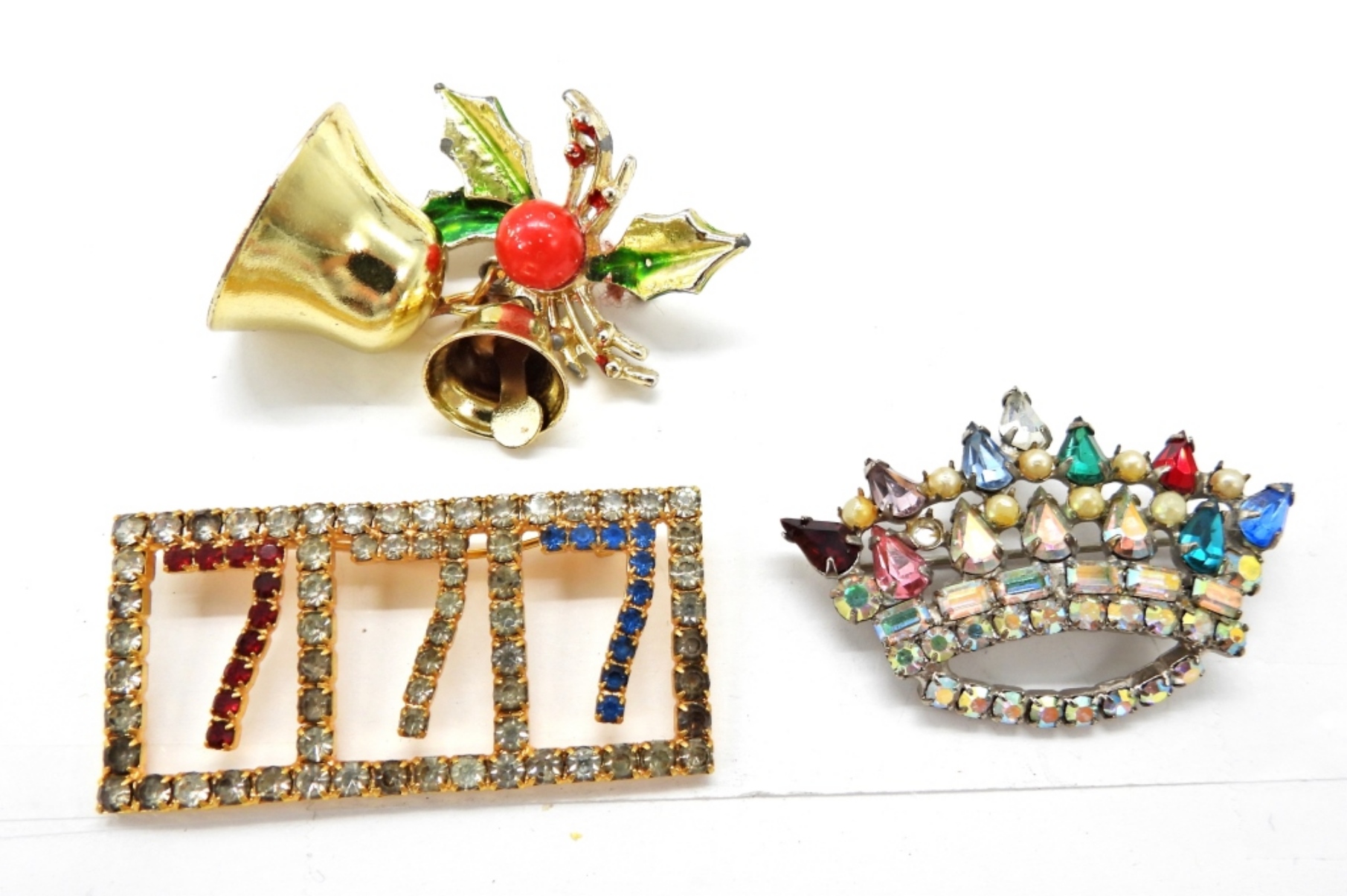 3 VINTAGE CHRISTMAS BROOCHES. SANTA, 3″x1.5″. TREE, 3″x2″. HOLLY & BELLS, 2.5×1.5″. VINTAGE CROWN, 2″x1.5″. VINTAGE 777 RHINESTONE BROOCH, 2″x1″.