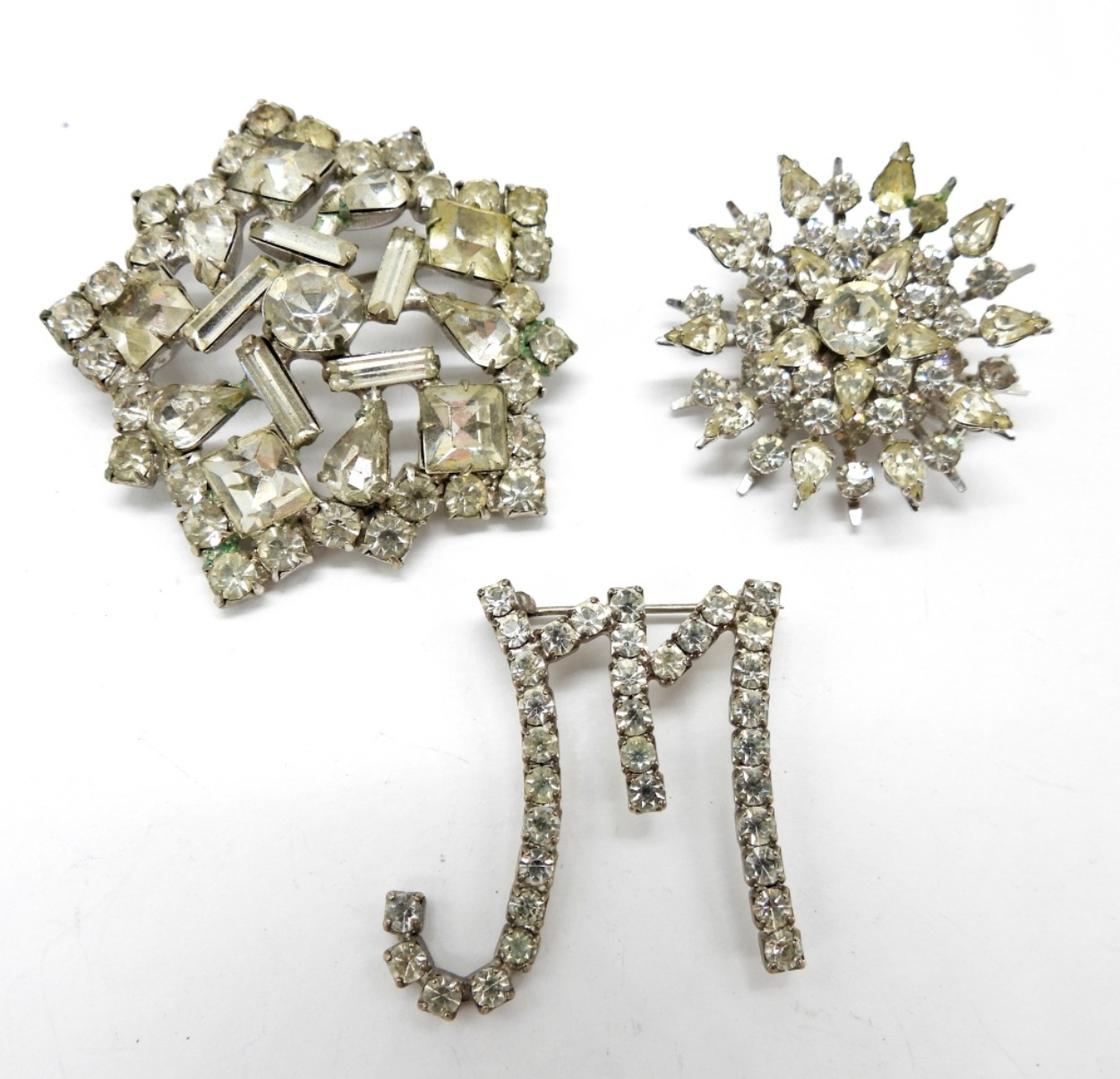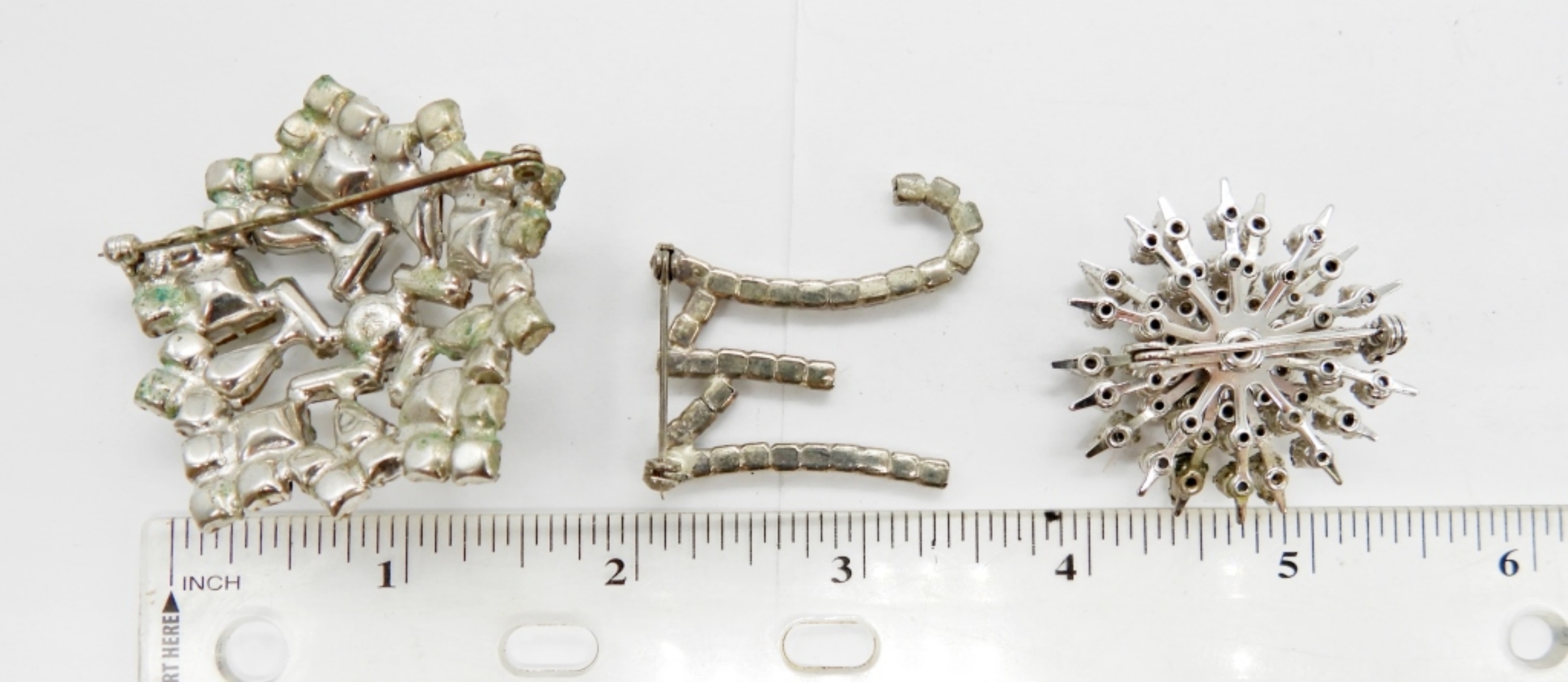 3 VINTAGE RHINESTONE BROOCHES. NO MISSING RHINESTONES! M MEASURES 1.5″x1.5″. STARBURST IS 1.5″x1.5″. LARGE ONE IS 2″.