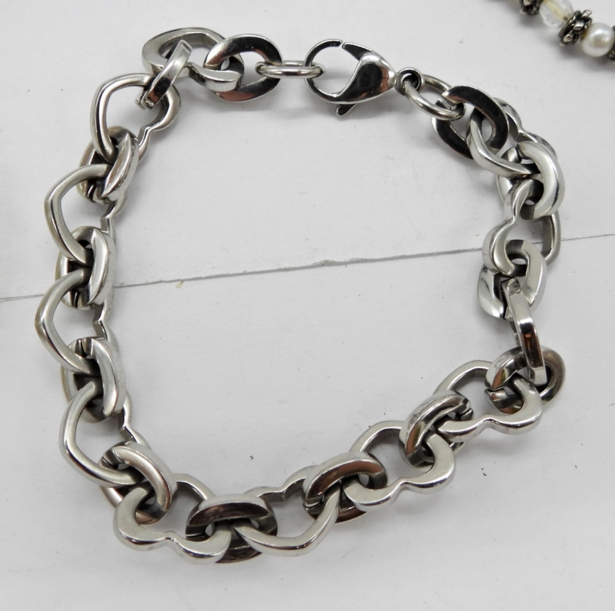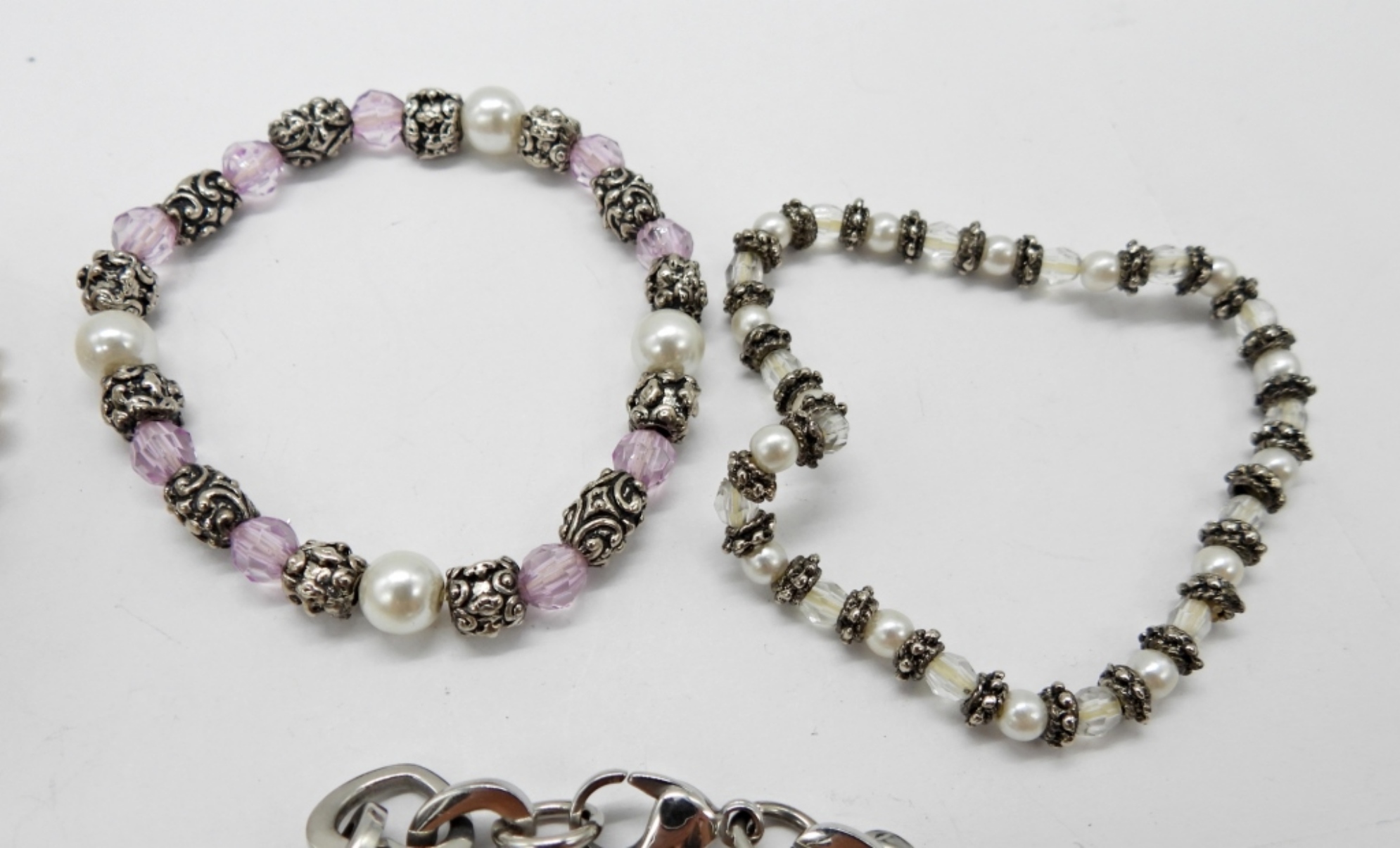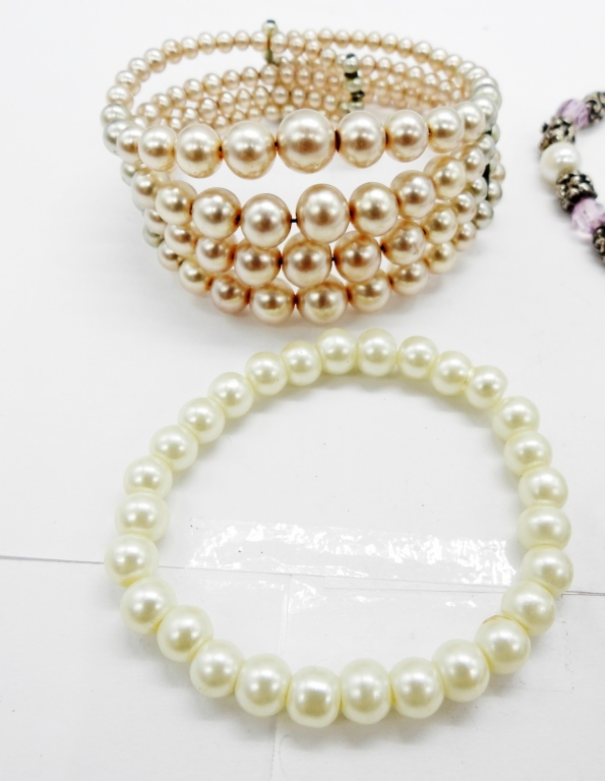 5 FASHION BRACELETS. 4 ARE FAUX PEARL STRETCHY OR ADJUSTABLE AND ONE SILVER TONE HEART LINK BRACELET, 7.5″.