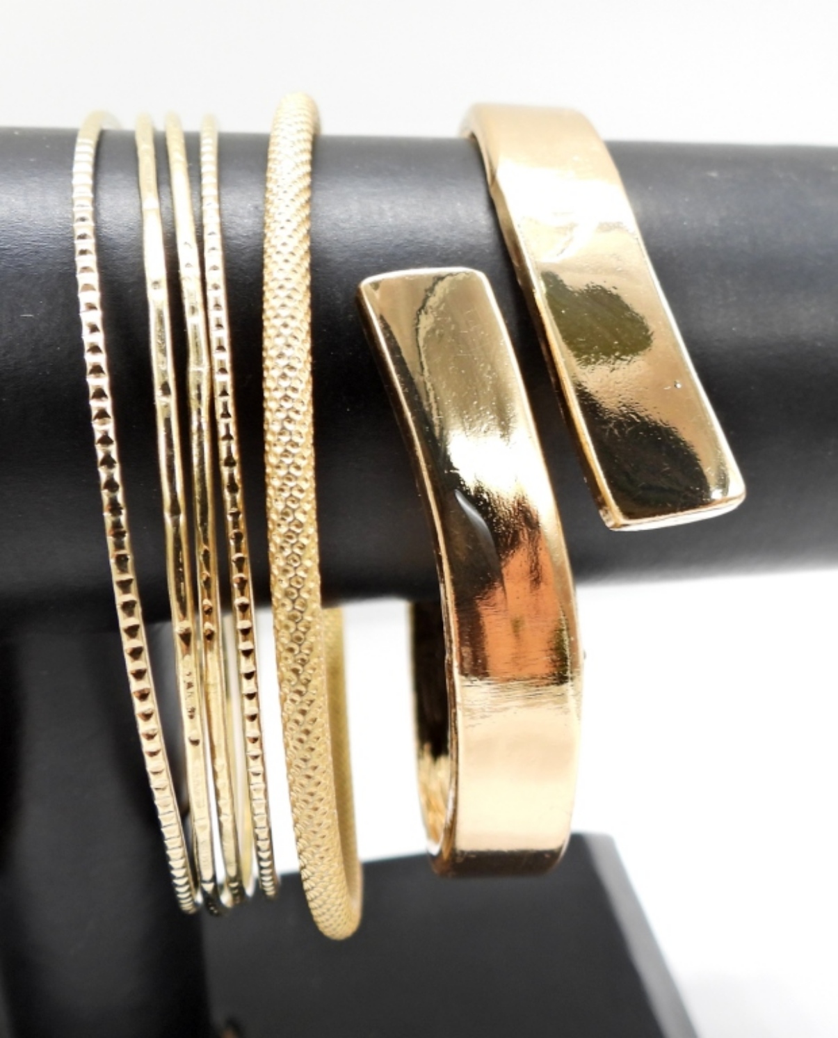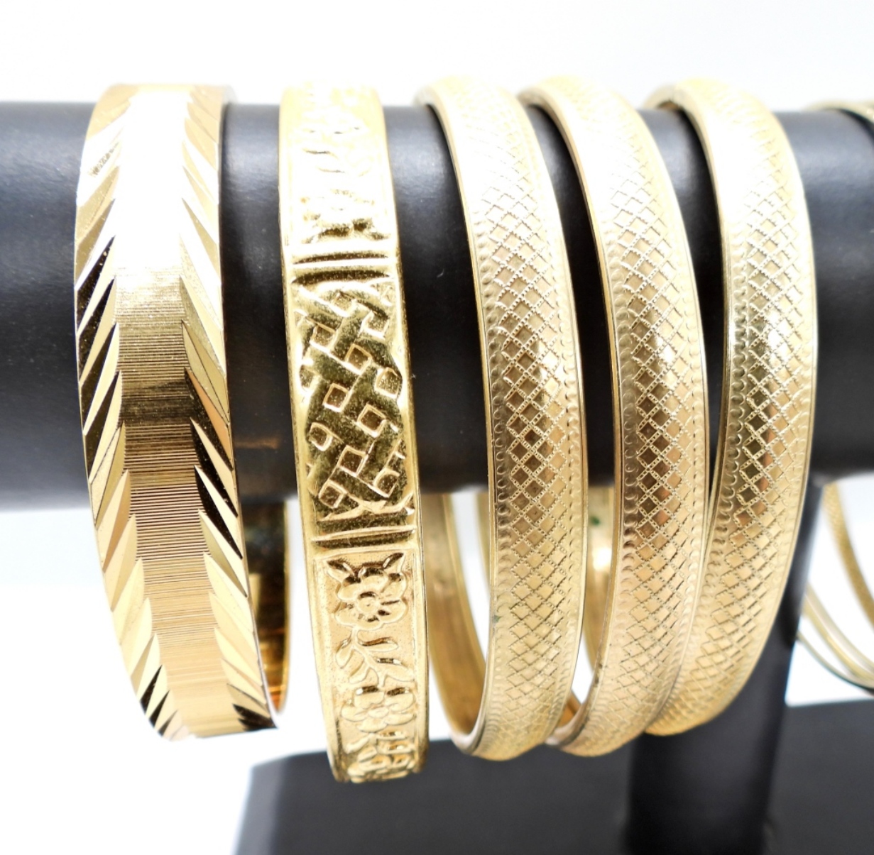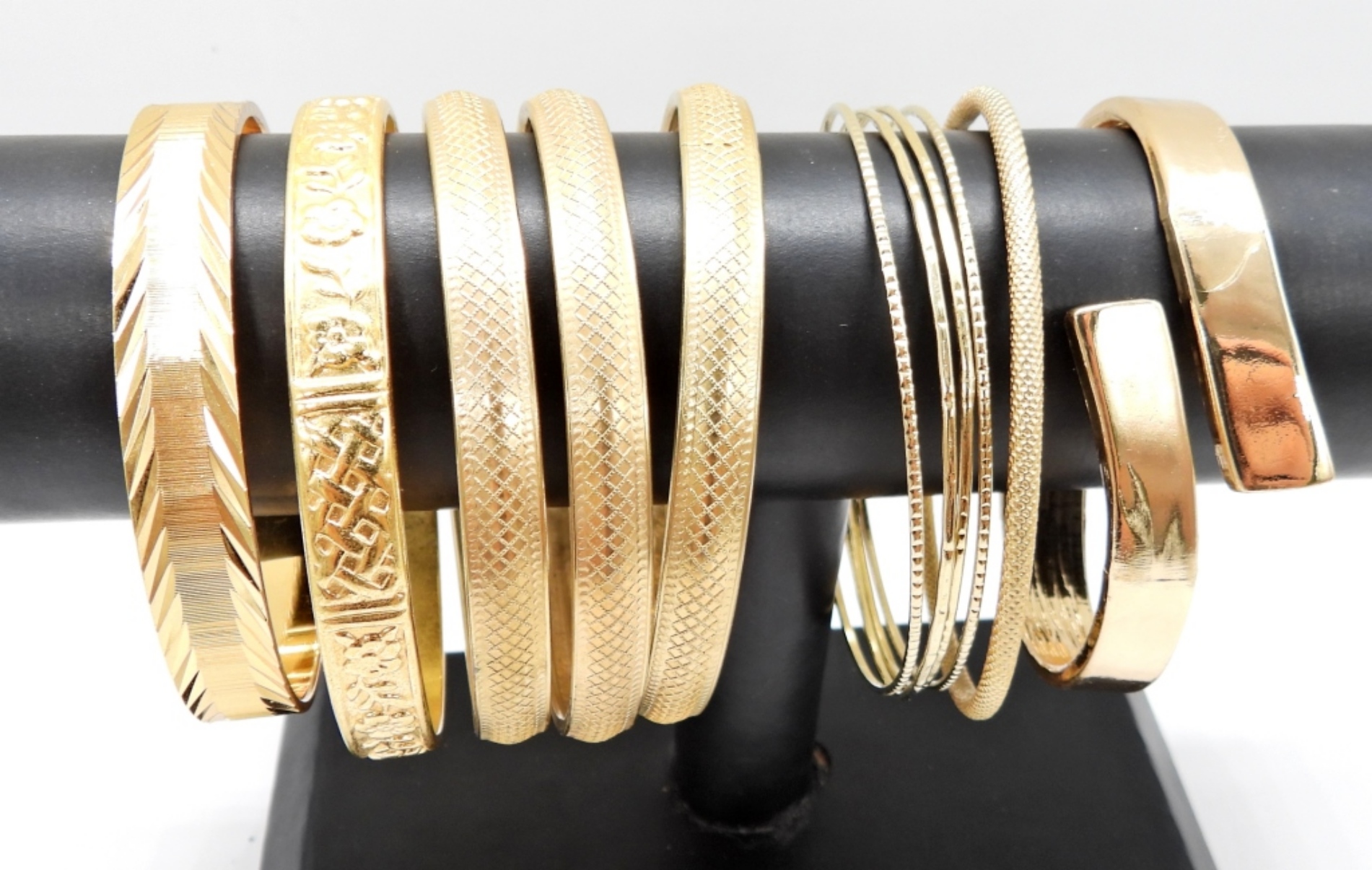 11 GOLD TONE BANGLE BRACELETS, ONE IS MONET.