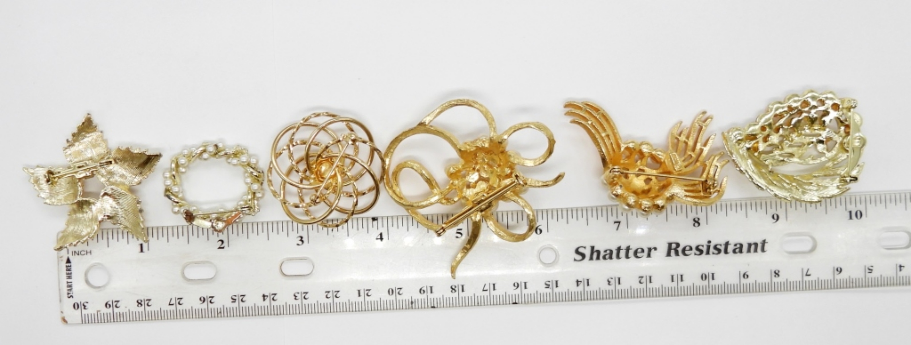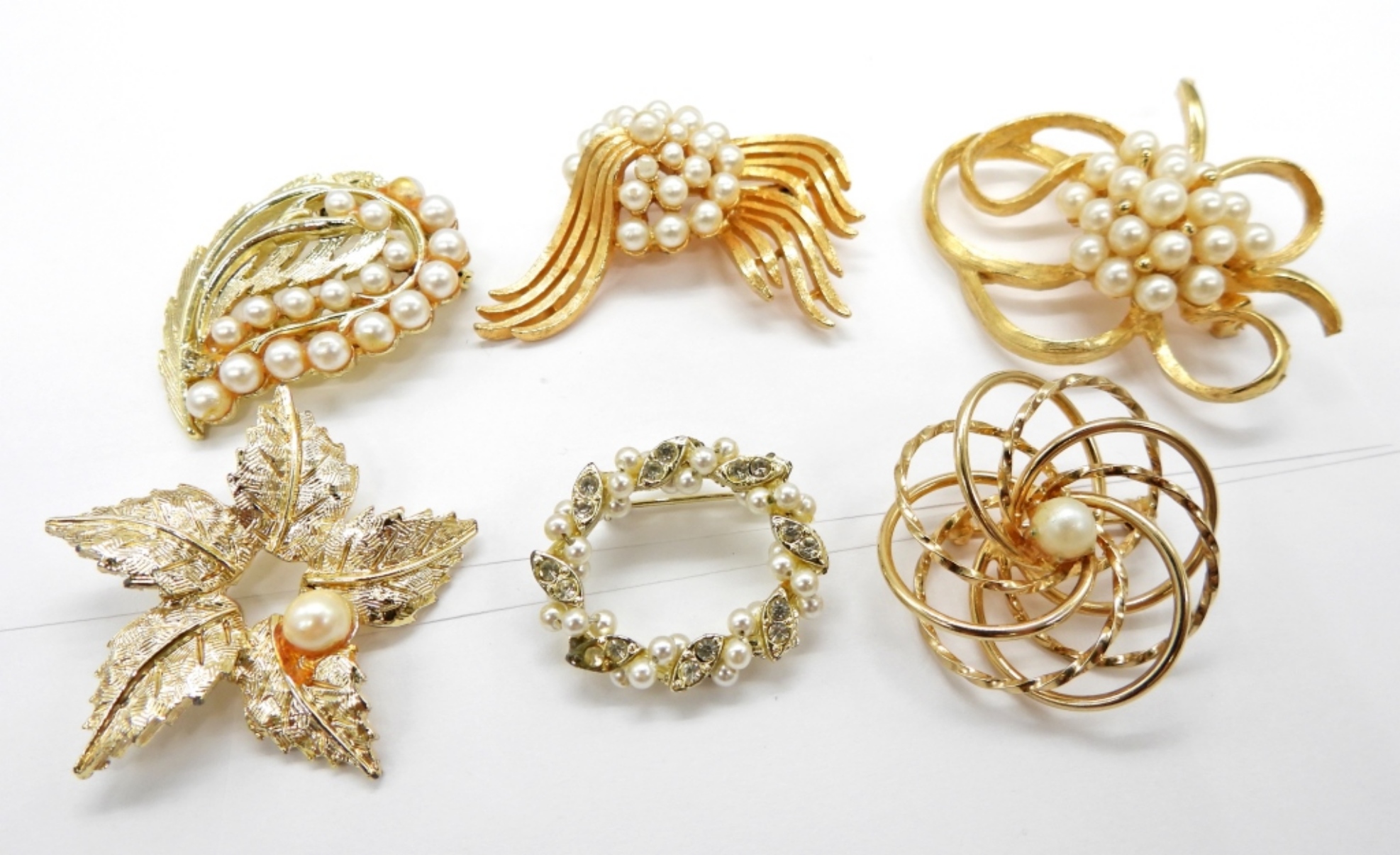 SIX VINTAGE GOLD TONE BROOCH/PINS WITH PEARLS.