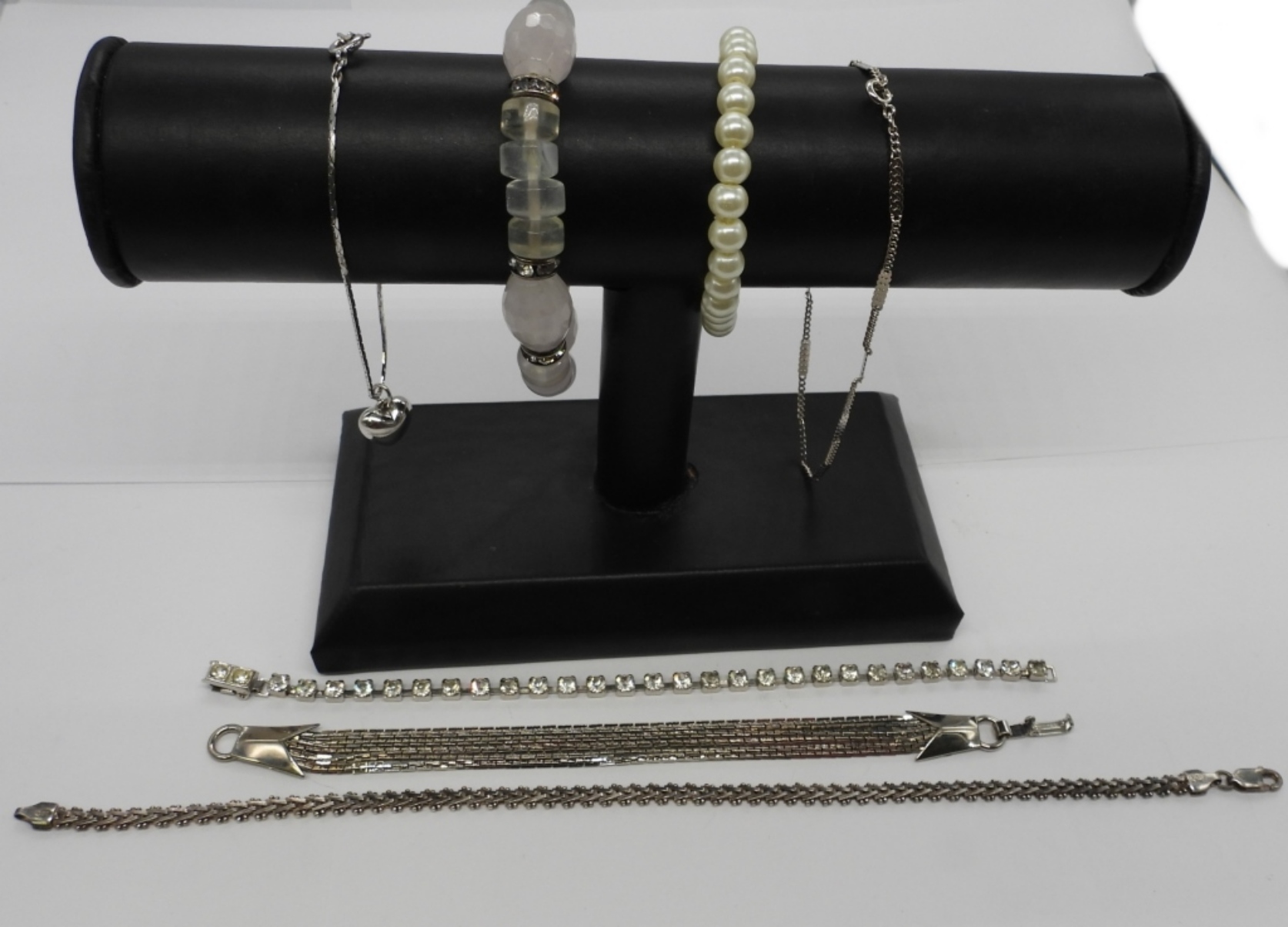 (1) QUARTZ (1) FAUX PEARL (1) RHINESTONE (4) SILVER TONE BRACELETS
