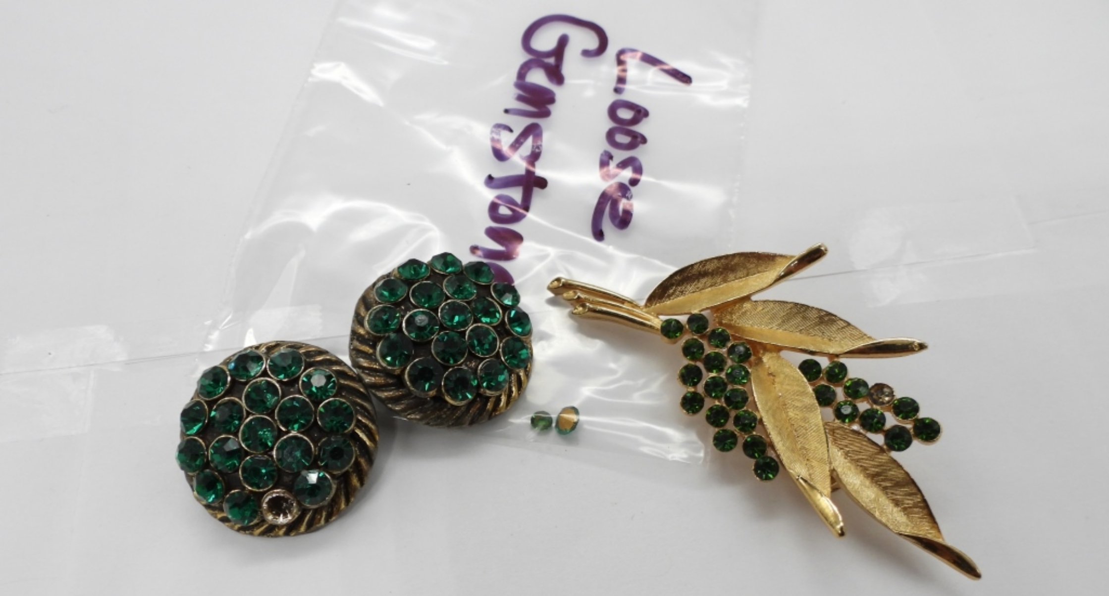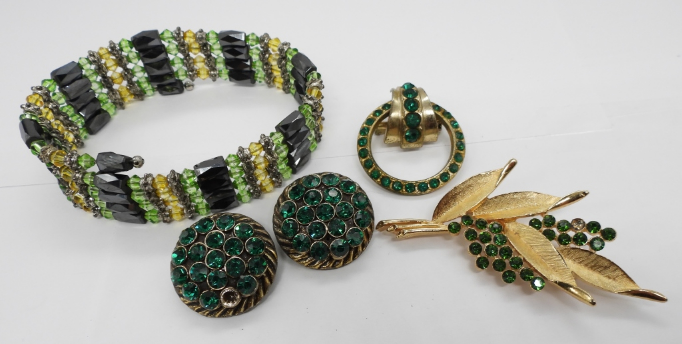 VINTAGE CORO GOLD TONE AND GREEN RHINESTONE BROOCH (MISSING STONE IS IN THE BAG). VINTAGE GREEN RHINESTONE CLIP ON EARRINGS (MISSING STONE IS IN THE BAG). VINTAGE CIRCLE BROOCH WITH GREEN GEMSTONES AND A BEADED HEMATITE