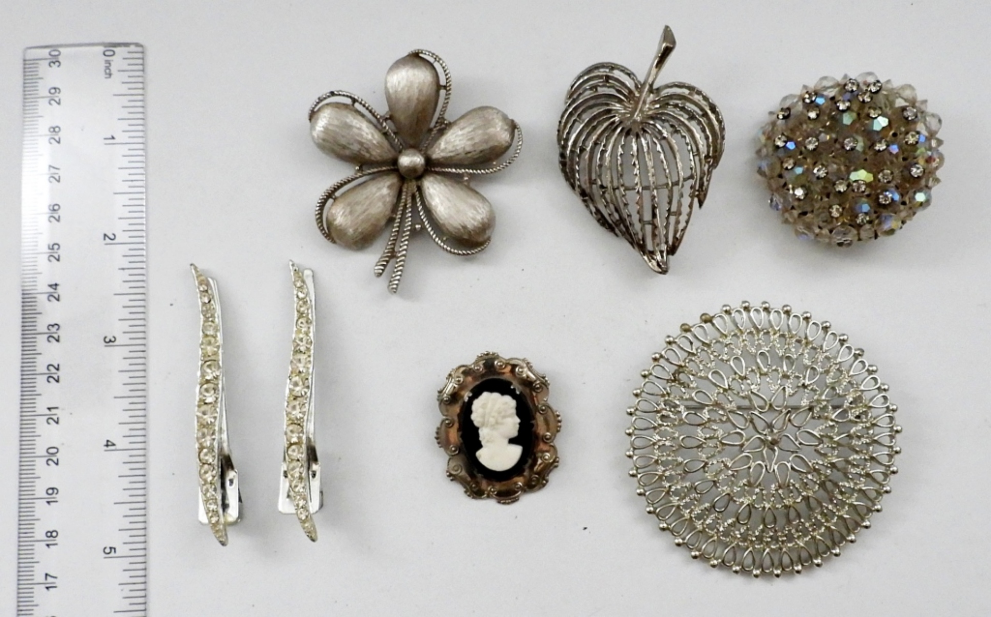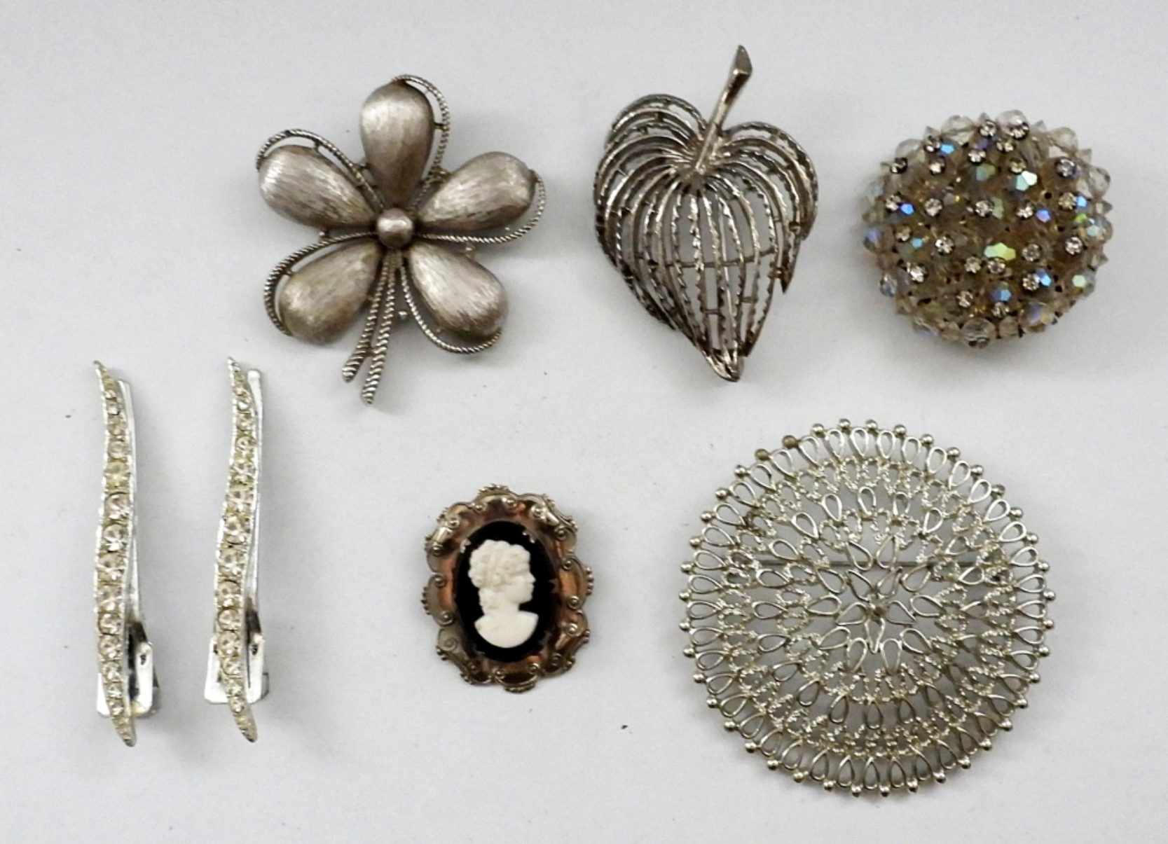 WITH CAMEO BROOCH, CLEAR GEMSTONES, SILVER TONE; HAIR CLIPS WITH RHINESTONES